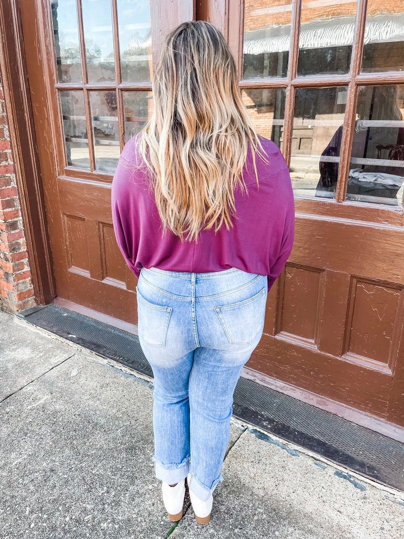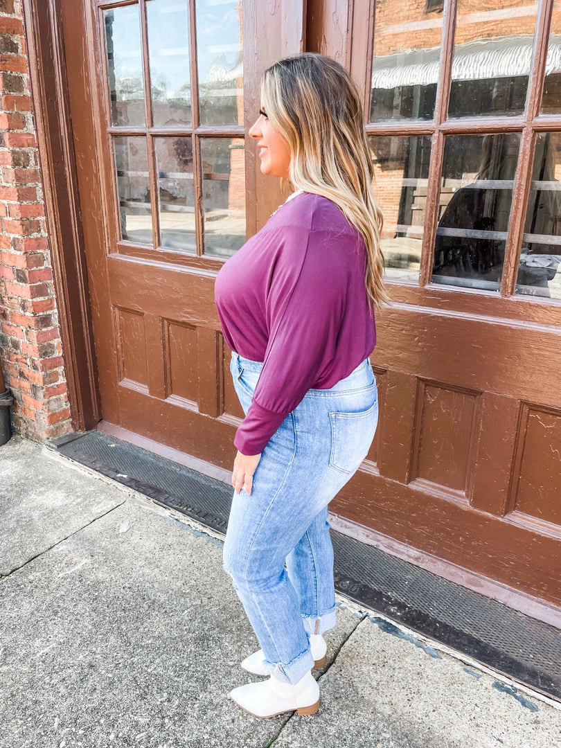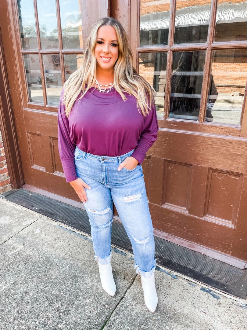 Chic purple for winter has arrived! The Austin Boatneck Dolman Sleeve Bodysuit is made of jersey knit soft material that is oh so comfy! Finishing with long sleeves and 2 snap button closure, this bodysuit will take care of you all day long! Styled with our Lellan High Rise Distressed Straight Leg Jeans.