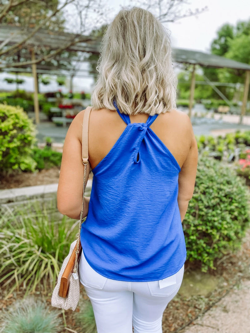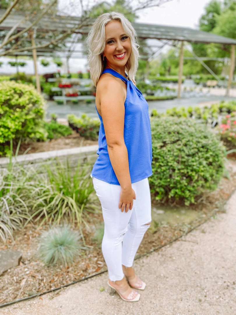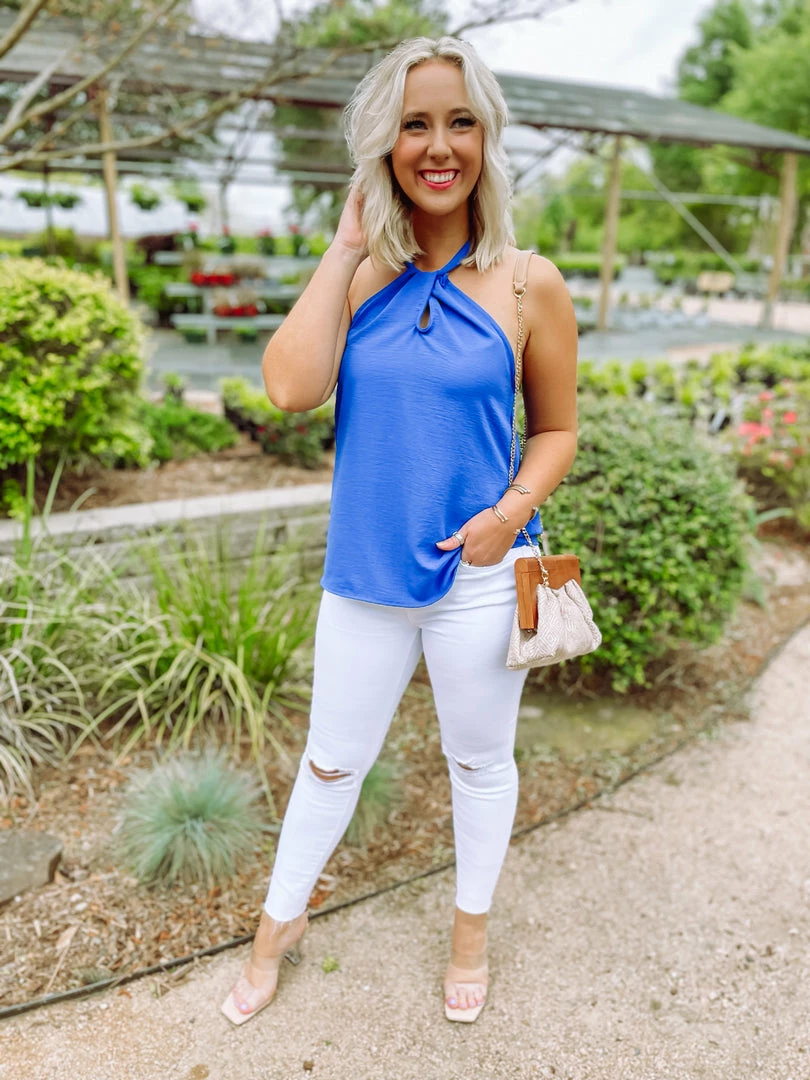 Meet our Wendy Criss Cross Halter Neck Top! This dressy item is full of fun! Tailored Solid, textured material makes this one a spring essential & so versatile! Designed as halter with cut out detailing and flowy silhouette. Styled with our Nicole Beige Diamond Crossbody, Charlie White Mid Rise Ankle Skinny Jeans and Clara Clear Heel Pumps.