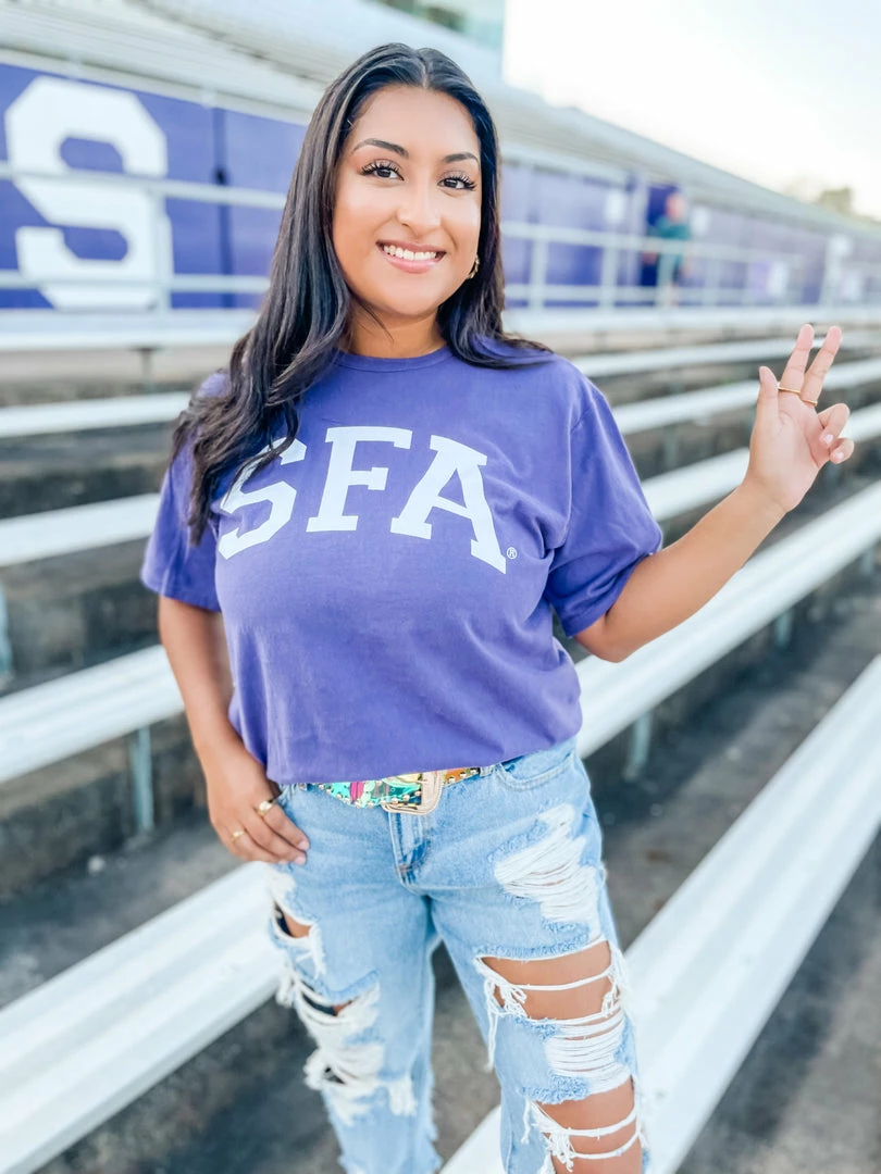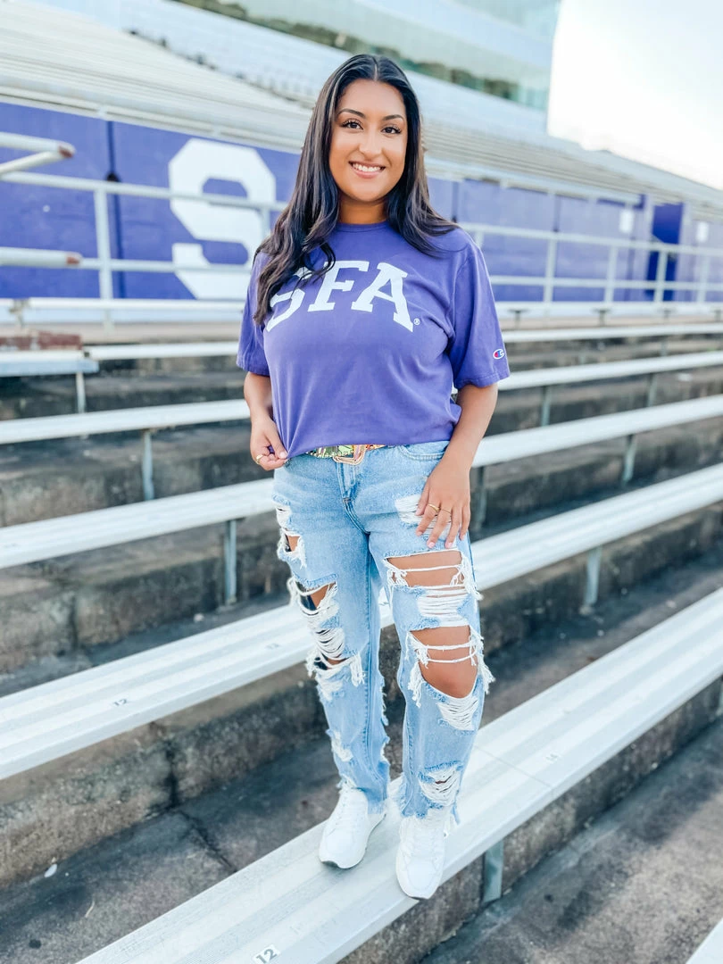 Who doesn’t love representing our favorite college “Stephen F. Austin” ?!?! The SFA Curved Tee features a purple base with a front graphic. Designed with a Champion tee which is every college kid’s favorite!