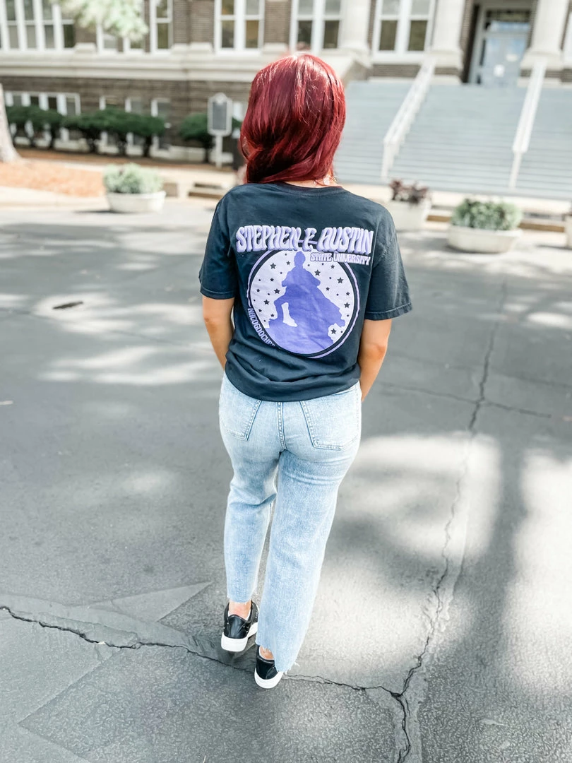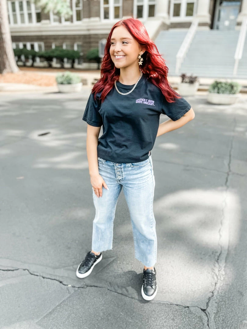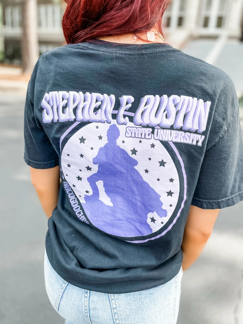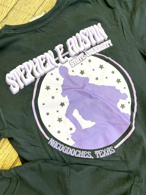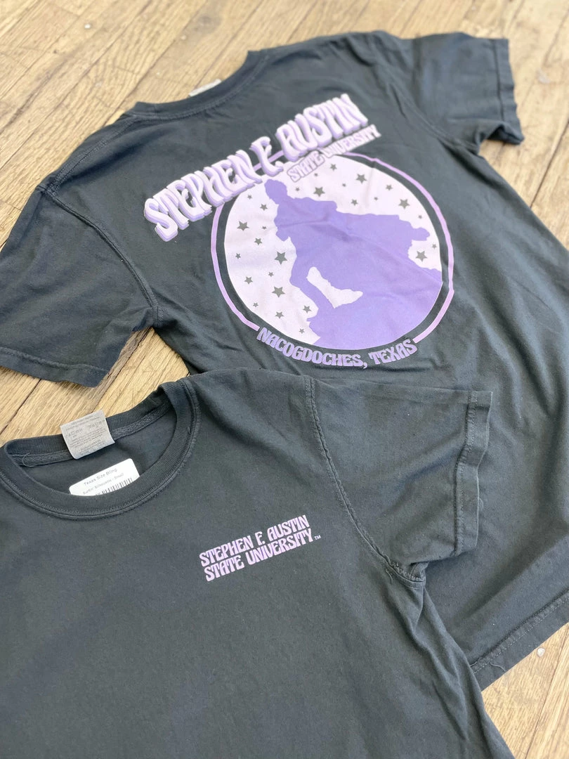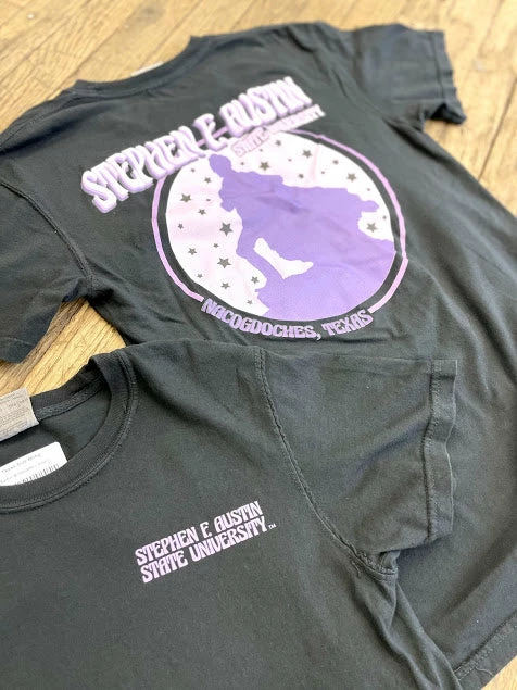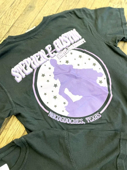 Lumberjacks will always have our hearts, BUT so does this new tee! We love a front and back designed top! Featured on a Comfort Colors Top is our purple Stephen F Austin Design ~ Perfect for back to school and welcoming any new Jacks to Nac!