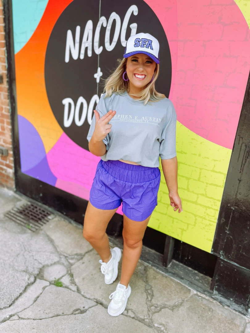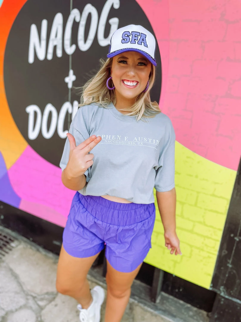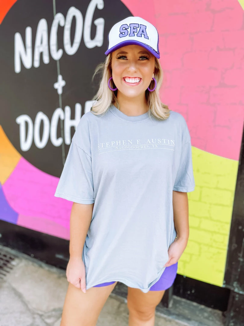 Who doesn’t love representing our favorite college “Stephen F Austin” ?!?! The Simple Stephen F. Austin -Granite Tee features a grey base with a front graphic. Designed with a comfort colors tee which is every college kid’s favorite! Styled with the SFA Trucker Hat + the Evie Sneakers.