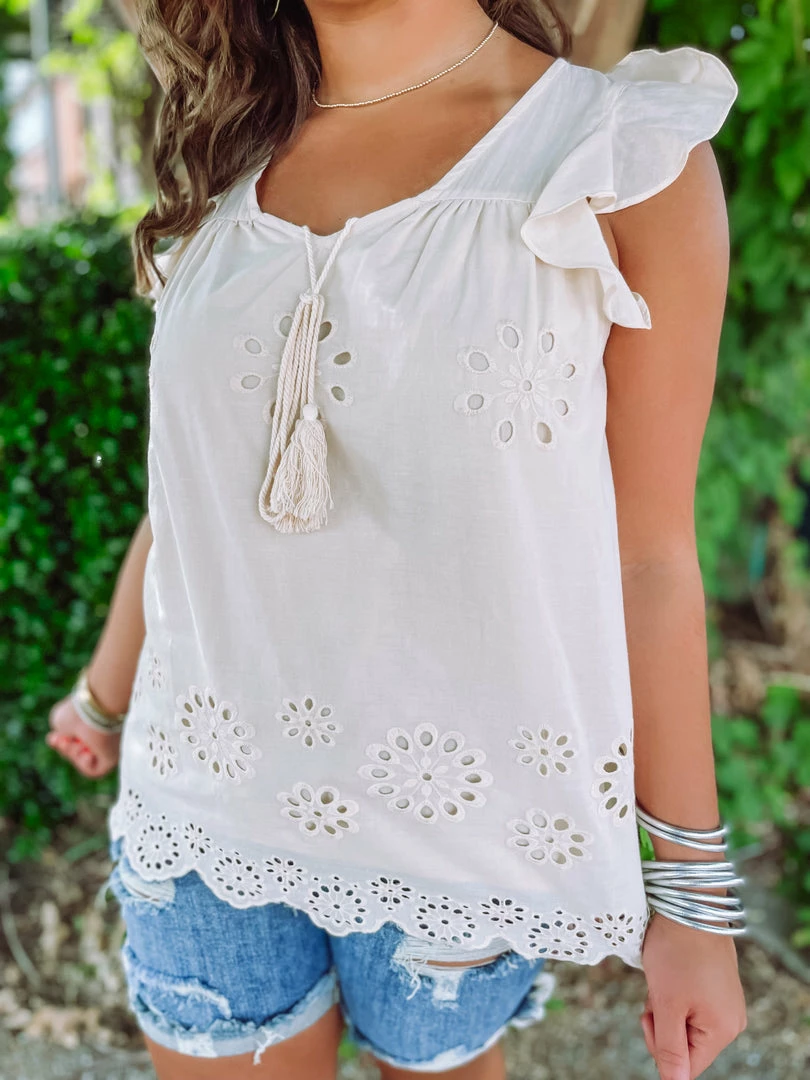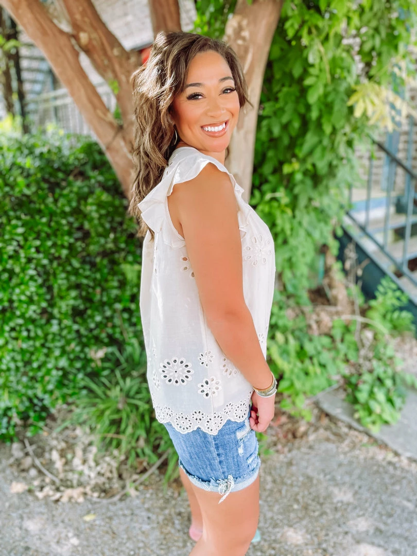 Get that sweet summer style in the Alivia Blouse! Tailored with a v neck line + flutter sleeves + tie feature + eyelet design + scalloped hem. This fully lined top is truly one of a kind! Spoil yourself today so you can steal Morgan’s style! Perfectly paired with the Cali Mid Thigh Shorts + Sydney Glitter Hoops + Tweet Sandals.