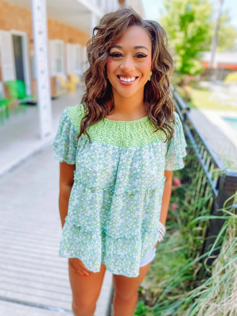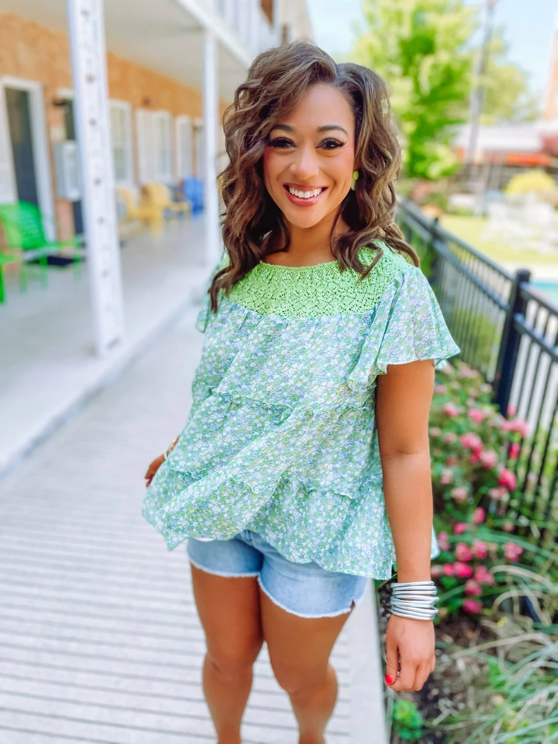 We love a femme blouse with tons of character! Our Brooke Lace Floral Loose Top brings you a curved lace neckline + short sleeves + tiered silhouette! Finishing ini a green, blue and white color palette, this darling top is one to turn heads! Styled with our Lucy Basic Cut Off Mid Rise Shorts and Ball Twist Sandals.