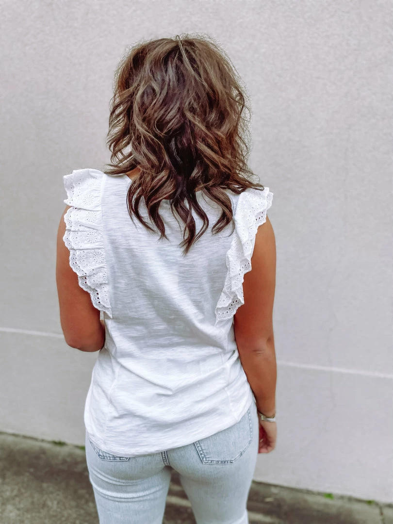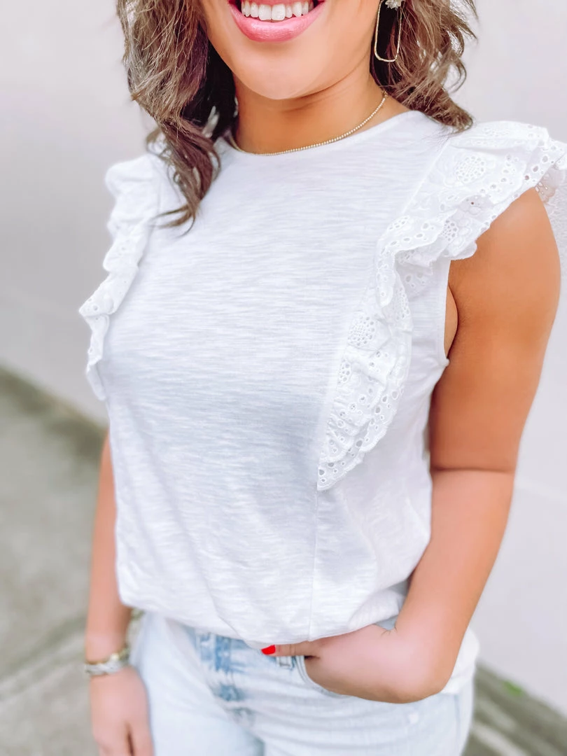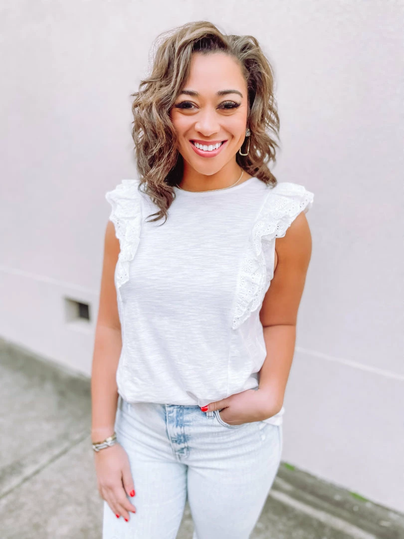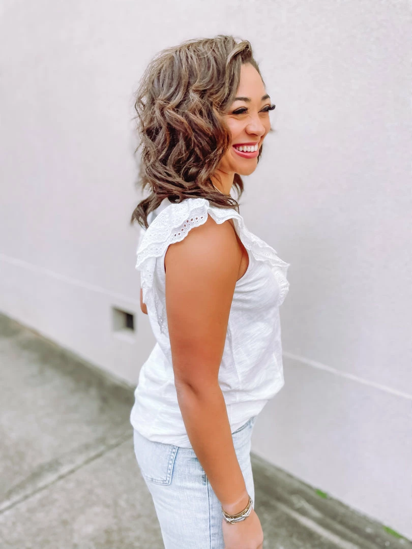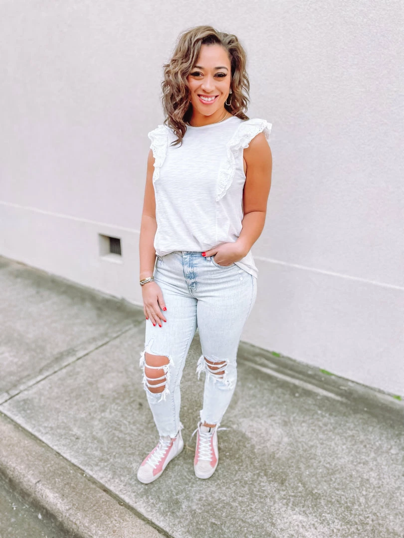 Eyelet Anyone?! Our Miriam Top is the perfect for work, play, vacay, mom’s day out. . . . Basically this top has you covered for it all!! With the layered eyelet detail + curved neckline + loose silhouette! A simple yet stunning piece! Steal Morgan’s Style! ~ Perfectly paired with our Tobi Mom Jeans and Roxanne Sneakers.