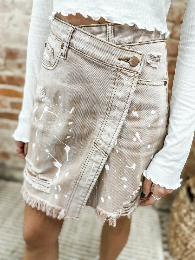 Meet the Perla Skirt! Femme & edgy goodness in a glorious mauve skirt! Tailored with an asymmetrical button fly + distressing + splatter detailing! A statement piece that will enhance your closet guaranteed! Styled with our Elena Hightop Sneakers and Tessa Cropped Crew Neck Long Sleeve Top.