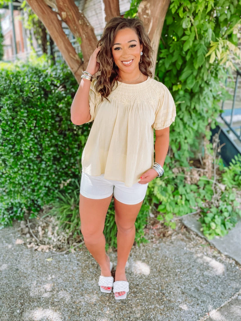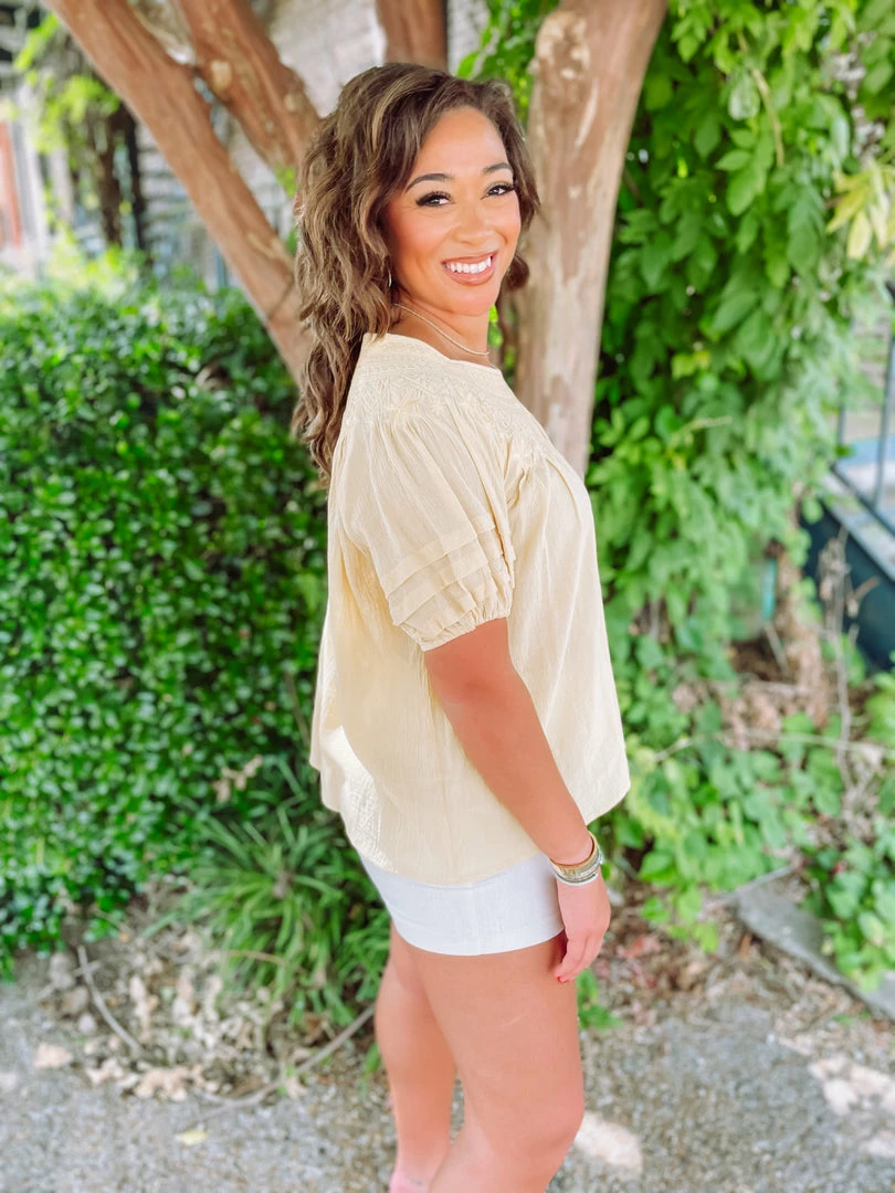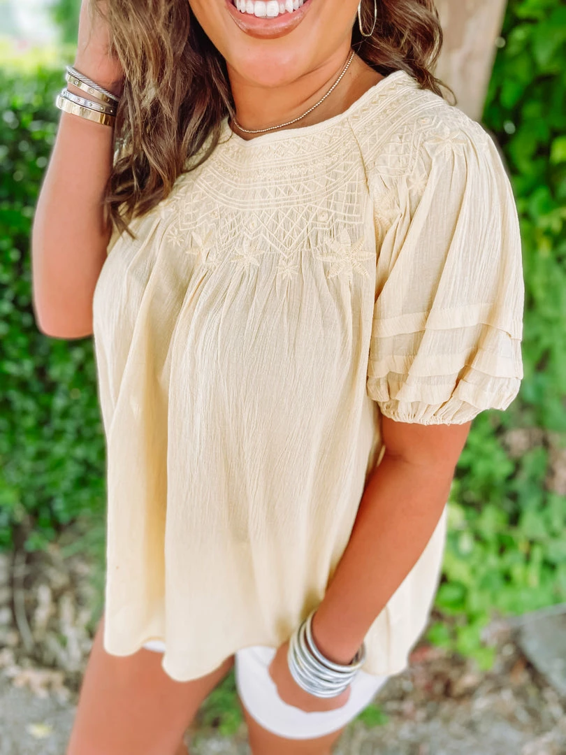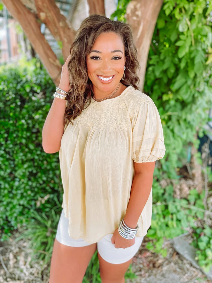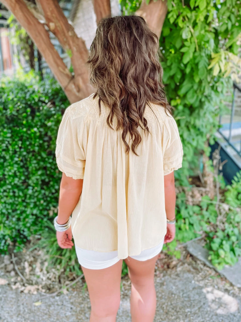 Be good, do good, look good in the Jill Top! Tailored with a round neck line + balloon sleeve + button/keyhole feature + embroidery detailing. This sweet blouse is giving us all the feels! Easily dressed up or down to fit your every need! Styled with the Victoria Paper Bag Shorts+ Apron Sandals + Sydney Glitter Hoops.