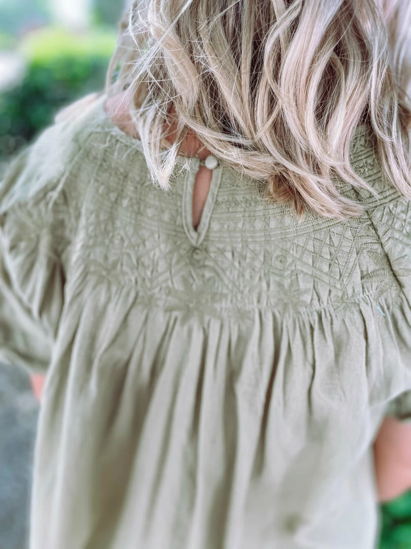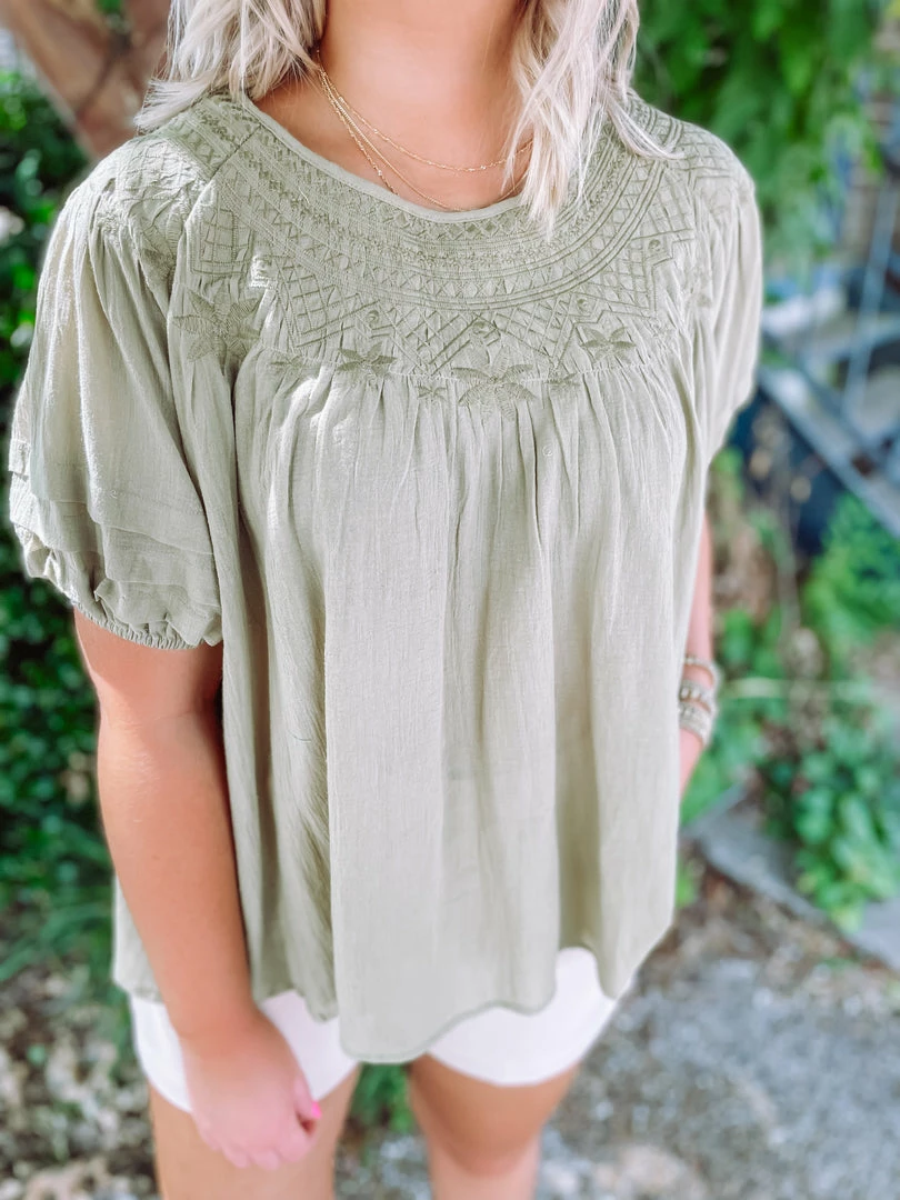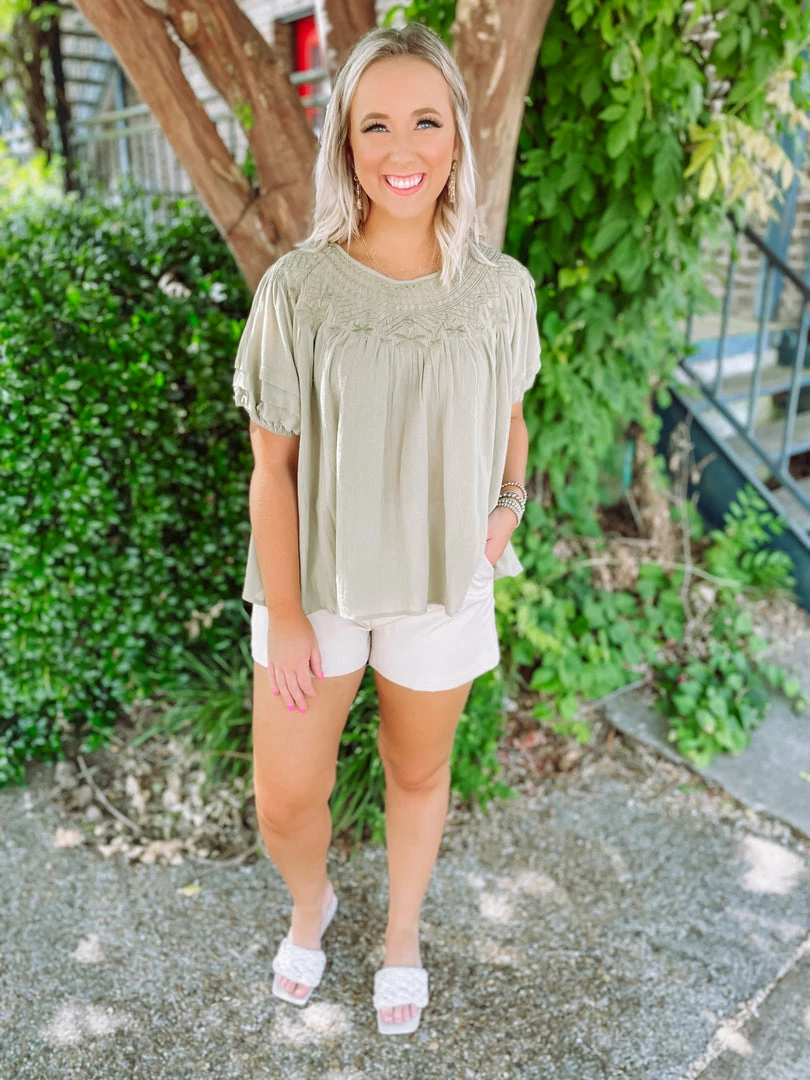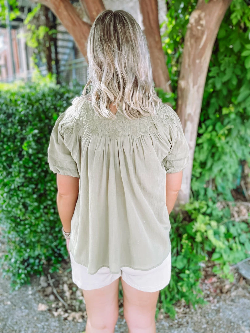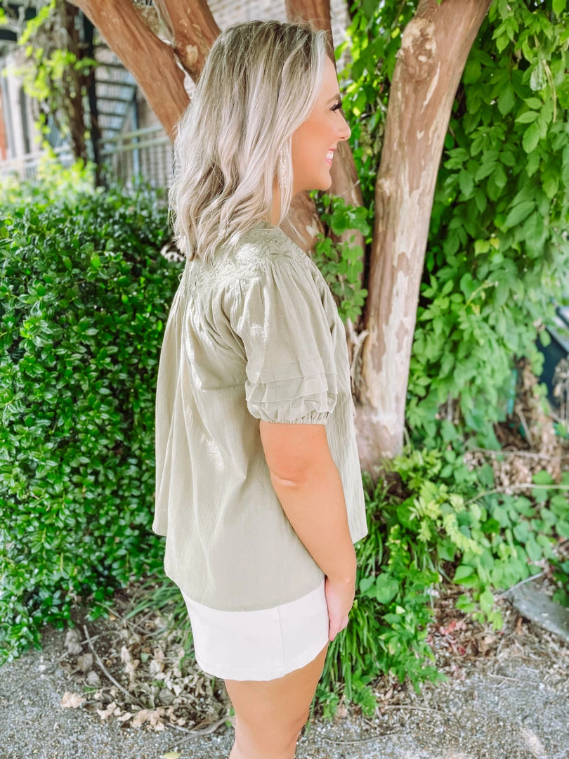 Be good, do good, look good in the Jill Top! Tailored with a round neck line + balloon sleeve + button/keyhole feature + embroidery detailing. This sweet blouse is giving us all the feels! Easily dressed up or down to fit your every need! Styled with the Raya Front Pocket Shorts + Apron Sandals + Rectangle Dangle Earrings.