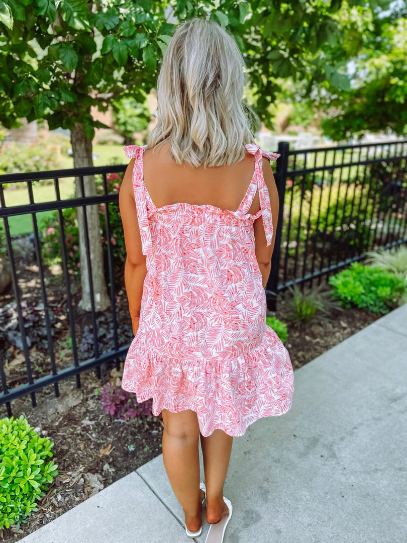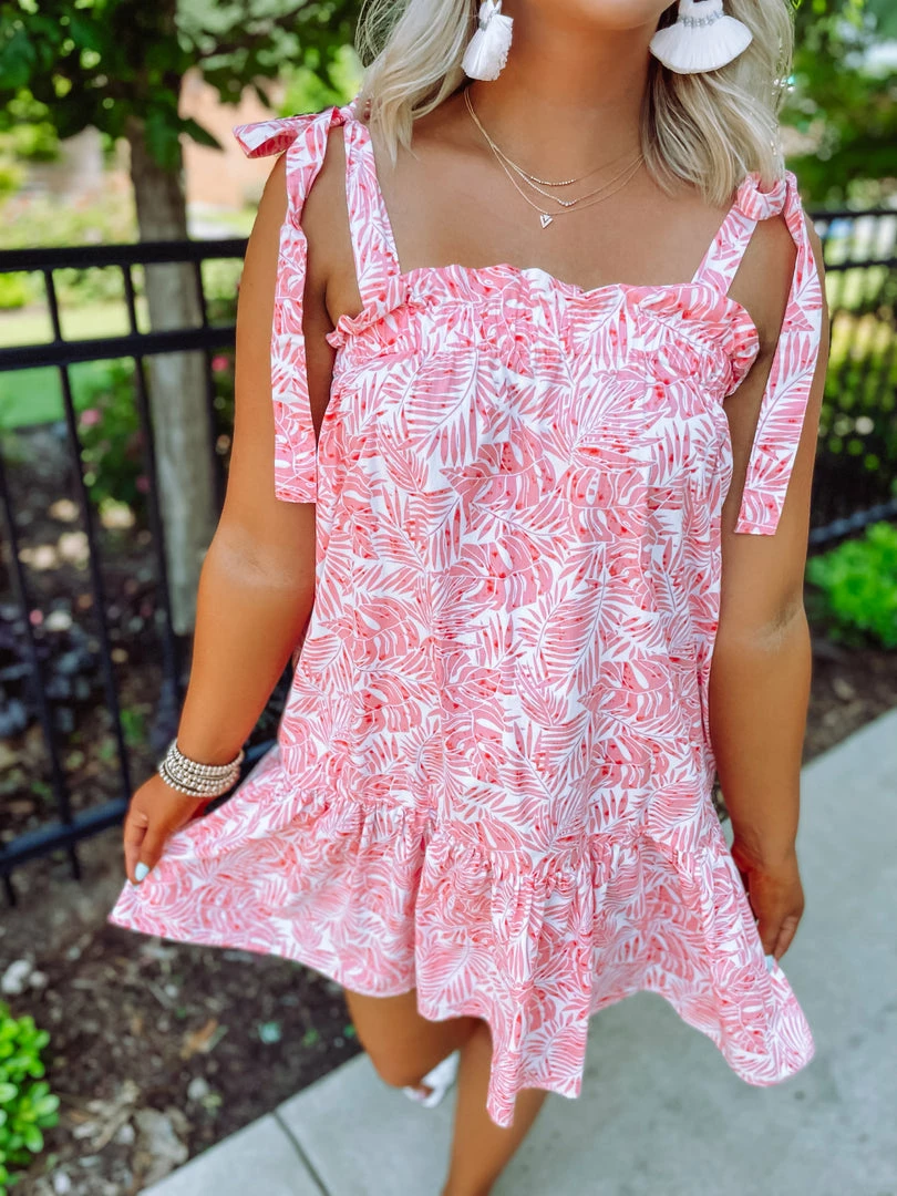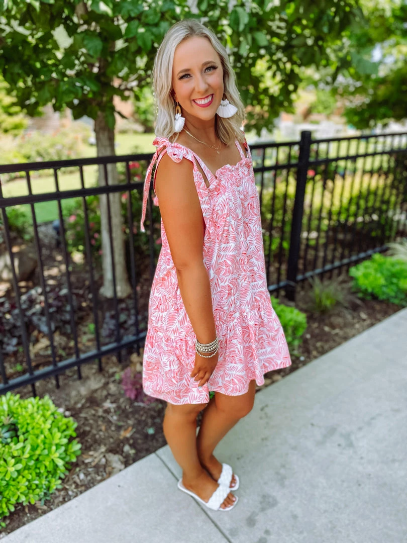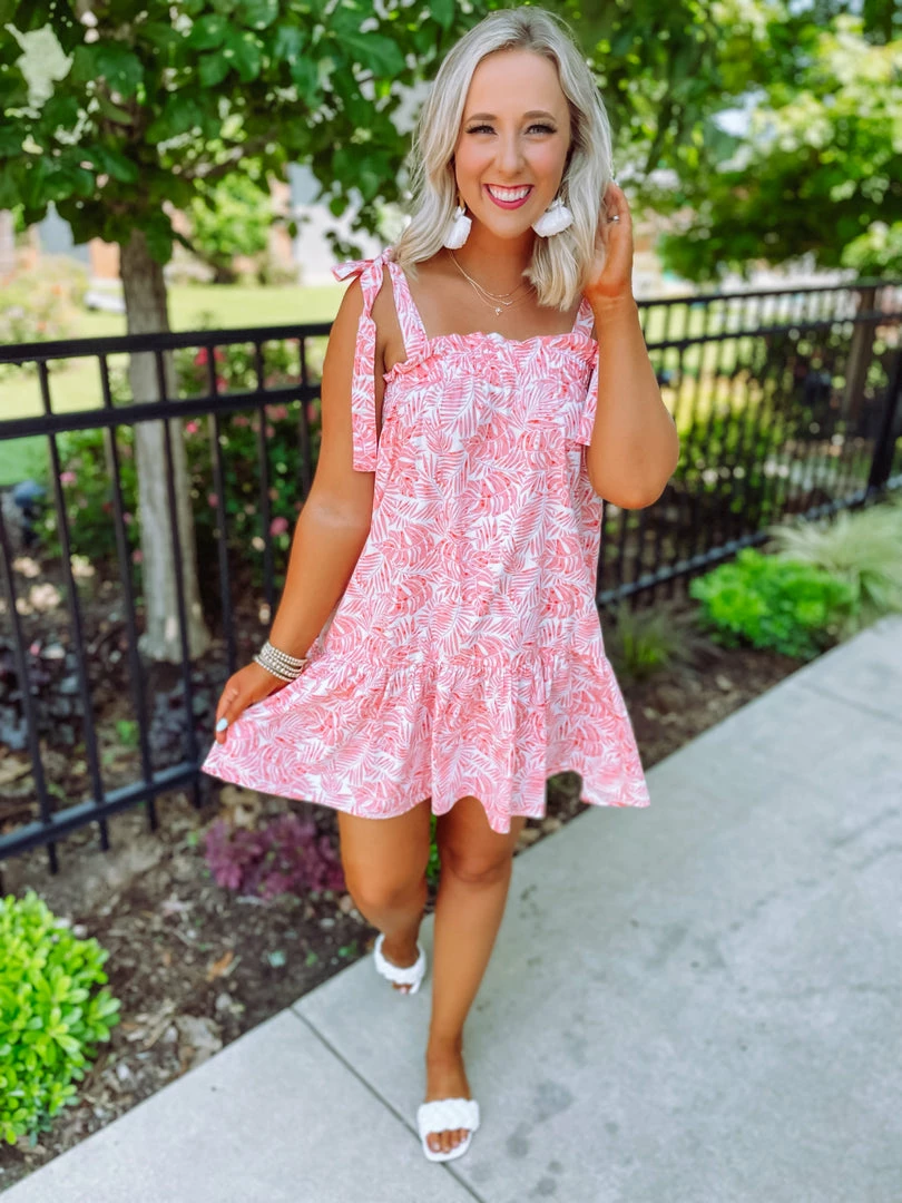 This dress is easy like a Sunday morning! Our Harlow Tropical Tie Shoulder Dress comes in a white hue with coral palm leaf print. Designed with a elastic square neckline that is mirrored on the back + loose silhouette + functional tie straps. Finished with 2 side pockets! The sweetest dress for all your summer festivities! Styled with our Cabana Earrings and Ball Twist Sandals.