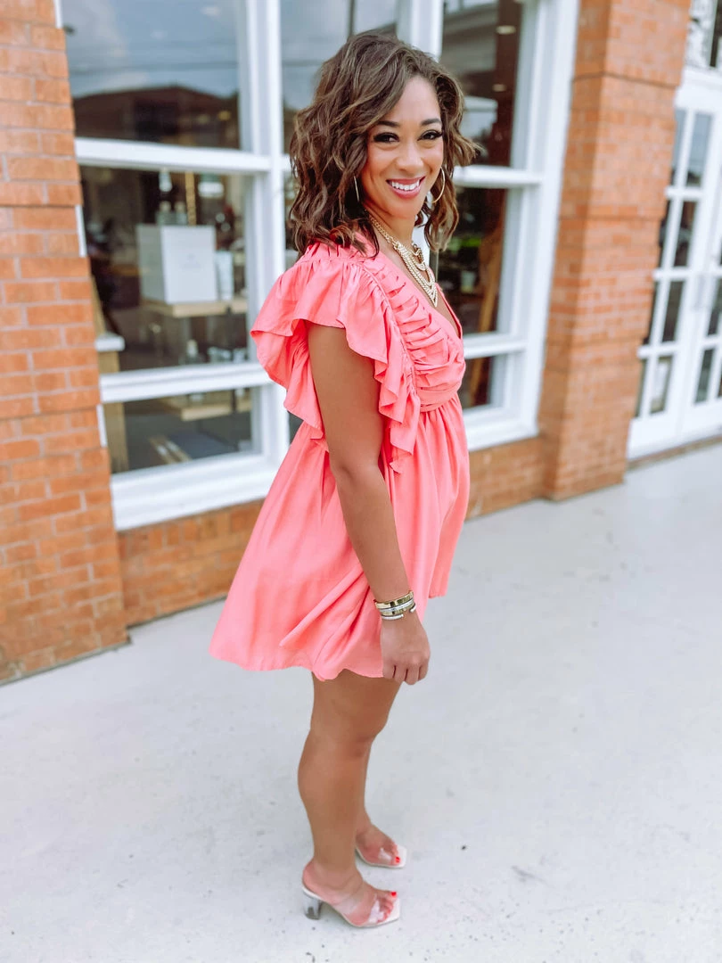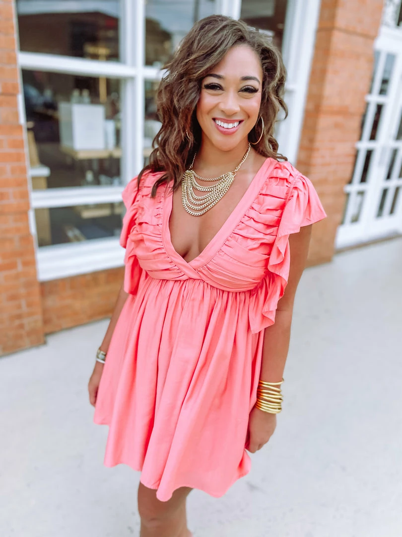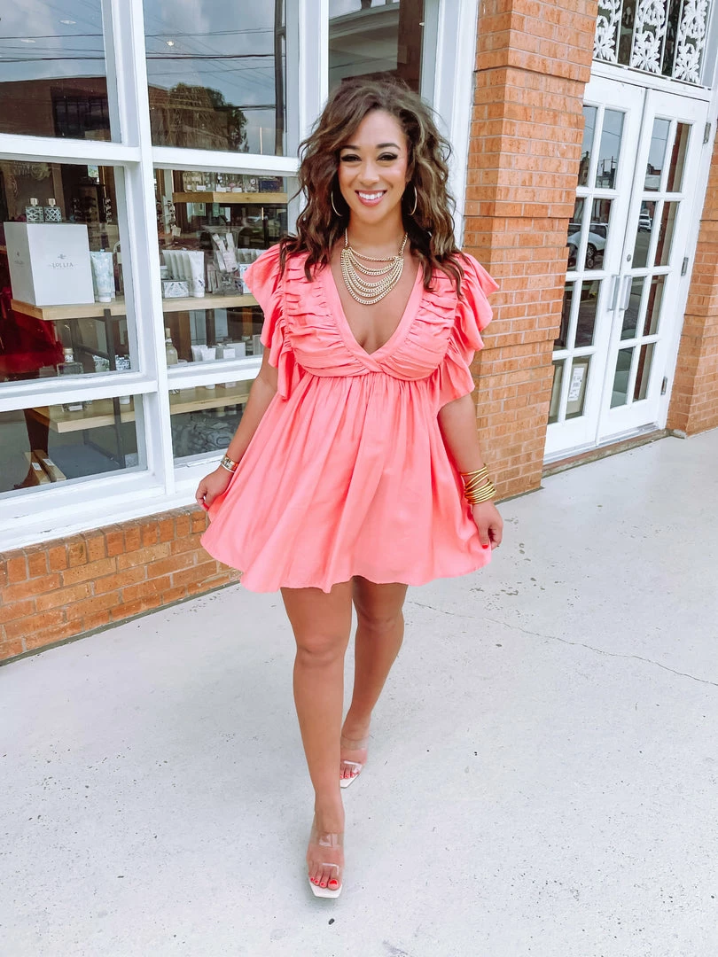 Elegance meets flirty in the Ashley Mini Dress and we are falling HARD. Tailored with a deep v neck line + ruffled flutter sleeve + ruched detail + tie back feature. This dress is the perfect color to add to your summer wardrobe! Style it like Morgan with the Caroline Necklace.