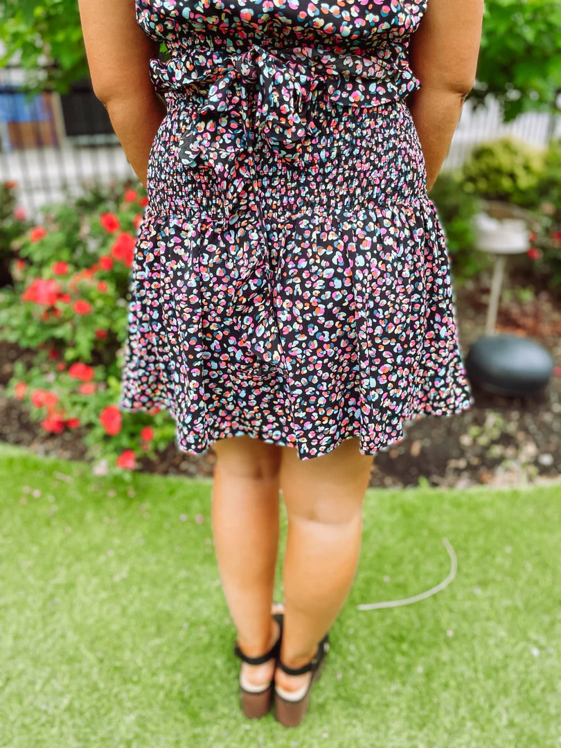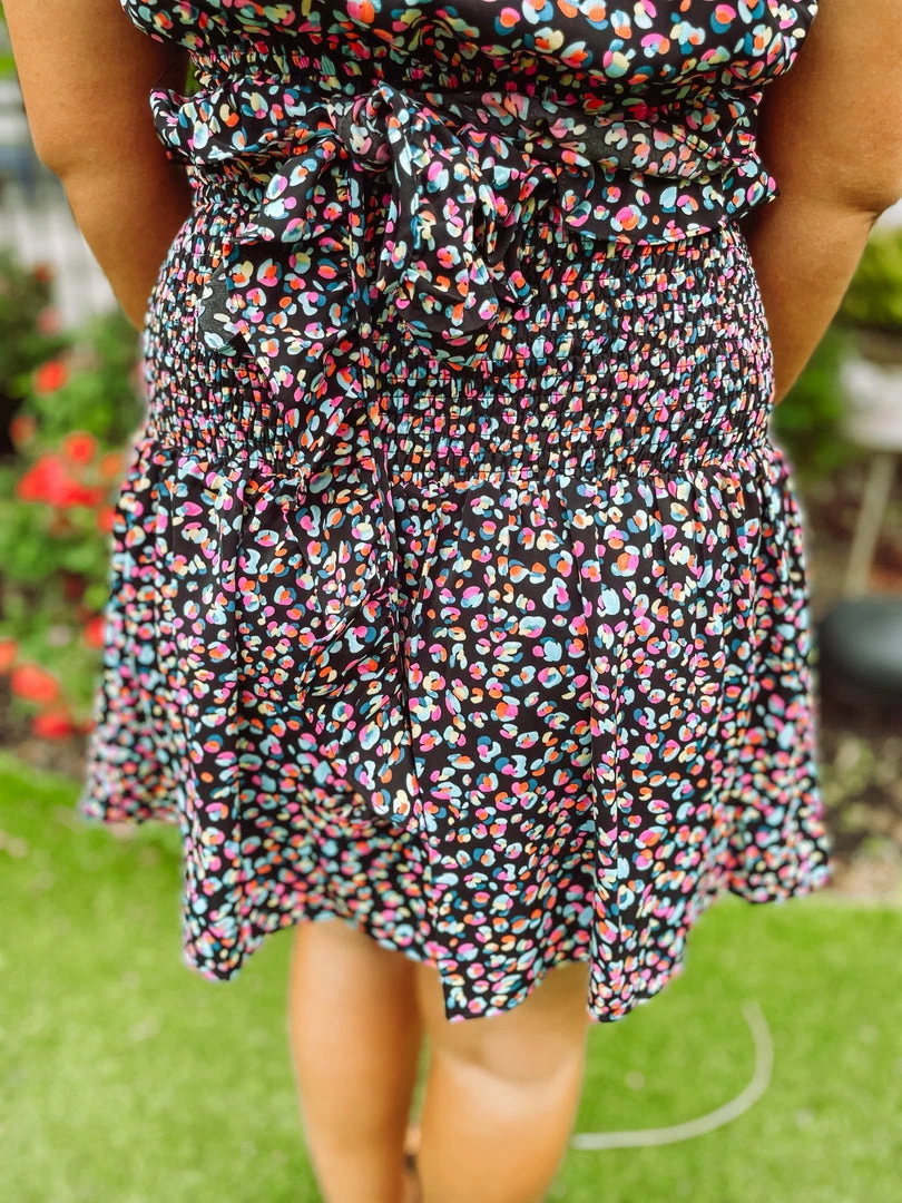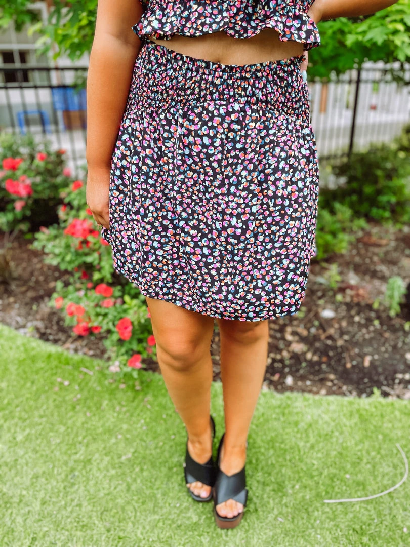 Steal the show in our Carolyn Mini Skirt! Designed with a smocked high waistband + fully lined + vibrant spotted print. Nothing pairs better with the best skirt ever other than a matching top! Oh yes ma’am this sweet skirt is part of a set! Steal Shelby’s style ~ perfectly paired with the Flora Self Tie Top + Raglan Wedge Sandals + Carly Double Acrylic Square Drop Earrings.