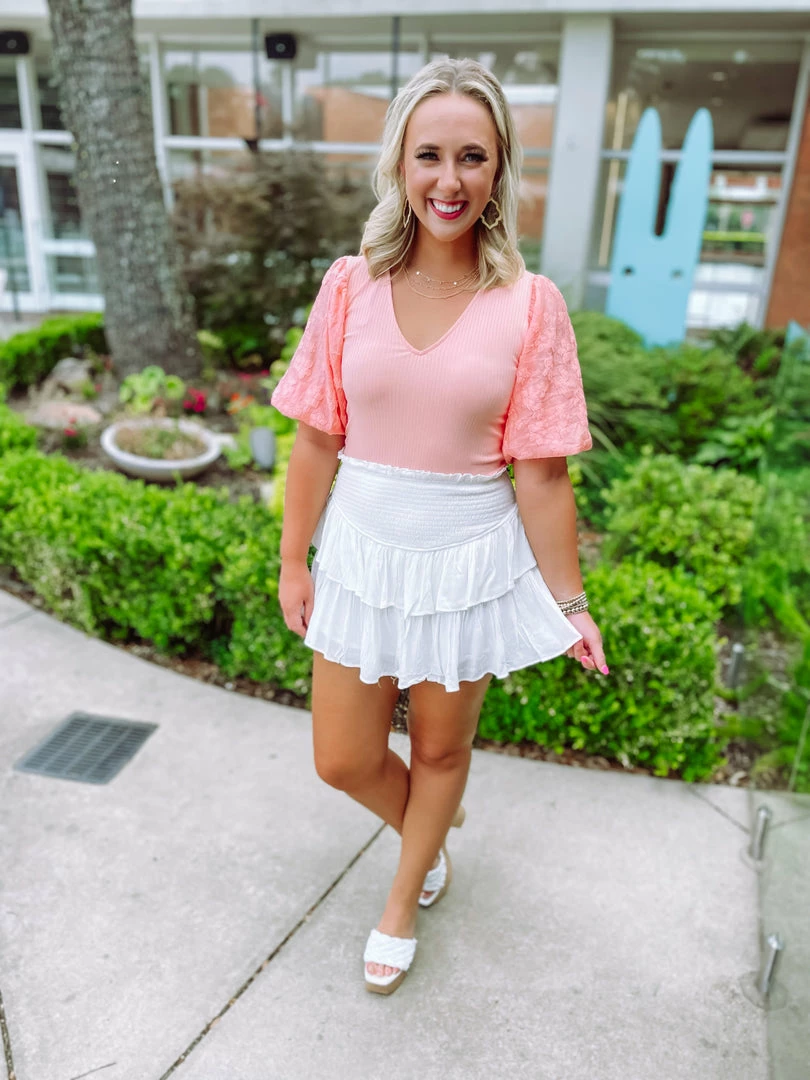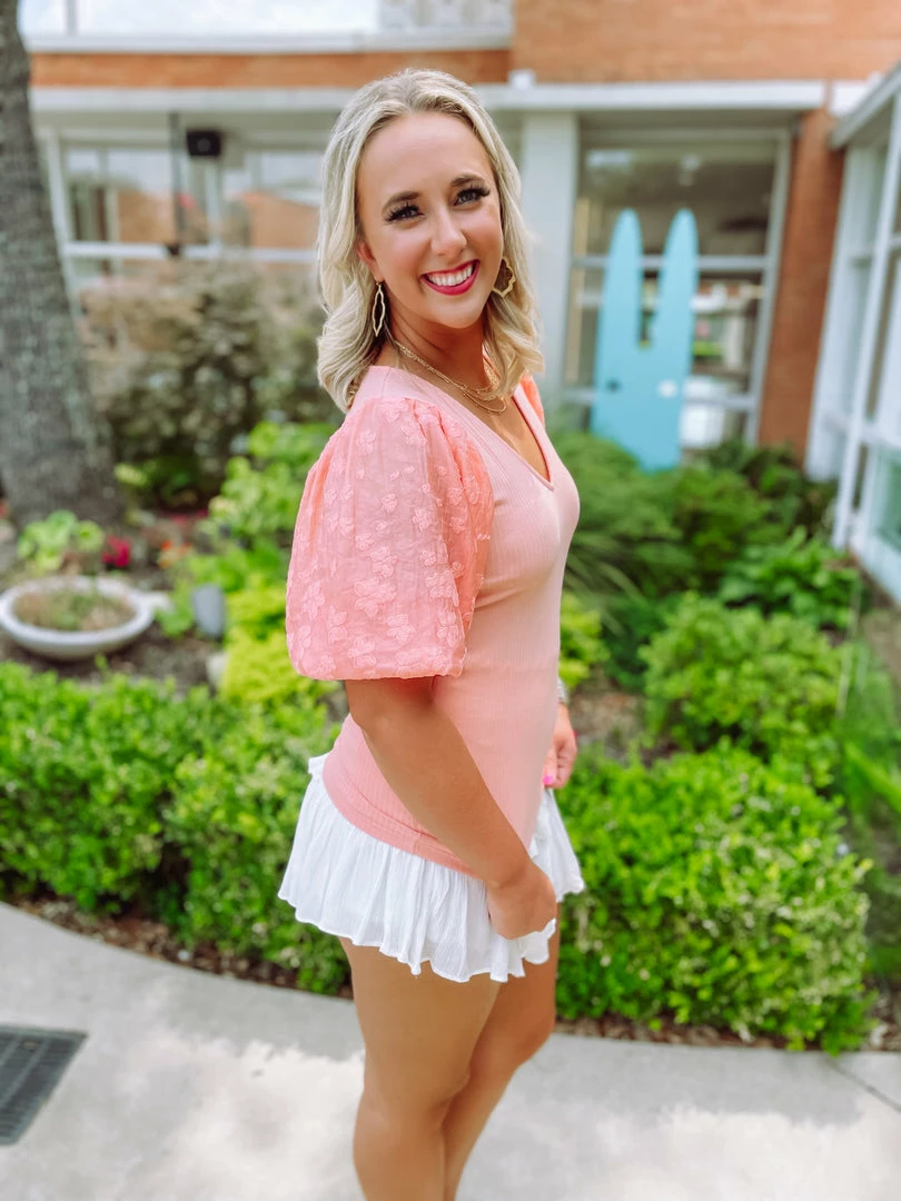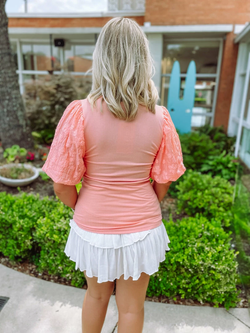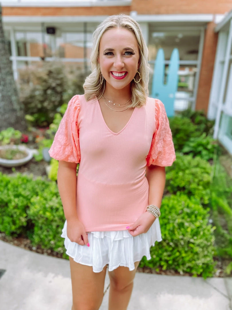 Our Estelle Top is so graceful and delicate! The floral features on the bubble sleeve is just right! With a v neck line + fitted ribbed silhouette + peach color and great length, it becomes the top you want to wear all day every day! So comfortable and crisp! Styled in our Brandy Woven Skirt + the Tessie Chunky Wood Heels + Mary Gold Everyday Drop Earrings.