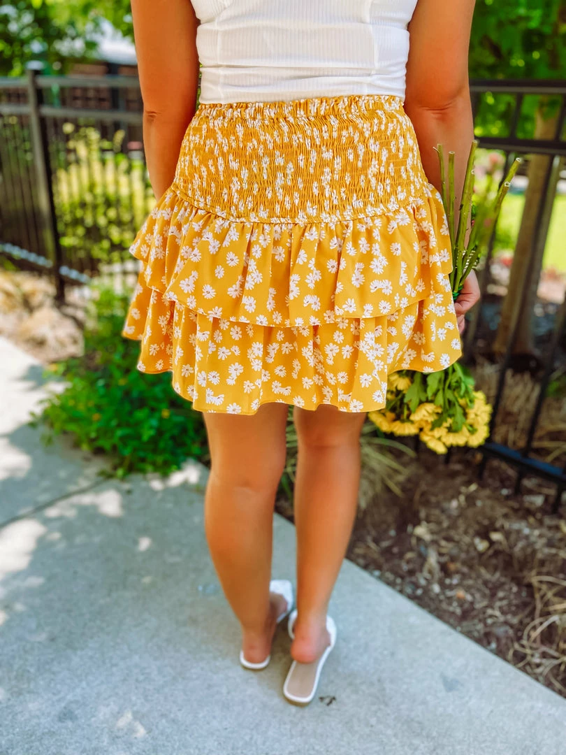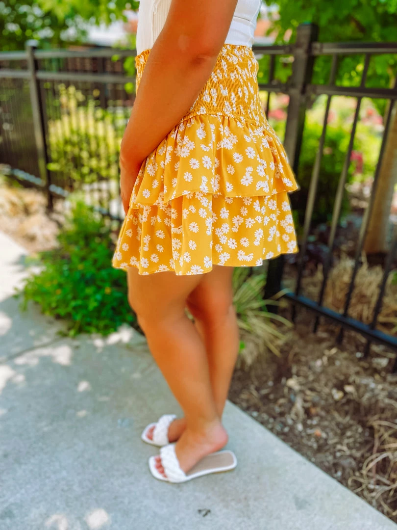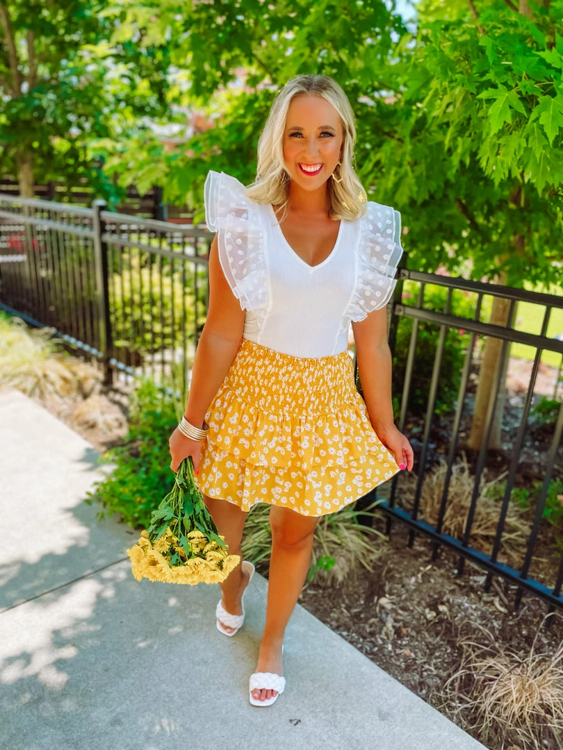 That new skirt feeling that we love so much! The Hadley Skirt is tailored with a smocked section + tiered ruffle design + shorts lining. The daisy print is such a summer vibe. Wear to brunch or on a shopping day! Styled with the Landry Bodysuit + the Ball Twist Sandals + the Mary Gold Everyday Drop Earrings.