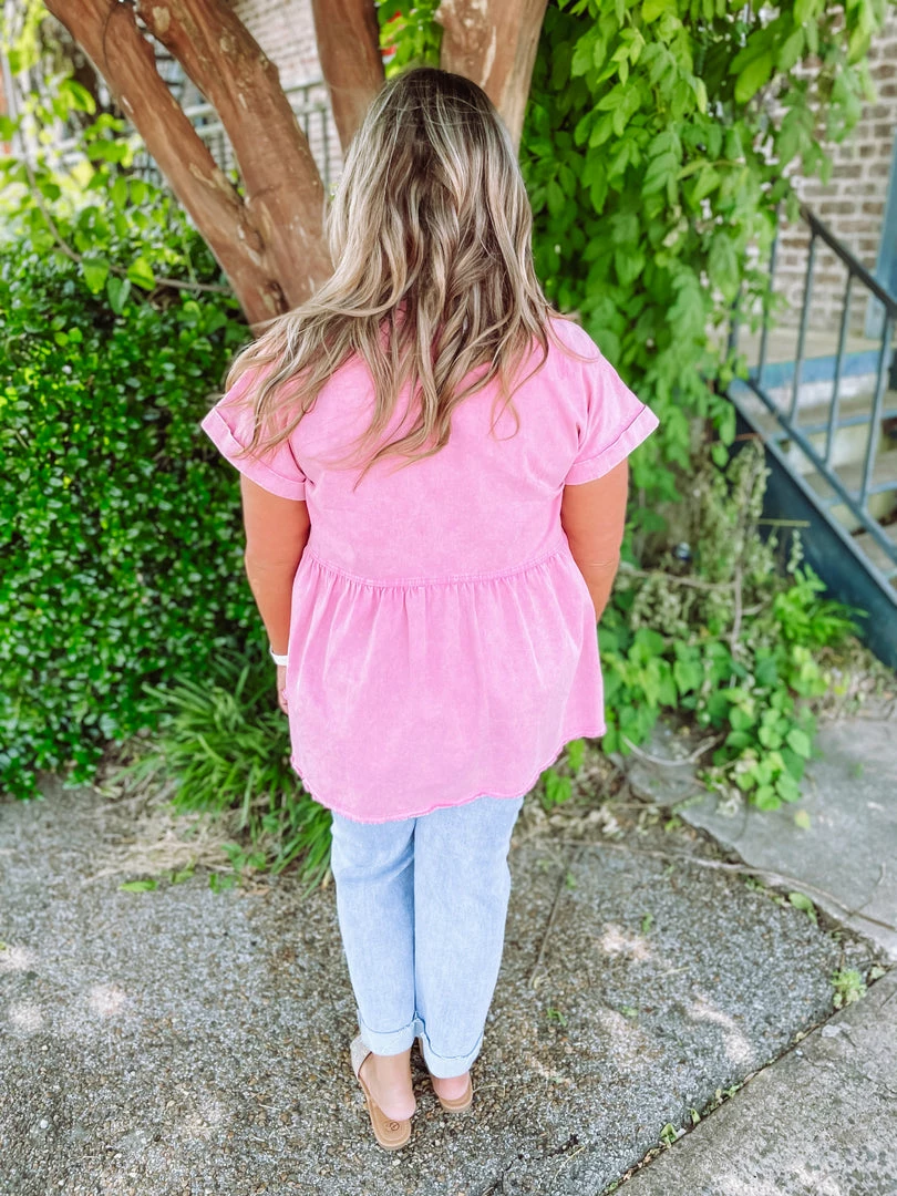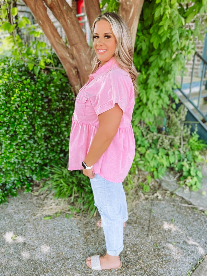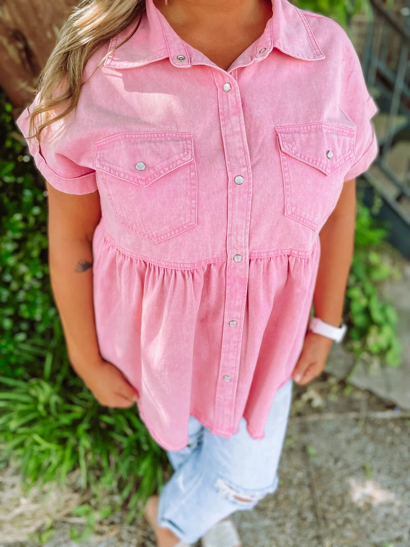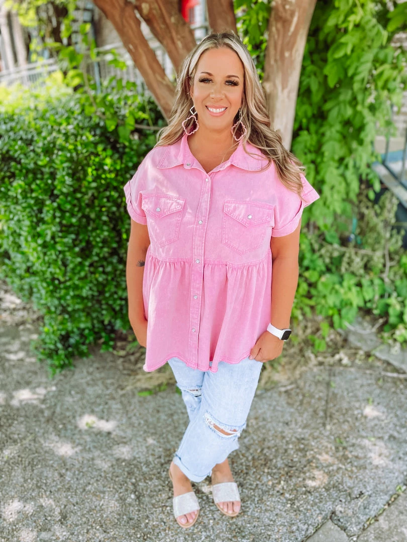 YES! You really do need our Linda Denim Collared Babydoll Top! Tailored with cuffed short sleeves + frayed hem + dual chest pockets + functional pearl snap button up! The details make this top a show stopper! Easily dolled up with white skinnies and wedges OR keep it casual with shorts and sneakers. Perfectly paired with our Lovie Earrings, Efron Sandals and Camille Distressed High Waisted Asymmetric Button Jeans.