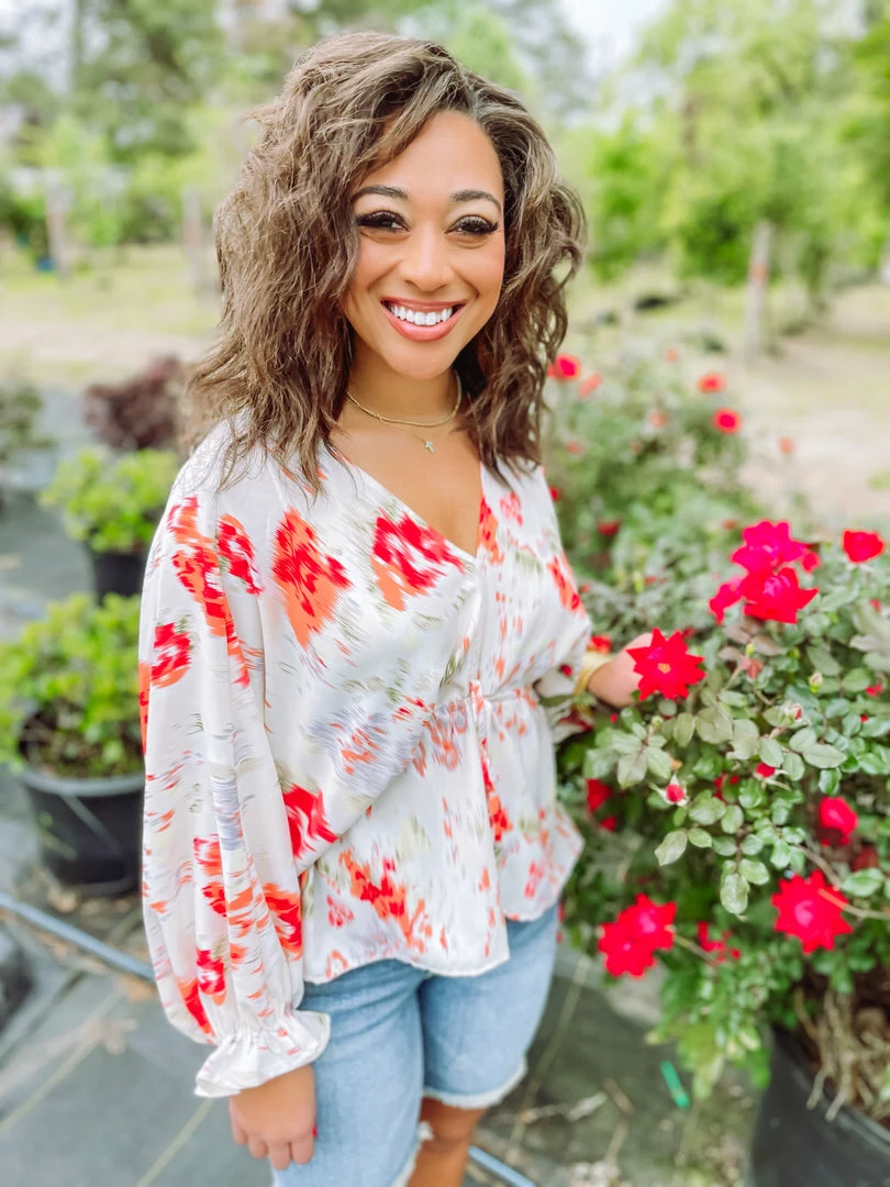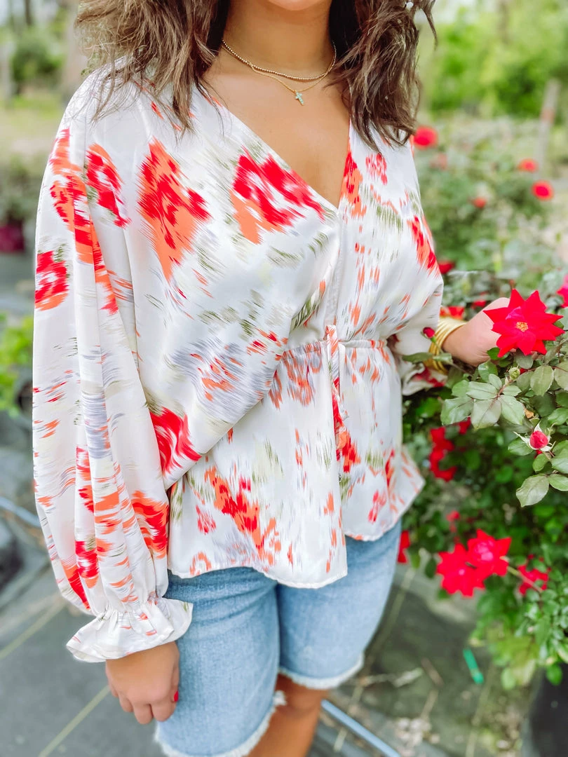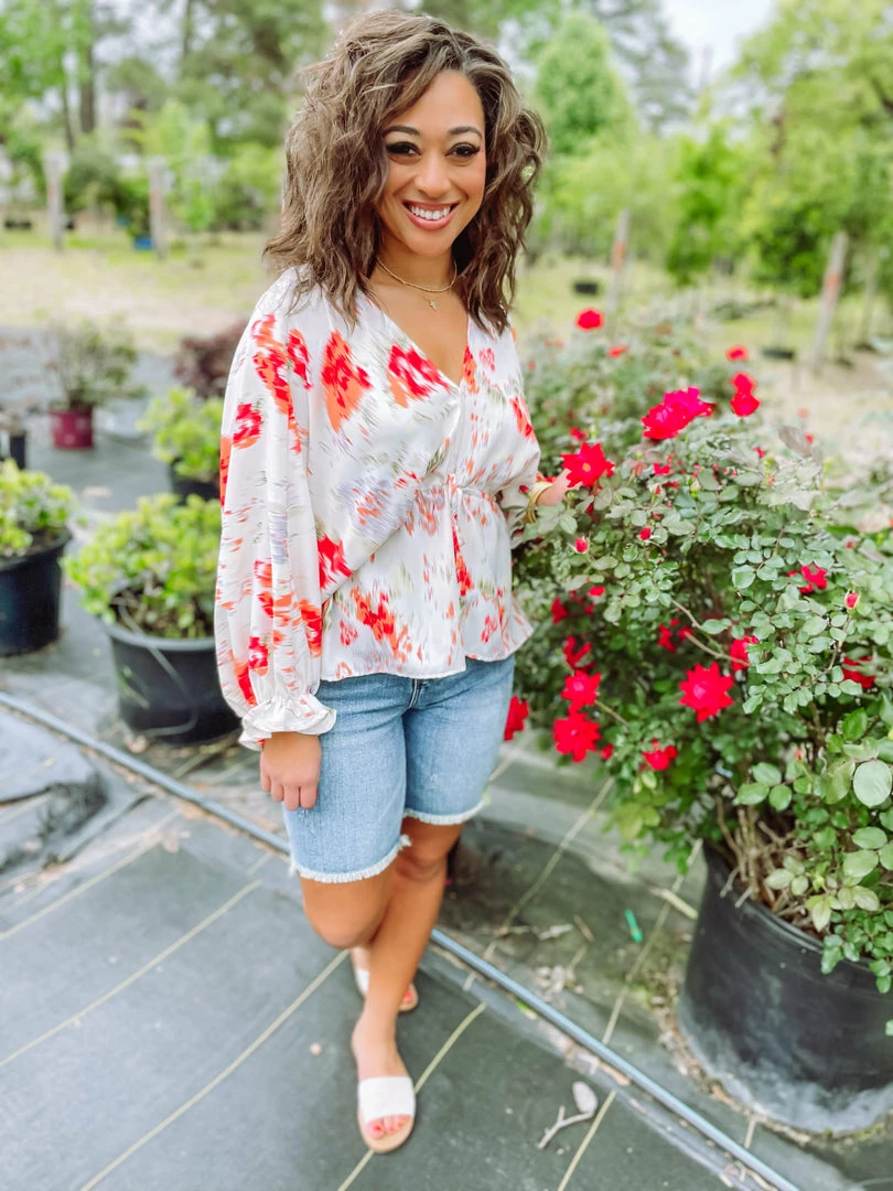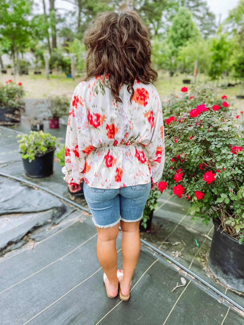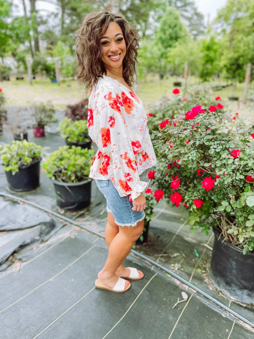 The Marlee Top achieves a sophisticated femme look that is so versatile! Tailored with a v neckline + long sleeves with an elastic cuff detail + functional tie on the waist! The fabrication is breezy and lightweight making this top great for layering at work or stand on it’s own for weekend fun! Styled with our Sierra High Rise Cut Off Bermuda Shorts and Efron Sandals.