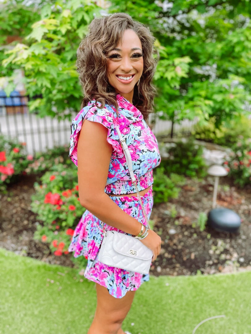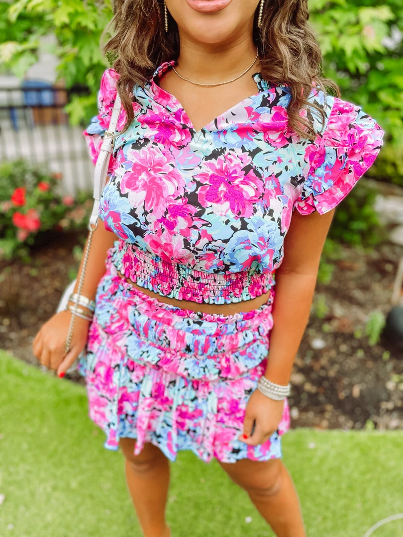 Elevate your summer wardrobe with the Martha Floral Top! Featuring a floral print + smocked v neckline + ruffle sleeve detail + smocked hemline. This top is only complete with the matching skirt! OH YES, this is apart of a set! Steal Morgan’s style ~ perfectly paired with the Aliya Floral Tiered Mini Skirt + Tessie Wood Chunky Heel.