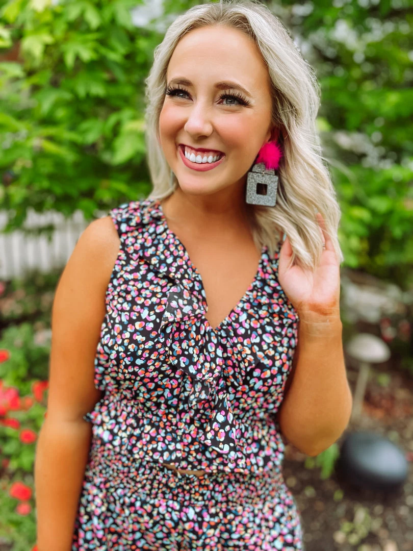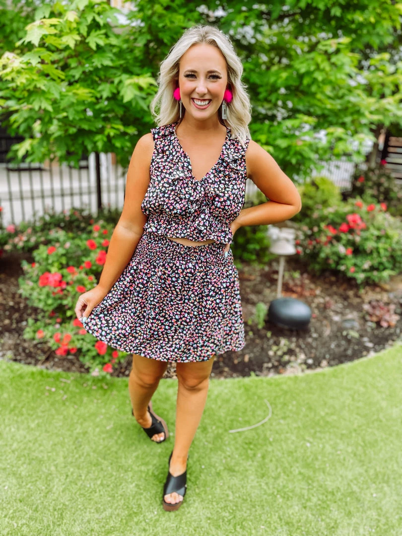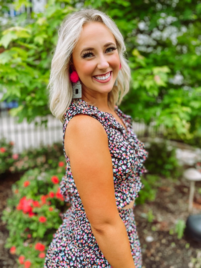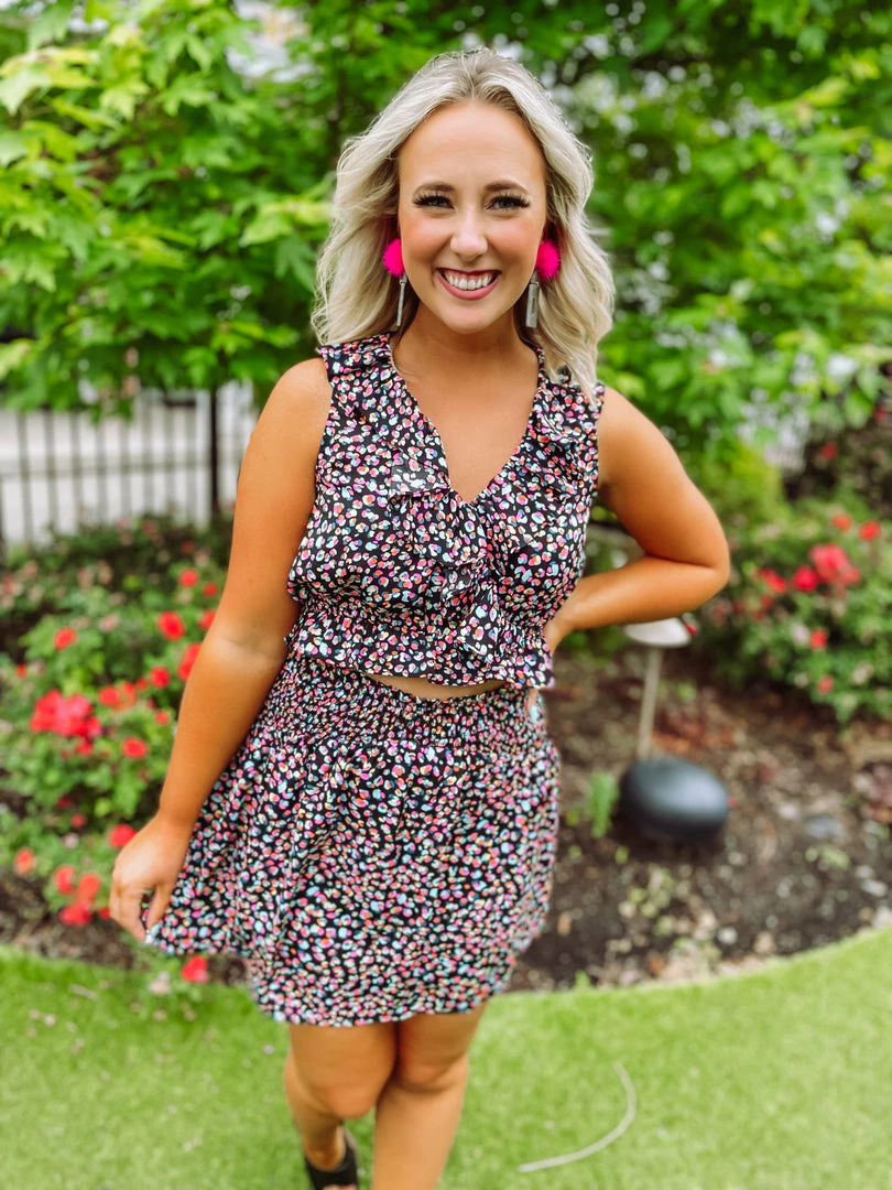 Steal the spotlight when wearing our Flora Crop Top. Featuring endless ruffles + wrap design with a functional tie on the bottom hem + vibrant spotted print. Nothing pairs better with the best top ever other than a matching skirt! Oh yes ma’am this sweet top is part of a set! Steal Shelby’s style ~ perfectly paired with Carolyn Mini Skirt + Carly Double Acrylic Square Drop Earrings.