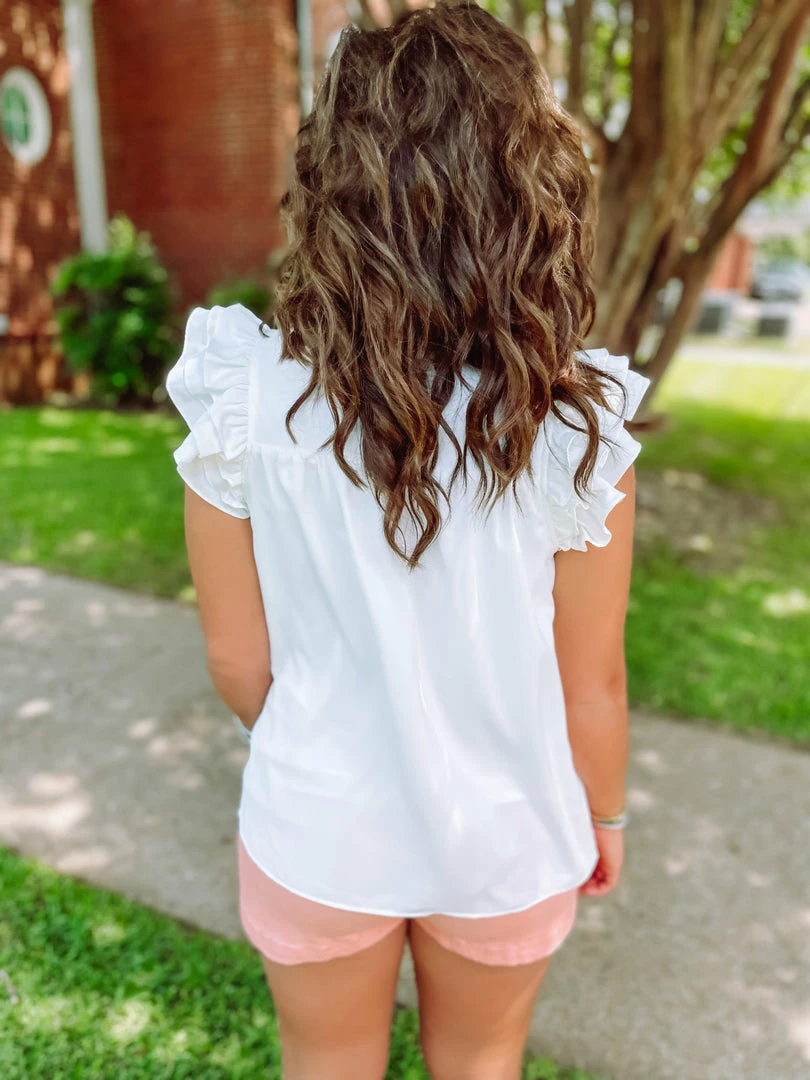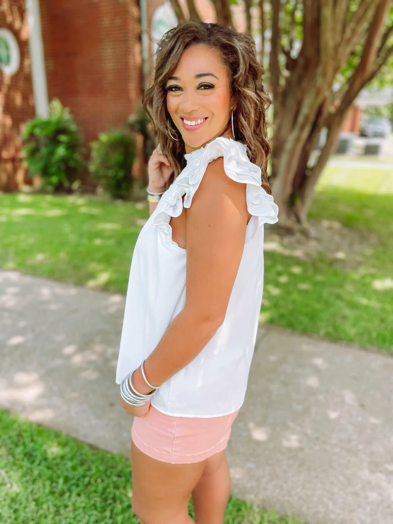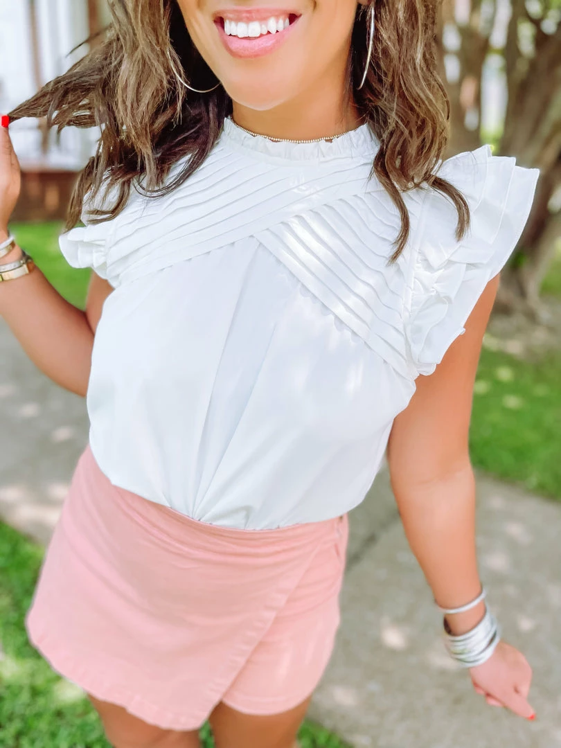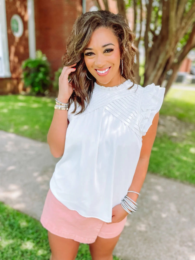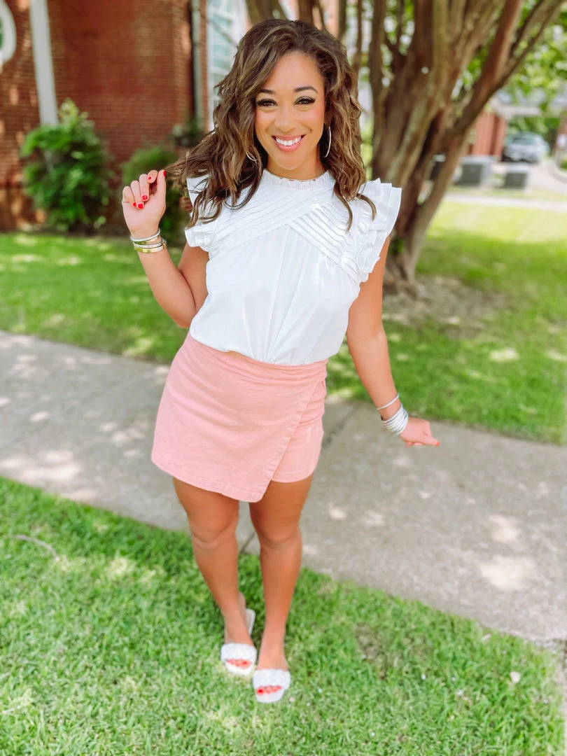 Meet this sweet femme item: The Whitney Top. Designed with a round ruffle neck line + tiered ruffle sleeve feature + criss cross pleated detail + fully lined. This top is easily dressed up or down to fit all of your needs! We got you sis! Pair this top with jeans and wedges or take notes from Morgan’s style and grab the Kaylie Skort + the Ball Twist Sandals!