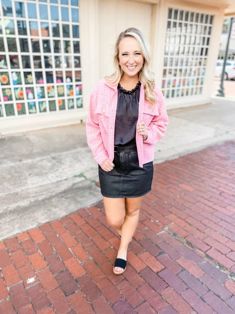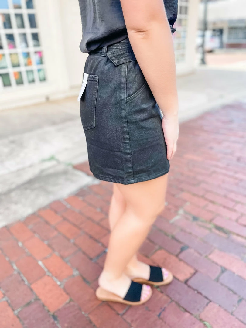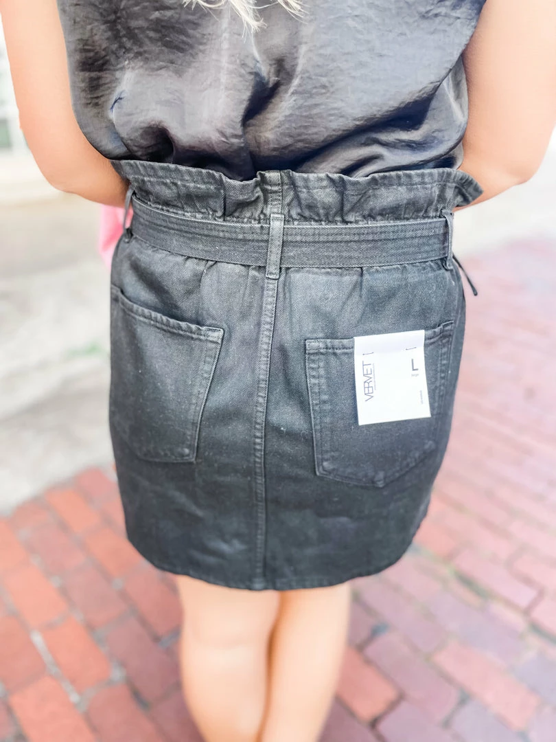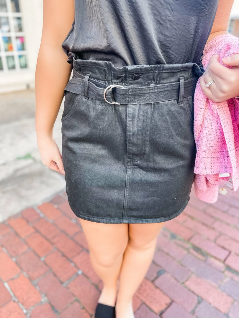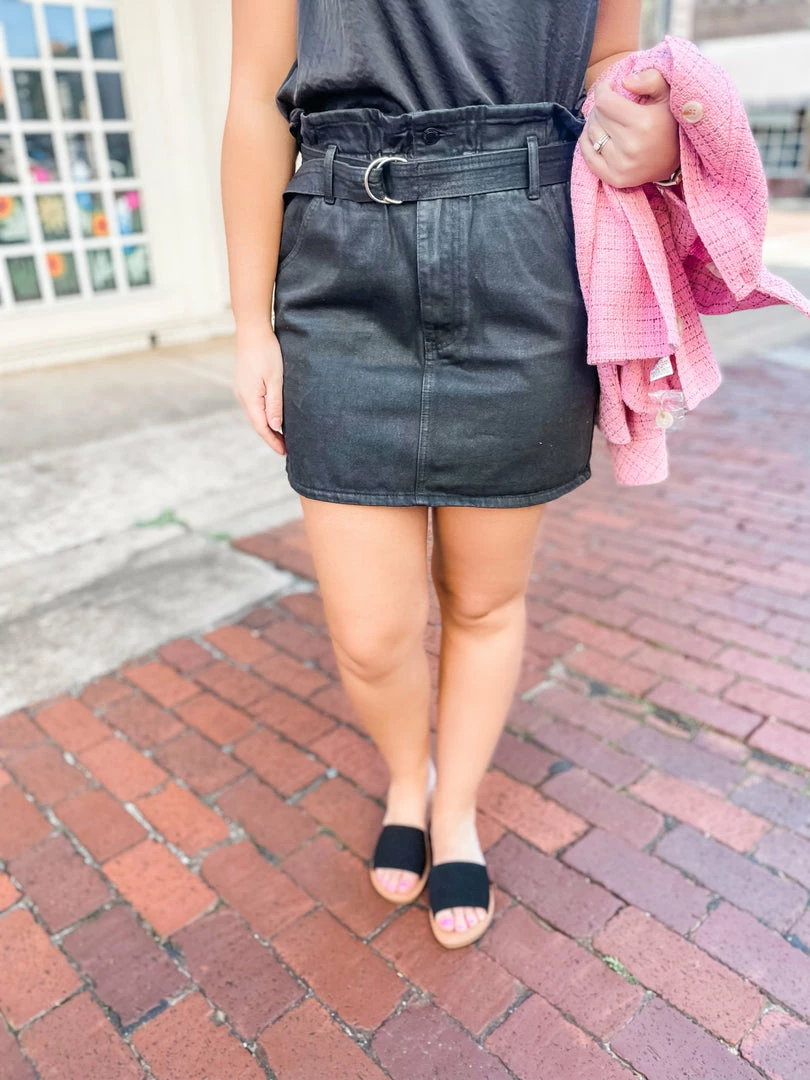 Black Denim makes our hearts skip a beat! Make it a skirt and we are over them moon! The Alaia Black Paperbag Mini Skirt is high waisted with a functional belt! Finishing with a fun wash and button/zip fly, this skirt is for sure a closet essential! Styled with our Efron Sandals, Wendy Shirring Neck Satin Top and Demi Knitted Button Down Jacket.