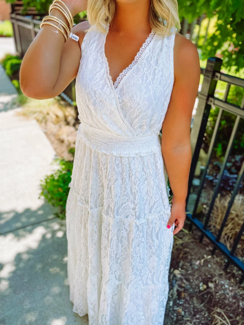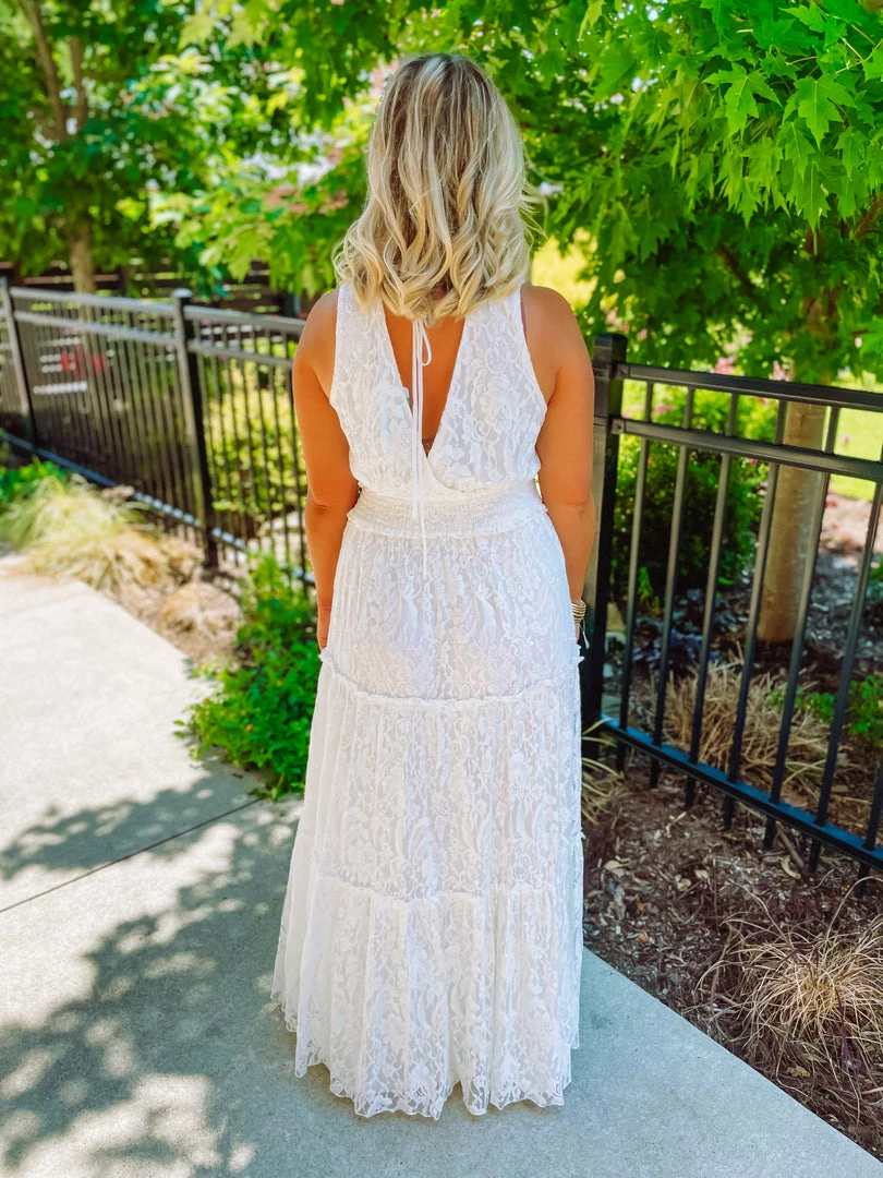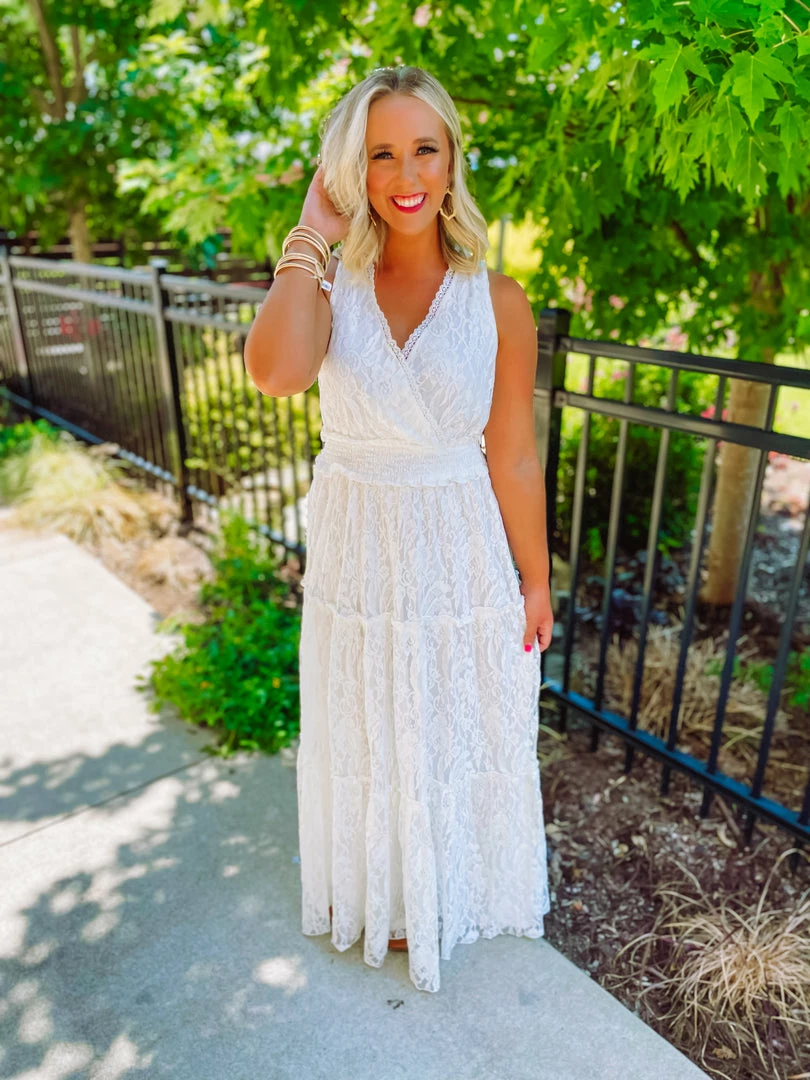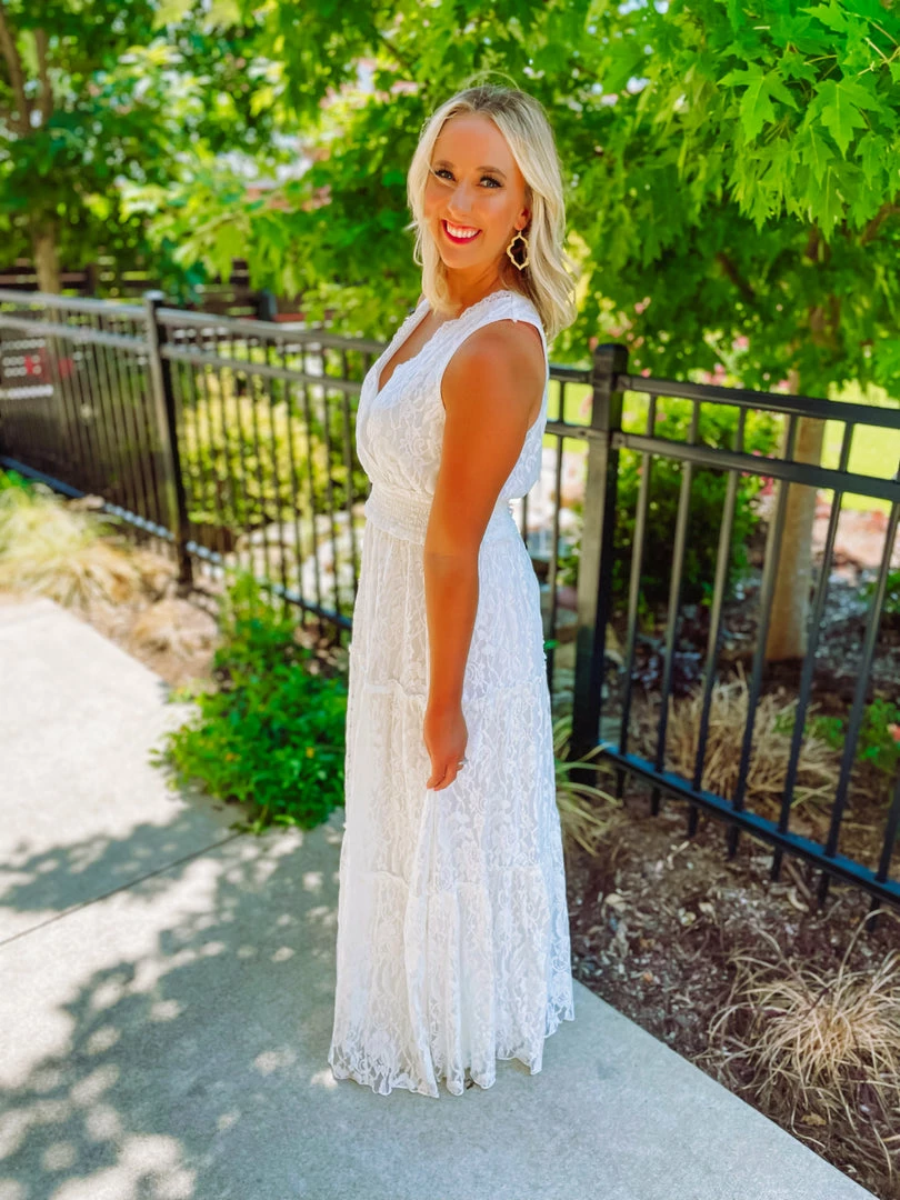 Lace on lace on lace! Meet the Raygin Dress! Showcasing a v neck line + tie feature + smocking detail + tiered design. The full lace fabrication makes this a one of a kind item! Perfect for all of our soon to be brides or our gals who just love white! Styled with the Mary Gold Everyday Earrings.