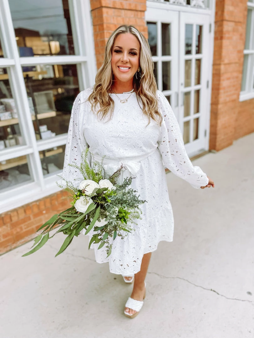 Sweet as can be is the vibe our Elodie Eyelet Ruffled Hem Bow Tie Dress brings! Designed with a curved neckline + keyhole + elastic waistband with tie detail + long sleeves + modest length, this femme dress will have you ready for bridal needs, family photos, brunch, or because it’s just a great day! Styled with our Ball Twist Sandals.