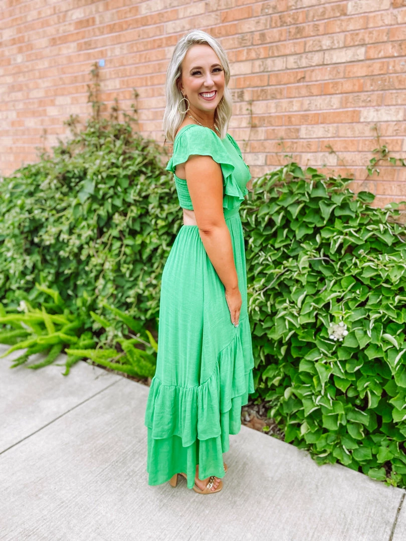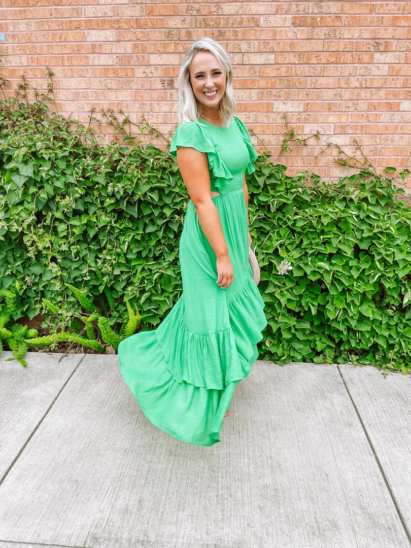 Spice things up in the Joann Dress! Tailored with a scoop neck line + ruffle sleeve + side/back cut out feature +