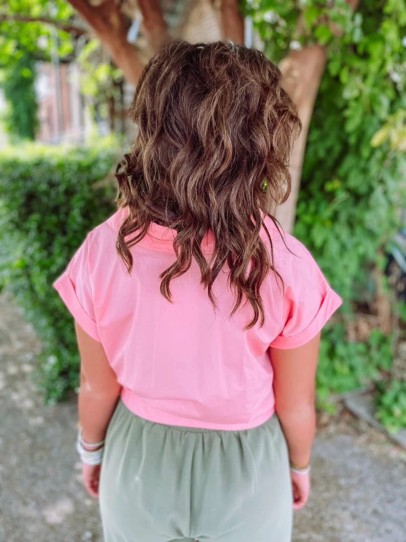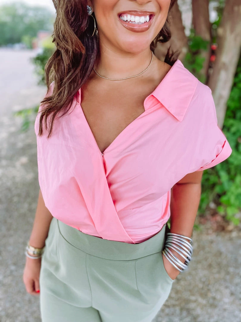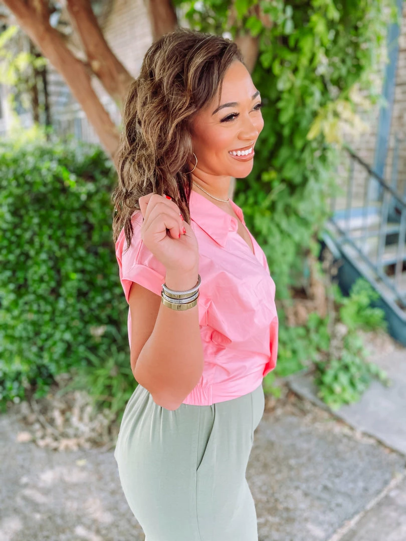 Make today happen in the Paulina Top! Tailored with a v neck line with a collar + snap button closure + cropped fit + elastic hem detail. This blouse