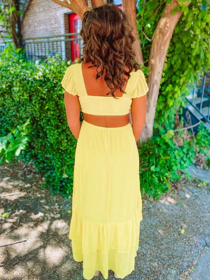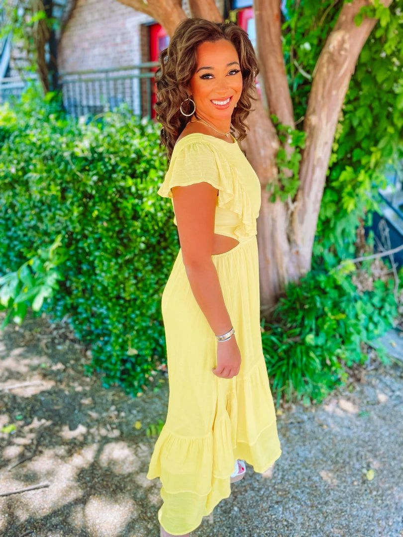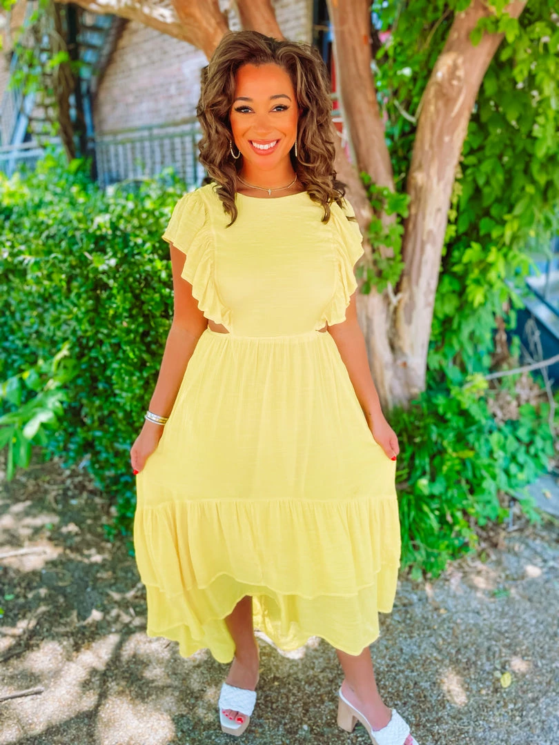 Spice things up in the Raylee Dress! Tailored with a round neck line + ruffle sleeve + side/back cut out feature + smocked back detail + ruffle hi-low hem line. The fabrication is so breezy, lightly textured and comfortable for memorable nights! So sweet and feminine! Styled with the Tessie Chunky Wood Heel + the Goldie Earrings.