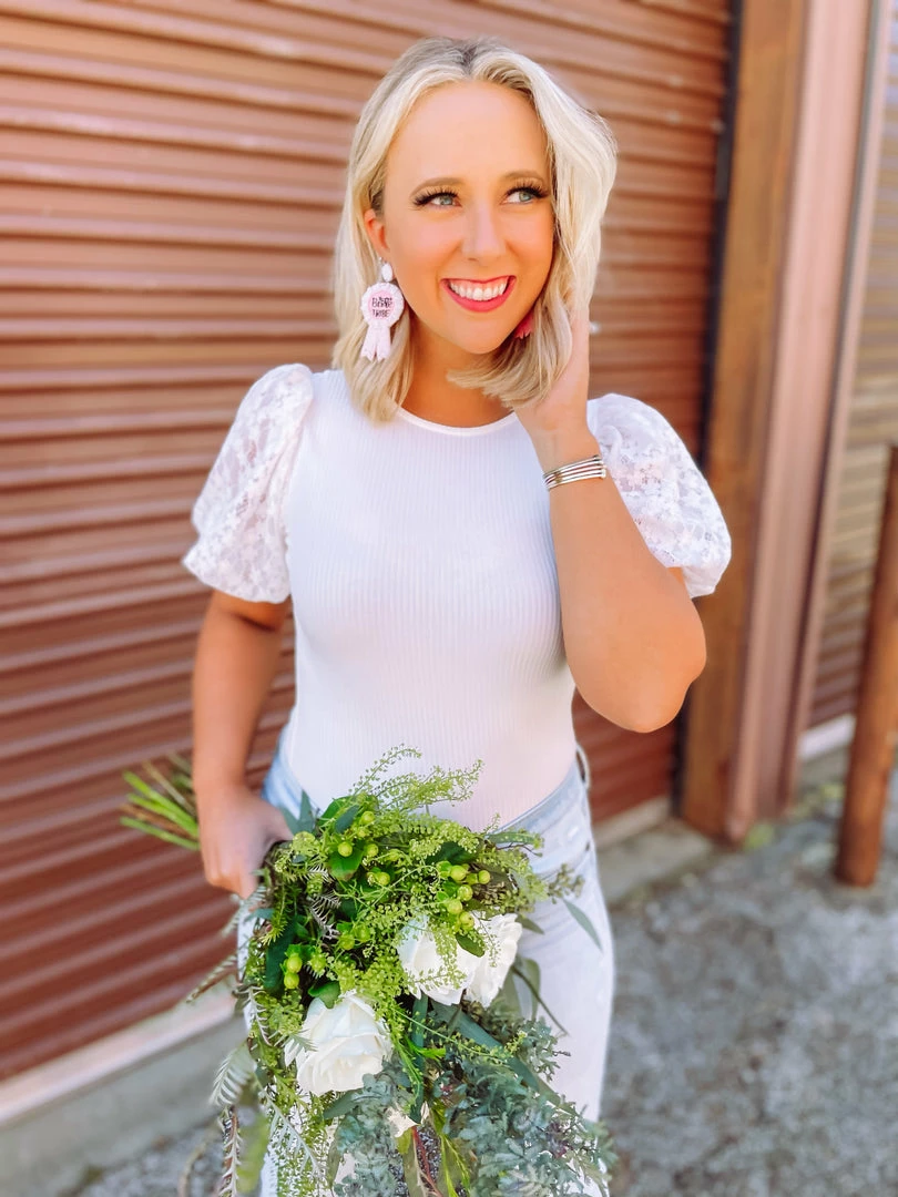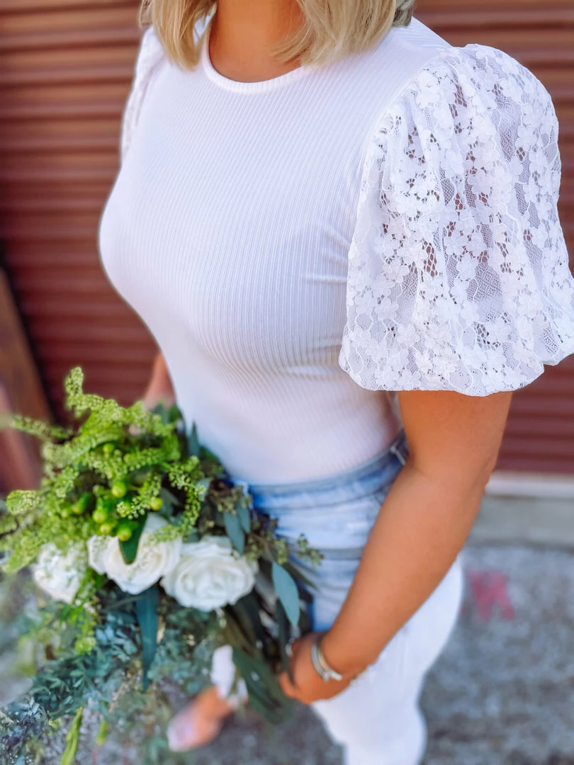 Our Sophie Lace Puff Sleeve Knit Top is so graceful and delicate! The floral lace on the sheer puff sleeve is just right! With a round neckline, fitted ribbed silhouette, keyhole and great length, it becomes the top you want to wear all day every day! So comfortable and crisp! Styled in our Jenny High Rise Skinny Crop Jeans and Clara Clear Heel Pumps.
