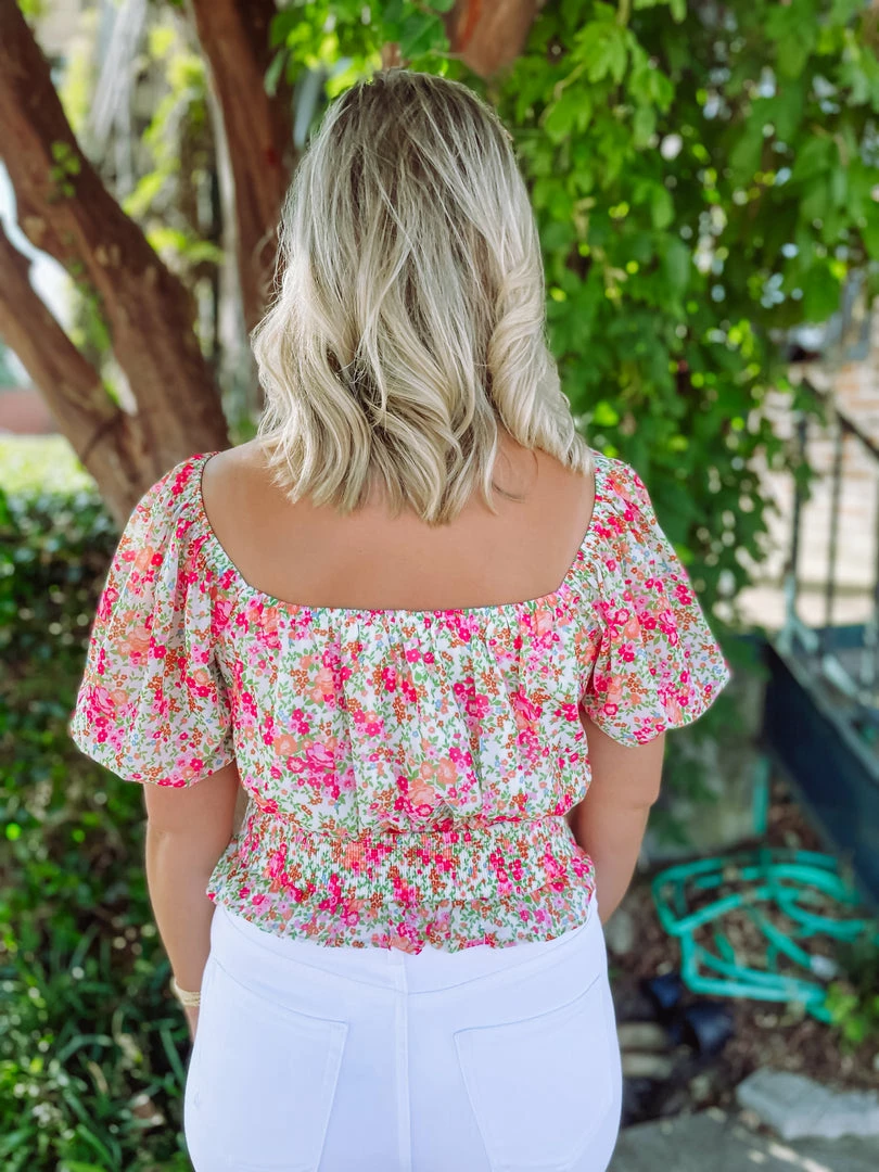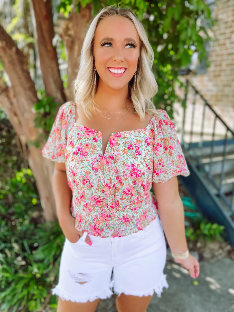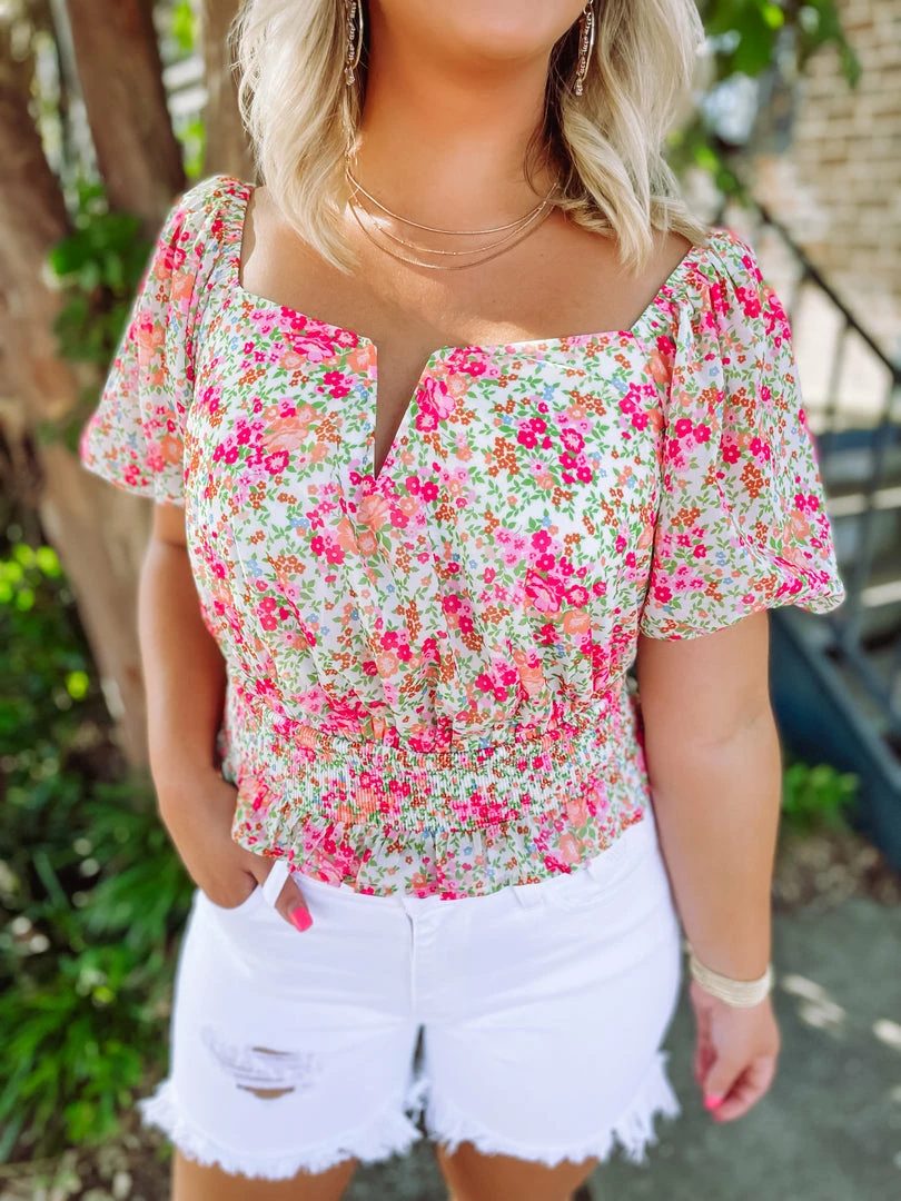 Top off your look with the all new Sydney Top! Tailored with a square neck line with a plunging v + puff sleeve + smocking detail + ruffle hem. The floral print has summer written ALL OVER IT! Style this cutie with jeans and wedges or steal Shelby’s fit and add the Vanessa High Low Shorts + Tessie Chunky Wood Heel + the Shania Earrings!