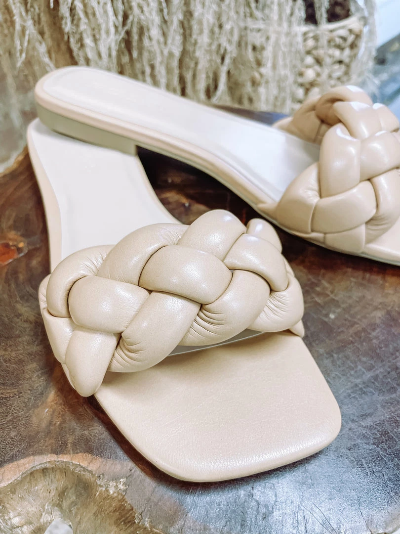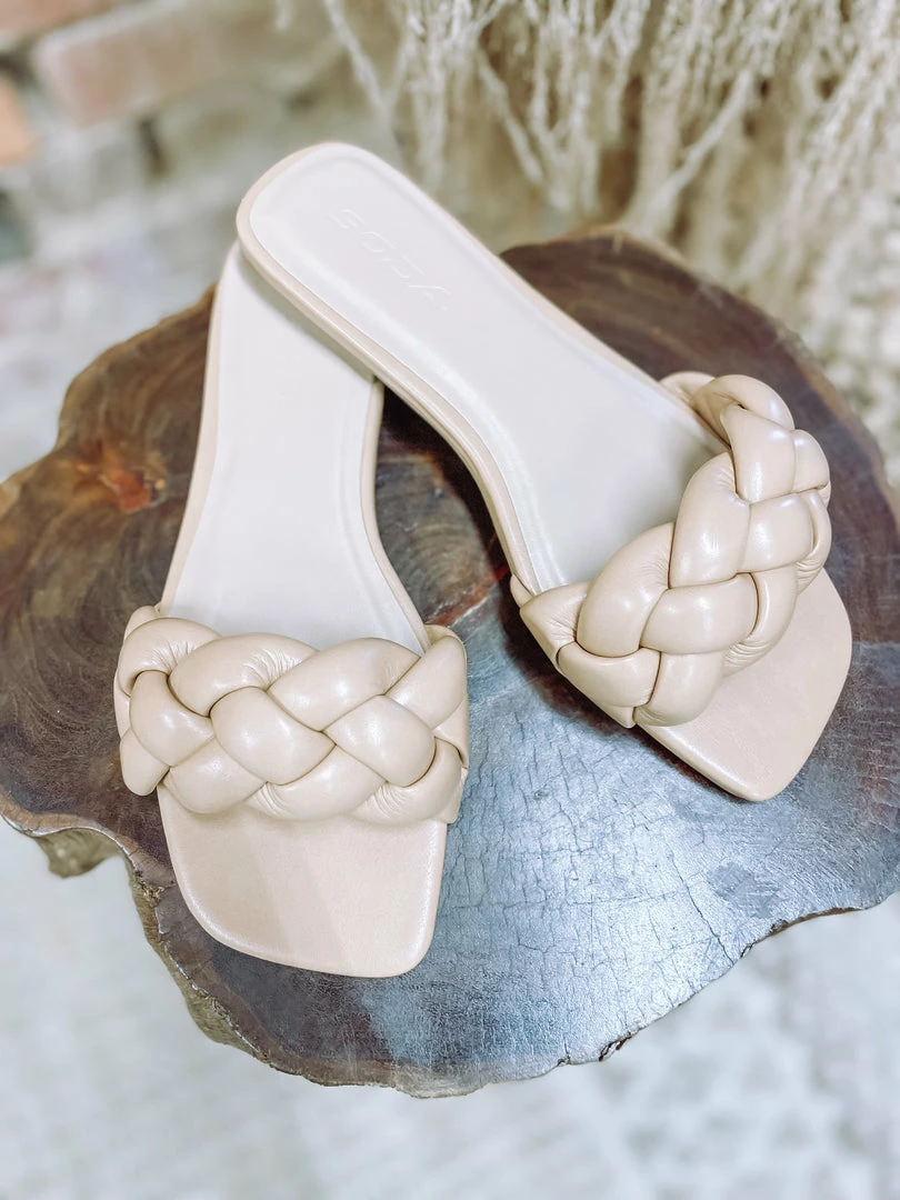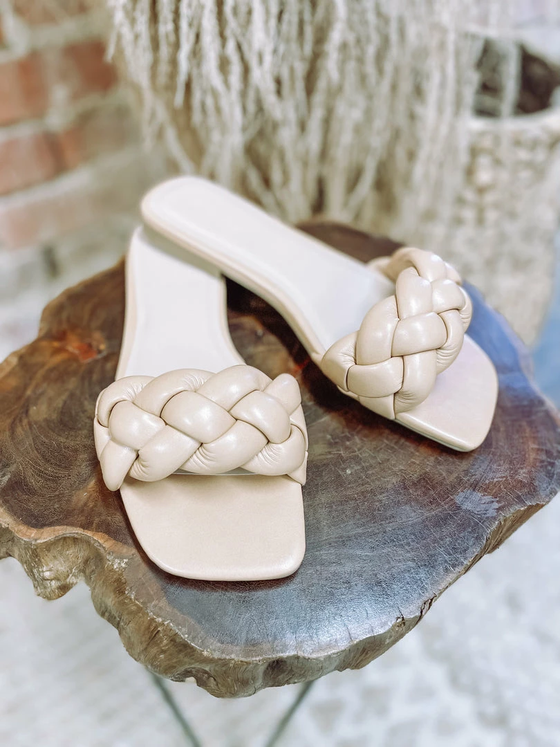 Add some trendy comfort to your outfit with our Ball Twist Sandals! Bringing a square, woven shape & style + slip ons! Ultimate comfort and summer must have!