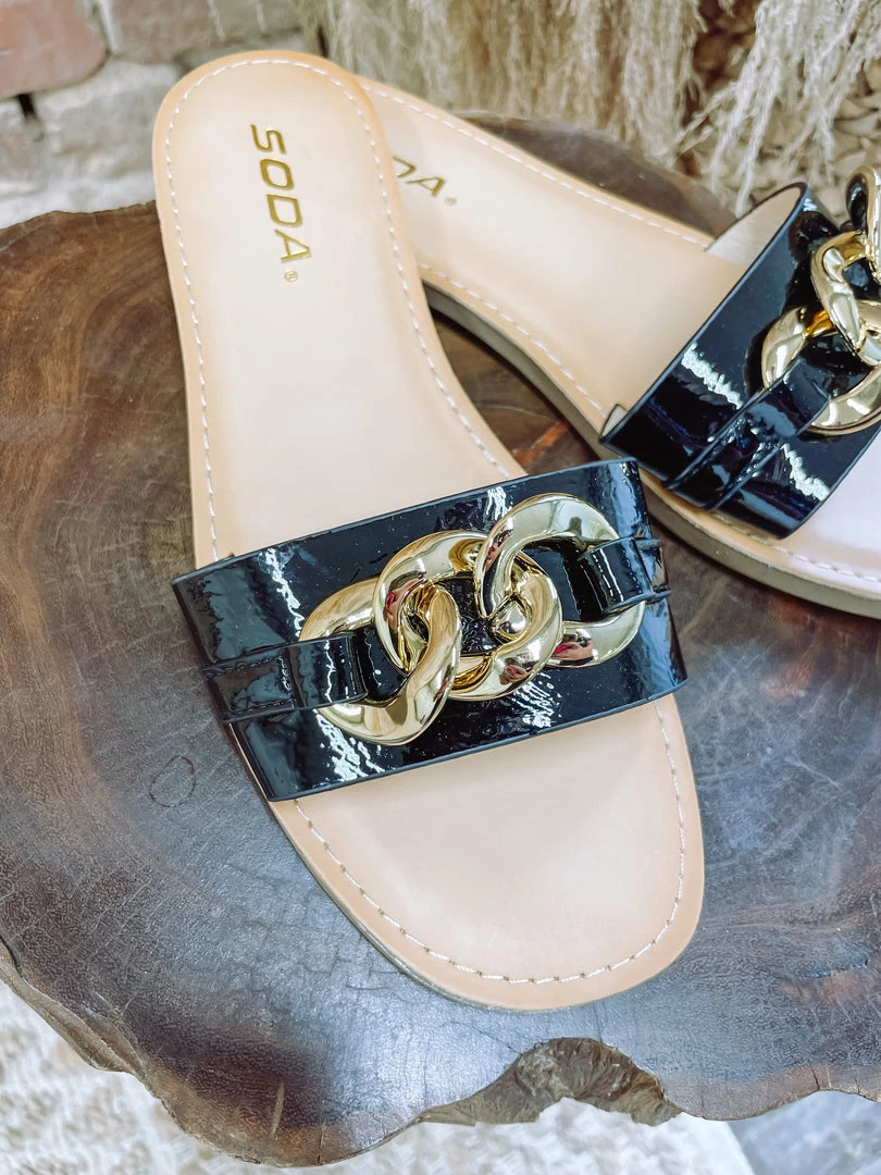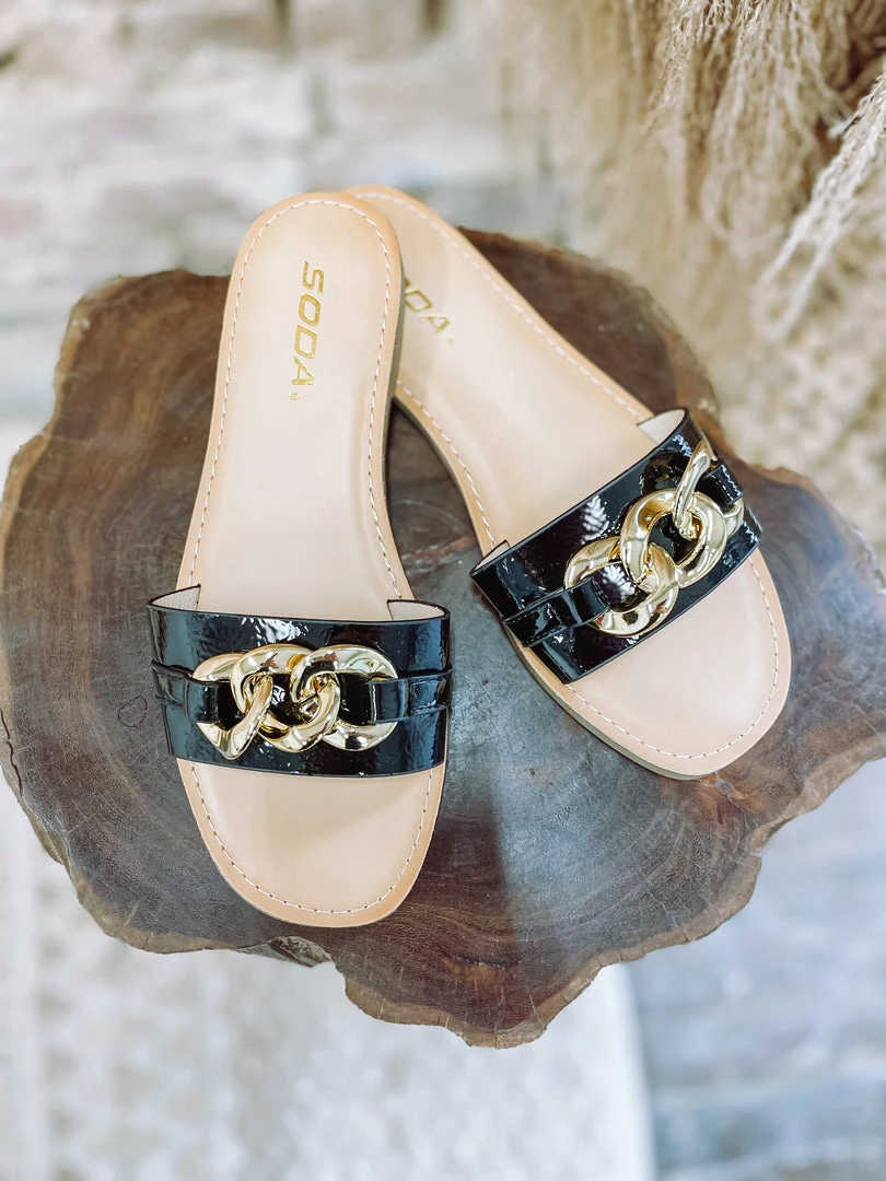 Elegant and summery is what these sandals have to offer!!! With a single strap detail and gold chain element, these will instantly dress up your outfit and keep you comfy!