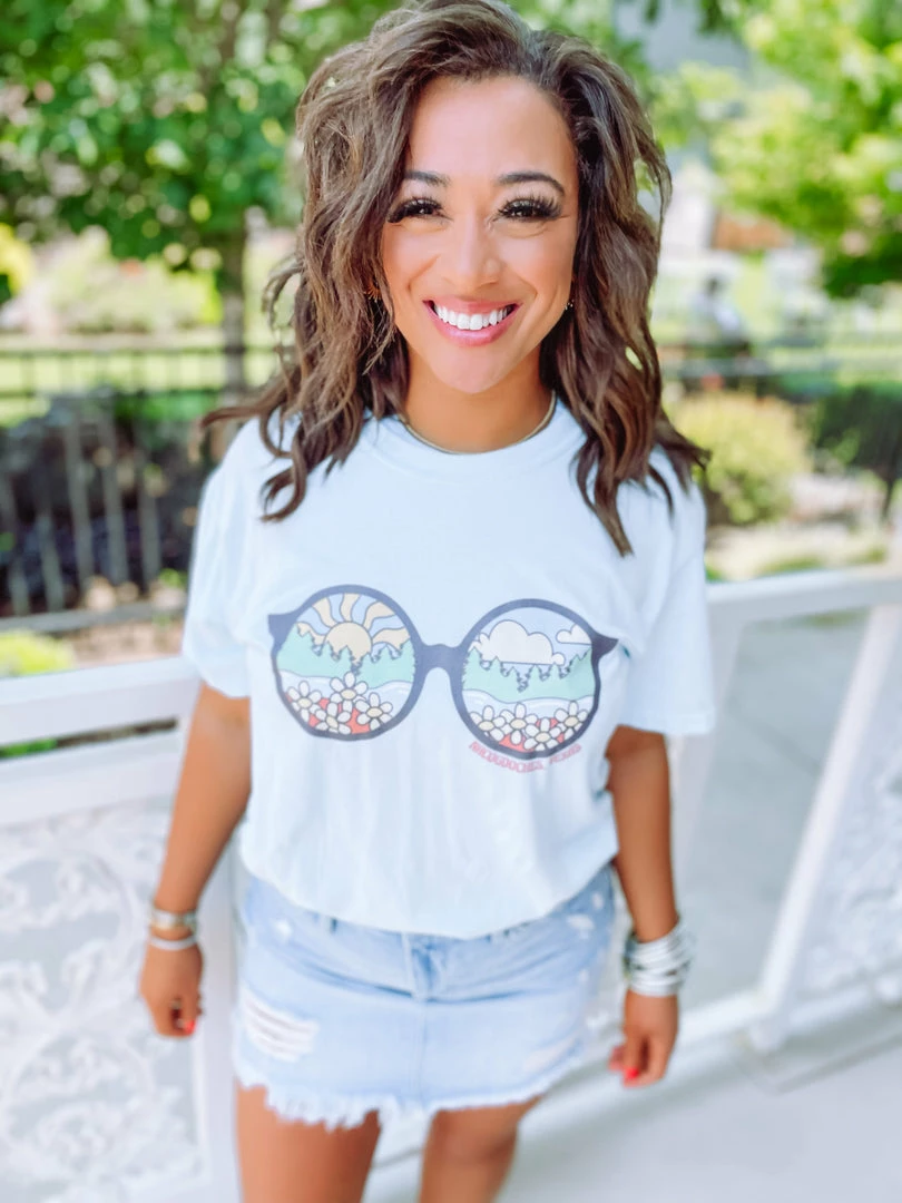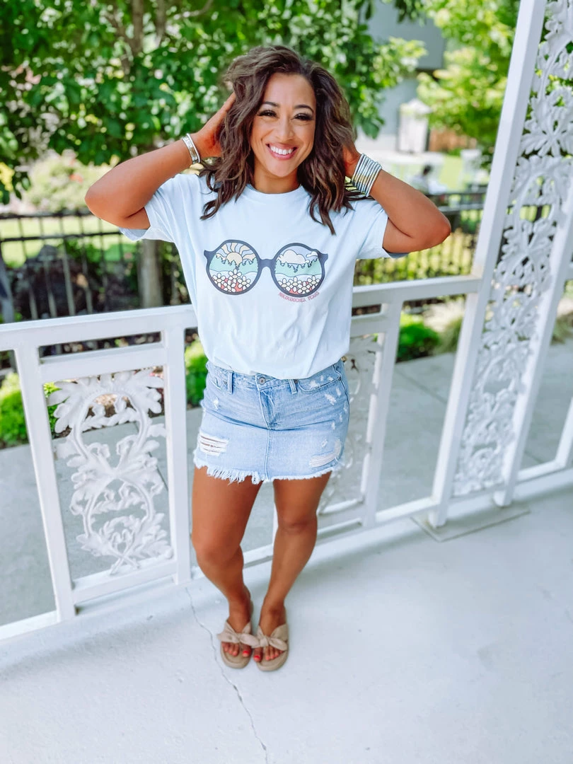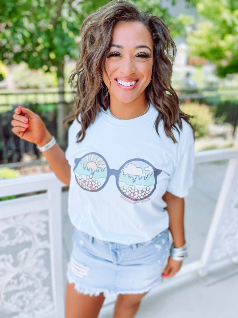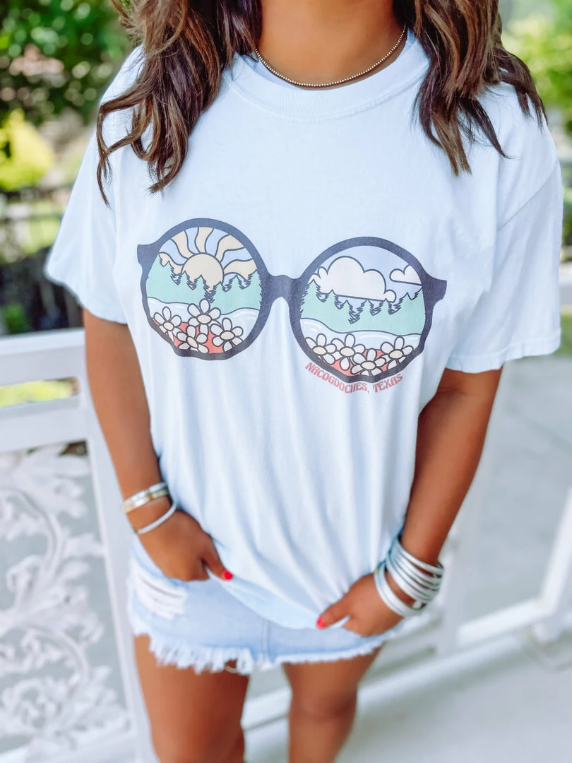 The sun is shining SO bright! Throw on your sunnies and go for a long drive in our newest Nacogdoches tee! A little groovy, a little country, we love it so much! Featured on a Comfort Colors top. Styled with our