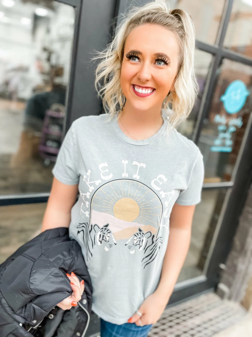 Keep it easy breezy in our Take it Easy Tiger tee! Designed on a grey pigment top with destroyed elements on the neckline and hem! This tee is absolutely a game changer for graphic tee styling! The best gift and treat yourself! Perfectly paired with our Paula Lace Up Boots.