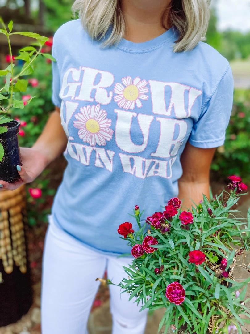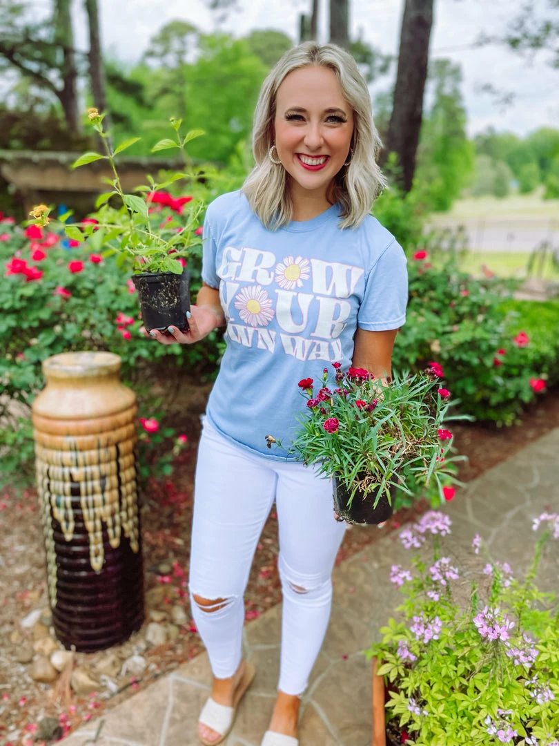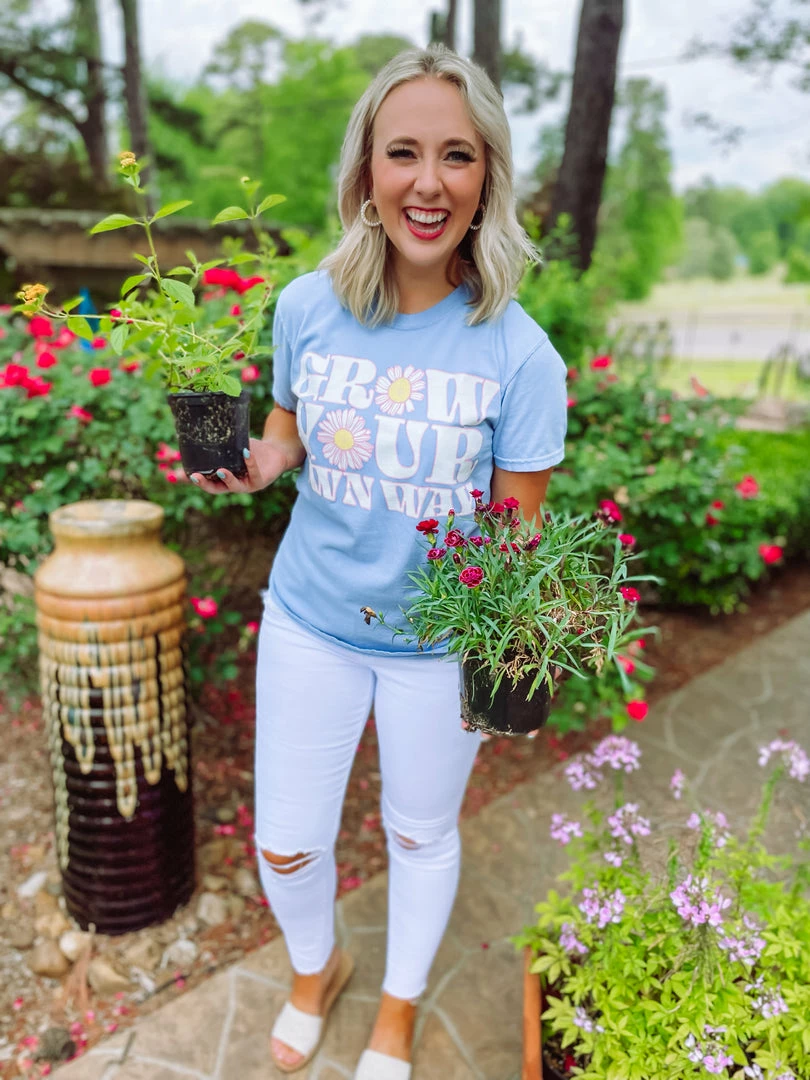 Grow Your Own Way – This graphic tee hits home and is just so cutie! Dress it up ladies ~ we love it styled oversized with bike shorts OR steal Shelby’s Style! Perfectly paired with our Efron Sandals and Charlie White Ankle Skinny Jeans.