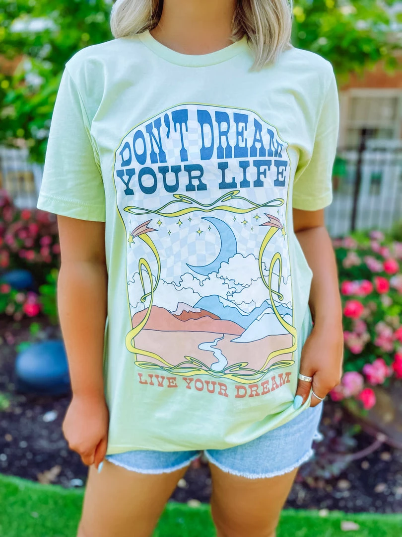 Go, live your dream! Designed on a spring green top is our newest boho design! This tee is absolutely a game changer for graphic tee styling! The best gift and treat yourself! Perfectly paired with our Lucy Basic Cut Off Mid Rise Shorts and Apron Sandals.