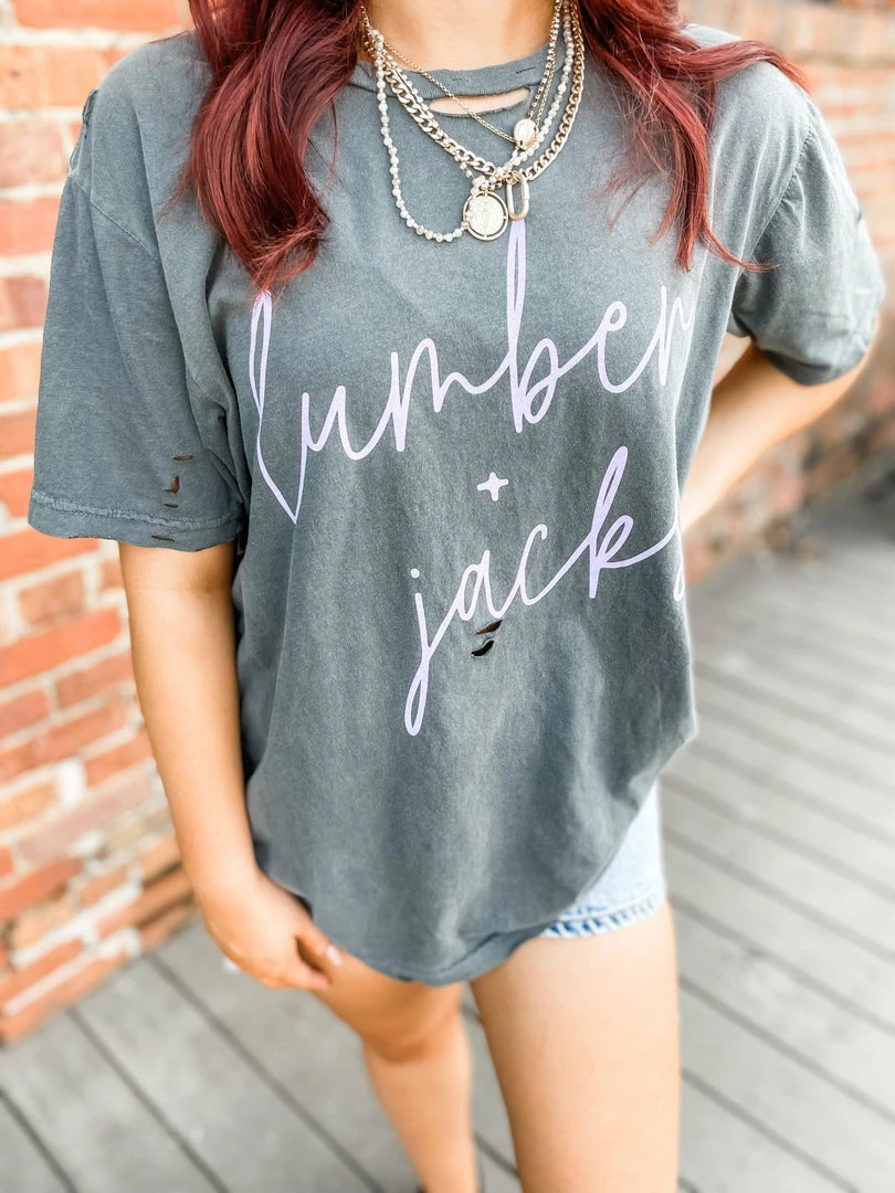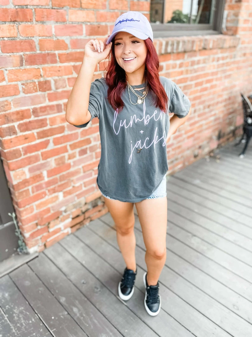 Distressed in all the right places, our Lumber+Jacks Destroyed tee features charcoal grey with a sweet purple design! Edgy with a dash of SFA pride! We love the detailing for a new look! Styled with our Stephen F Austin Script Hat and Brandy Western Denim Shorts.