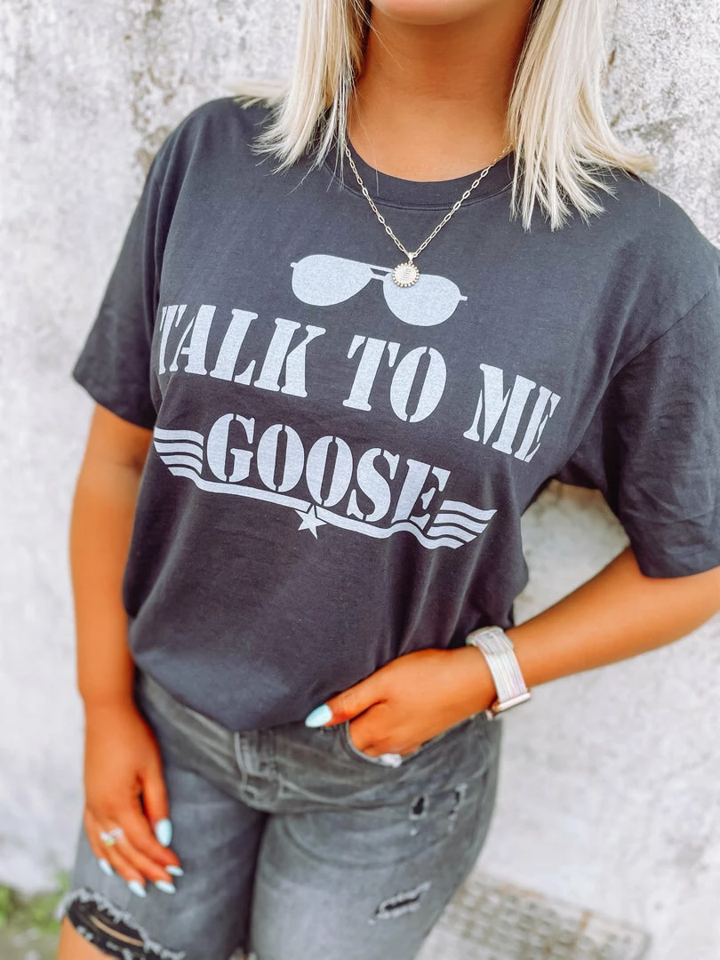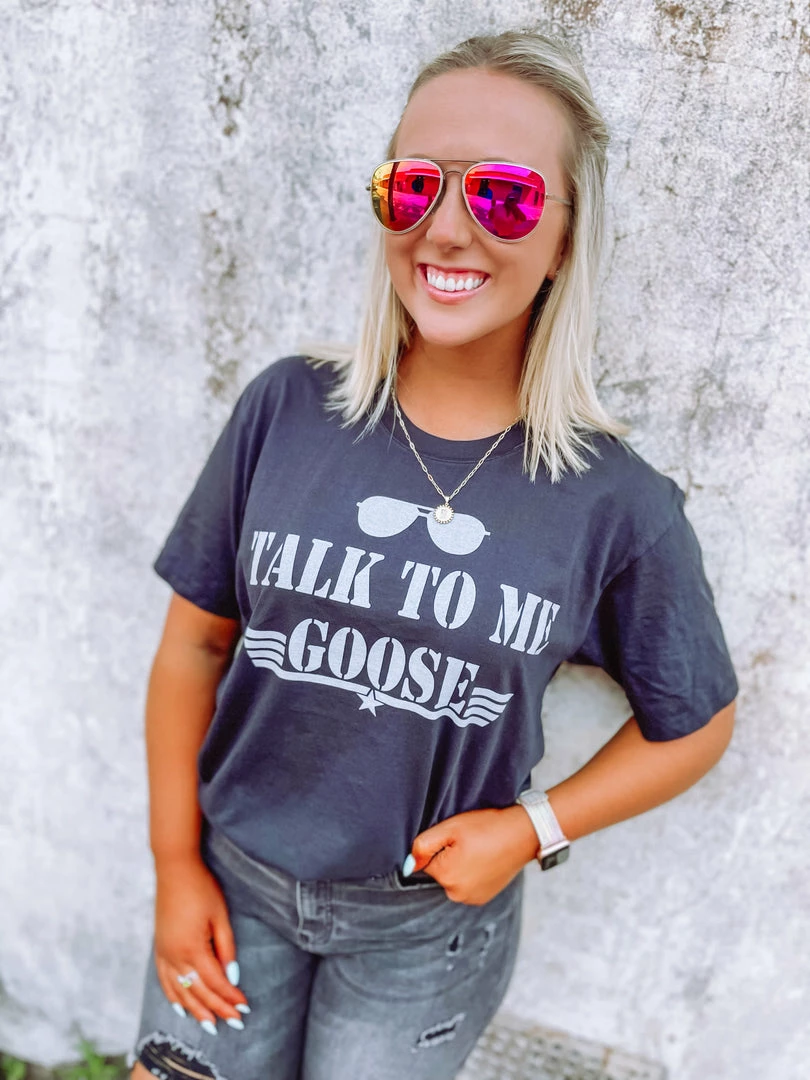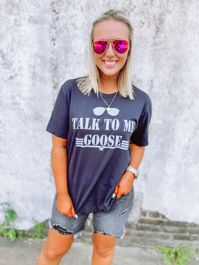 The excitement is real for the next Top Gun Movie! Our Talk To Me Goose tee is featured on a black top with grey design. This tee is absolutely a game changer for graphic tee styling! The best gift and treat yourself!