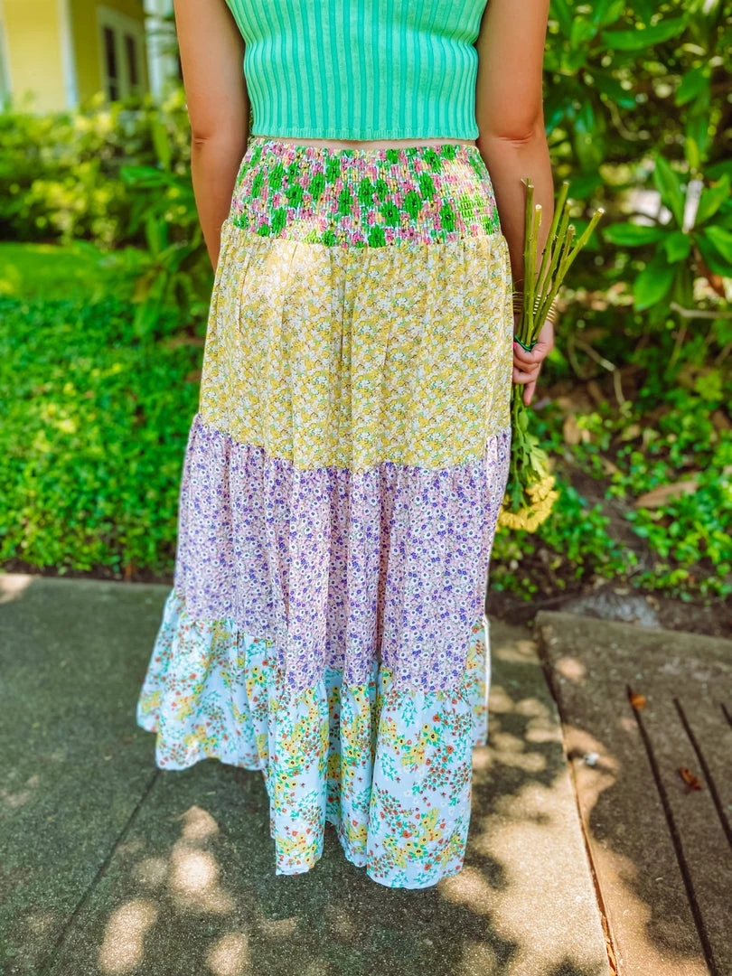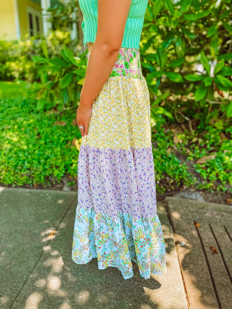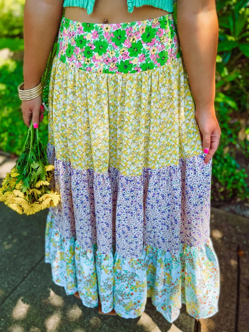 We can’t handle the cuteness with this one! The Pearl Skirt is giving summer style a whole new meaning! Showcasing a high waisted waist band with back smocking detail + floral color blocked design + tiered layout. This sweet, femme piece will brighten your day one fit at a time! Style it like Shelby and add the Tiara Top + Ramsey Sandals + the Faith Earrings.