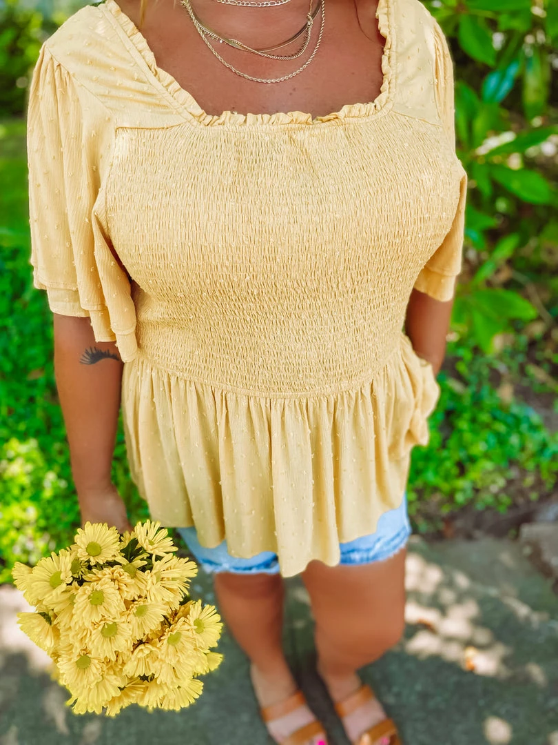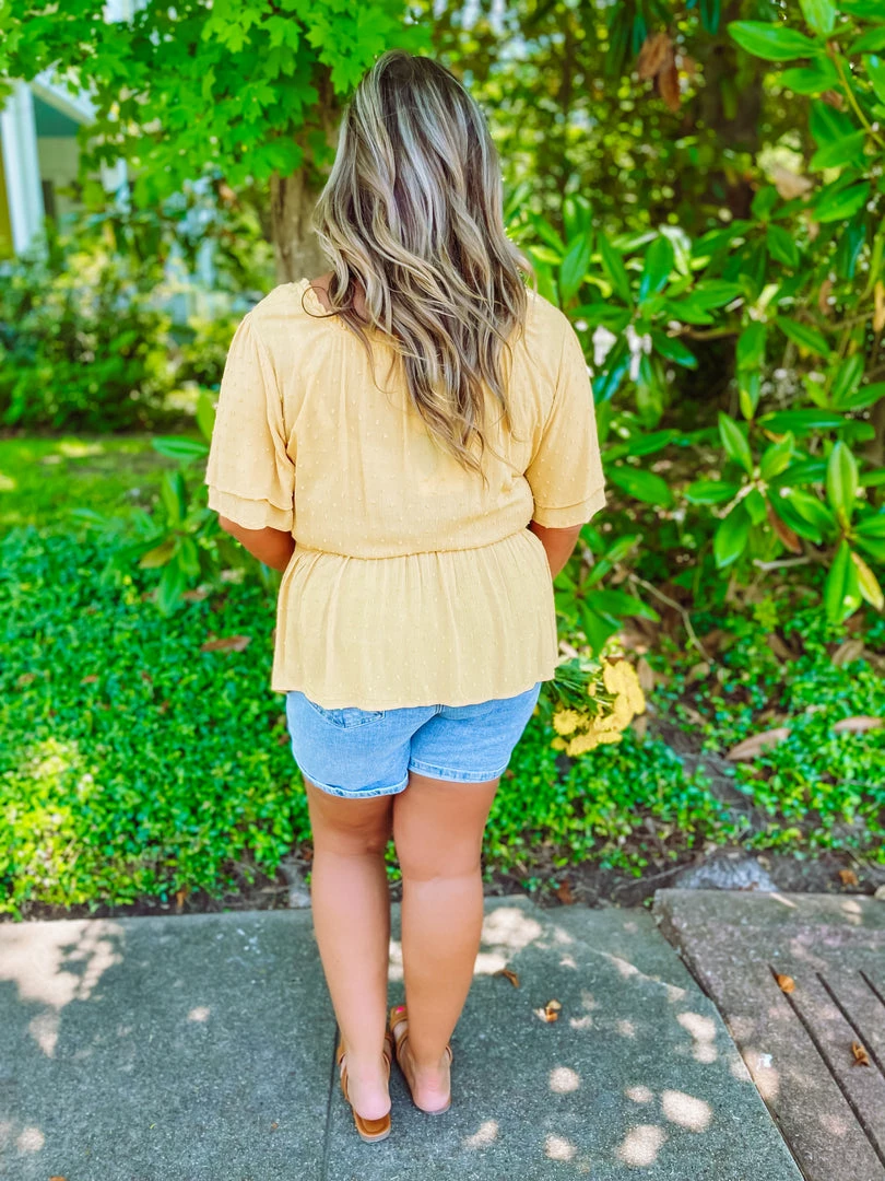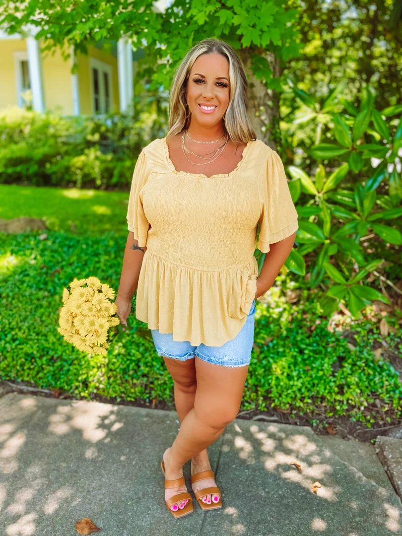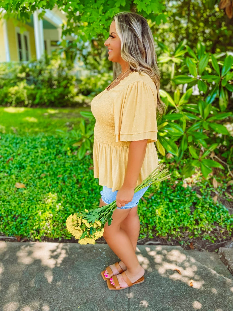A swiss dot daydream is the Brianna Top! Featuring a square neckline with ruffle detail + back smocking design + peplum fit. The swiss dot texture and yellow color are an added bonus! This lil n umber would be perfect for back to school or dressed up for church! Styled with the Vanessa Shorts + Ramsey Sandals + the Mary Gold Everyday Earrings.