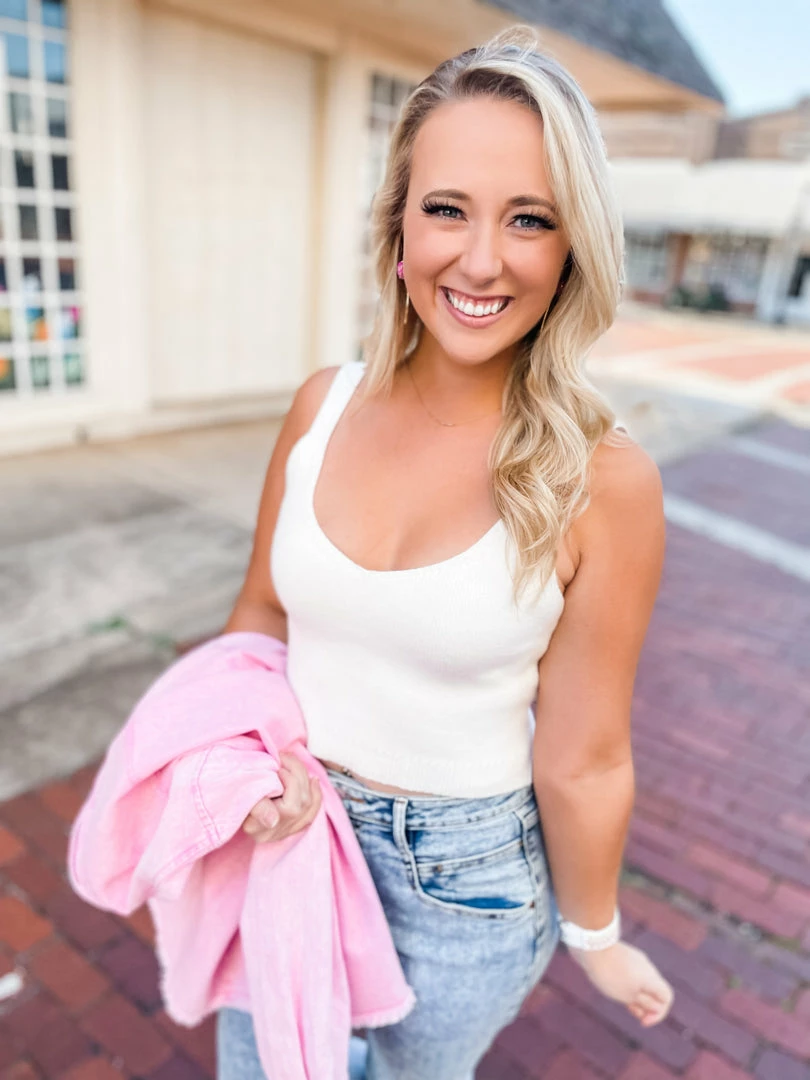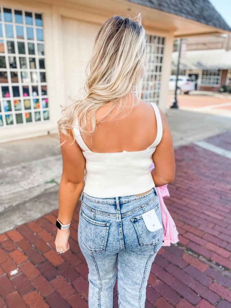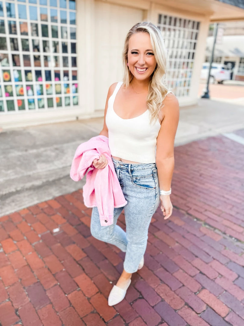 Meet your new BFF! Our Morgan sweater tank is going to be your new favorite, guaranteed! Perfect for layering and transitioning season to season ~ from summer with shorts and sneakers to fall with denim jacket or cardigan and skinnies! We ADORE sweater tanks! This piece is tailored with a v neckline + square banded hem with side slits!.Perfectly paired with our Madalyn Back Seam Mom Jeans, Wren Pink Denim Distressed Button Down Jacket and Stolen Mules.