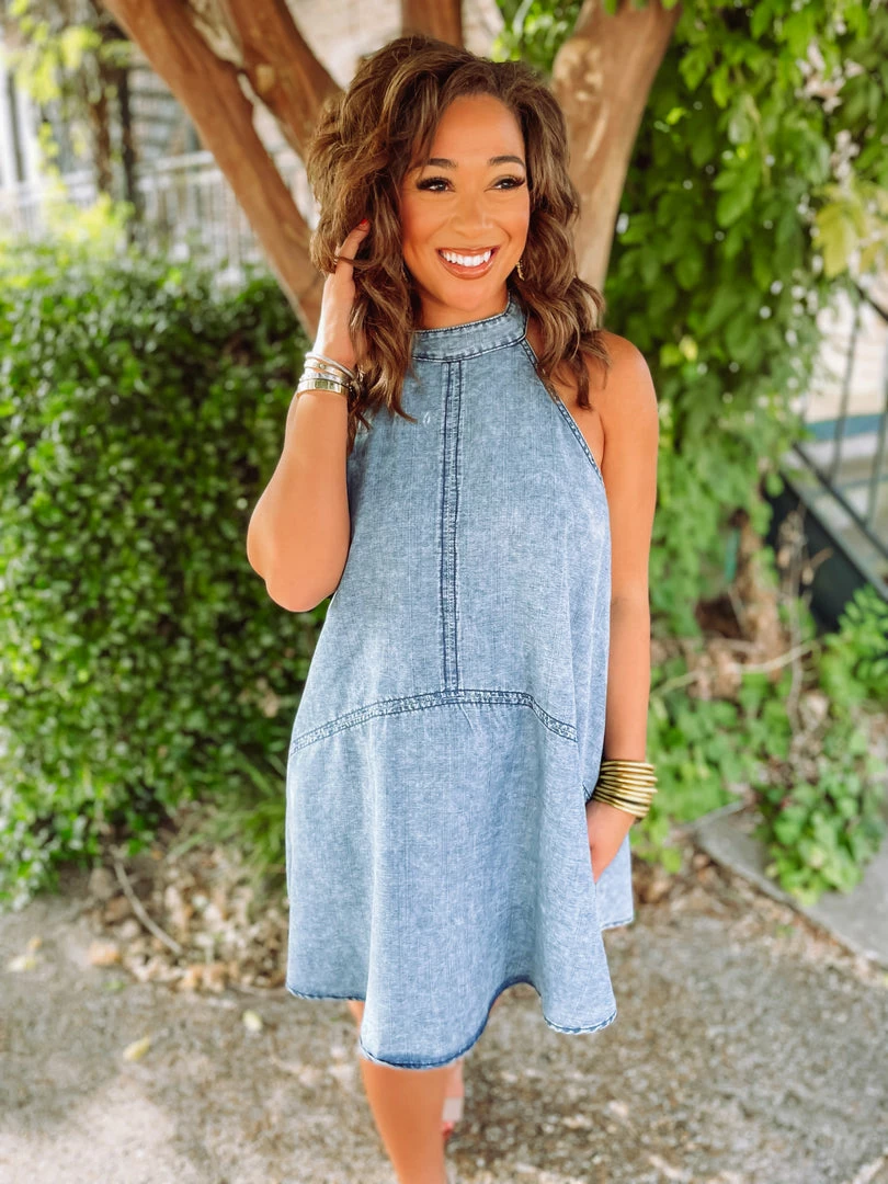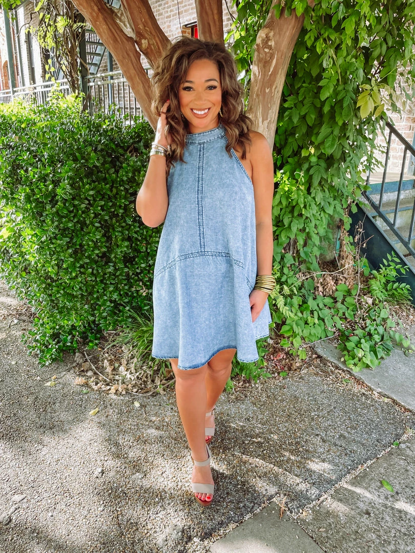 When all else fails WEAR DENIM! Meet the Phoebe Dress! This amazing piece is tailored with a halter neck line with a double hook clasp closure + large key hole detail + open back design. This flirty dress will have you summer ready in no time! Steal Morgan’s style and pair it with the Senna Wedges!