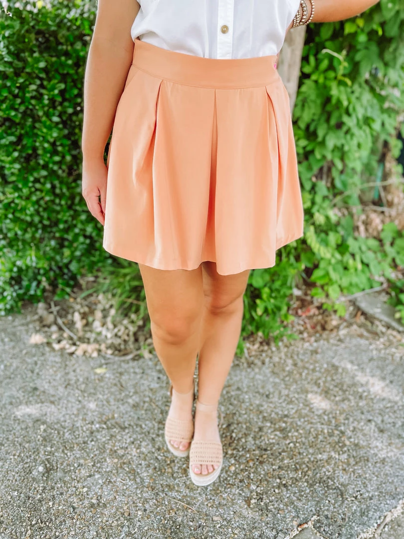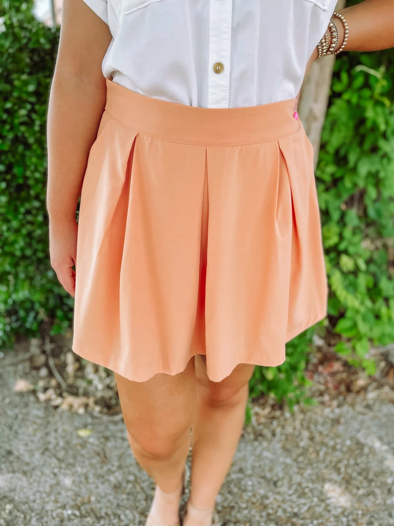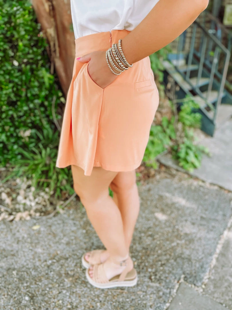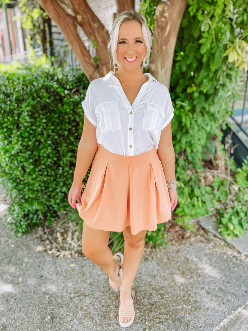 Meet our Eloise Solid Skort! Showing up and Showing off with a high waist band + pleated, flowy body + shorts as the lining! Skorts are for sure the most underrated, beloved closet item! Update your closet with this one now! We love this piece paired with bodysuits and blouses! Style it like Shelby and pair it with the Sydney Button Up Shirt + the Hayden Sandals.