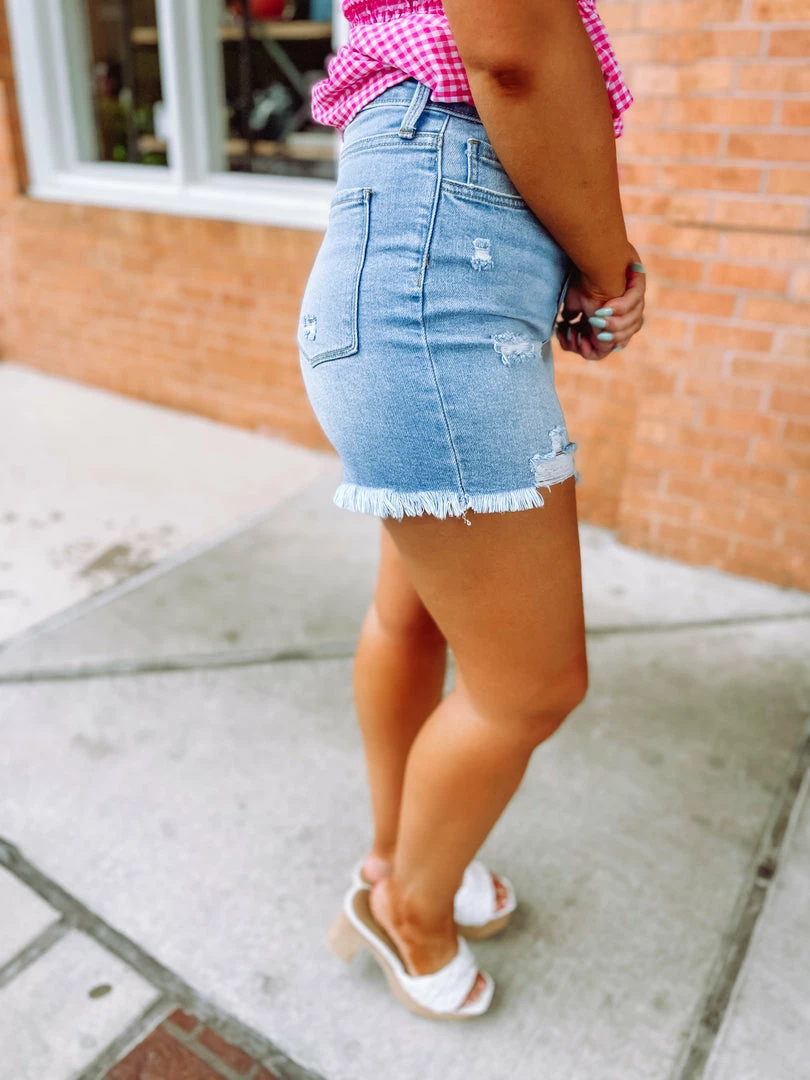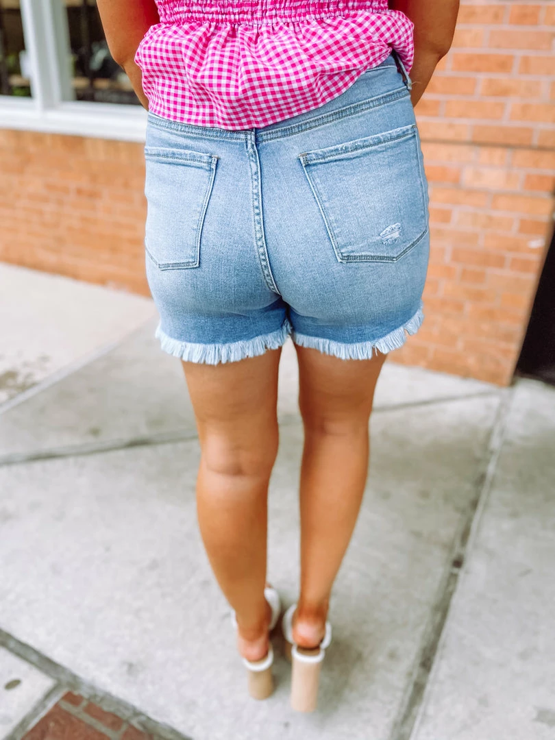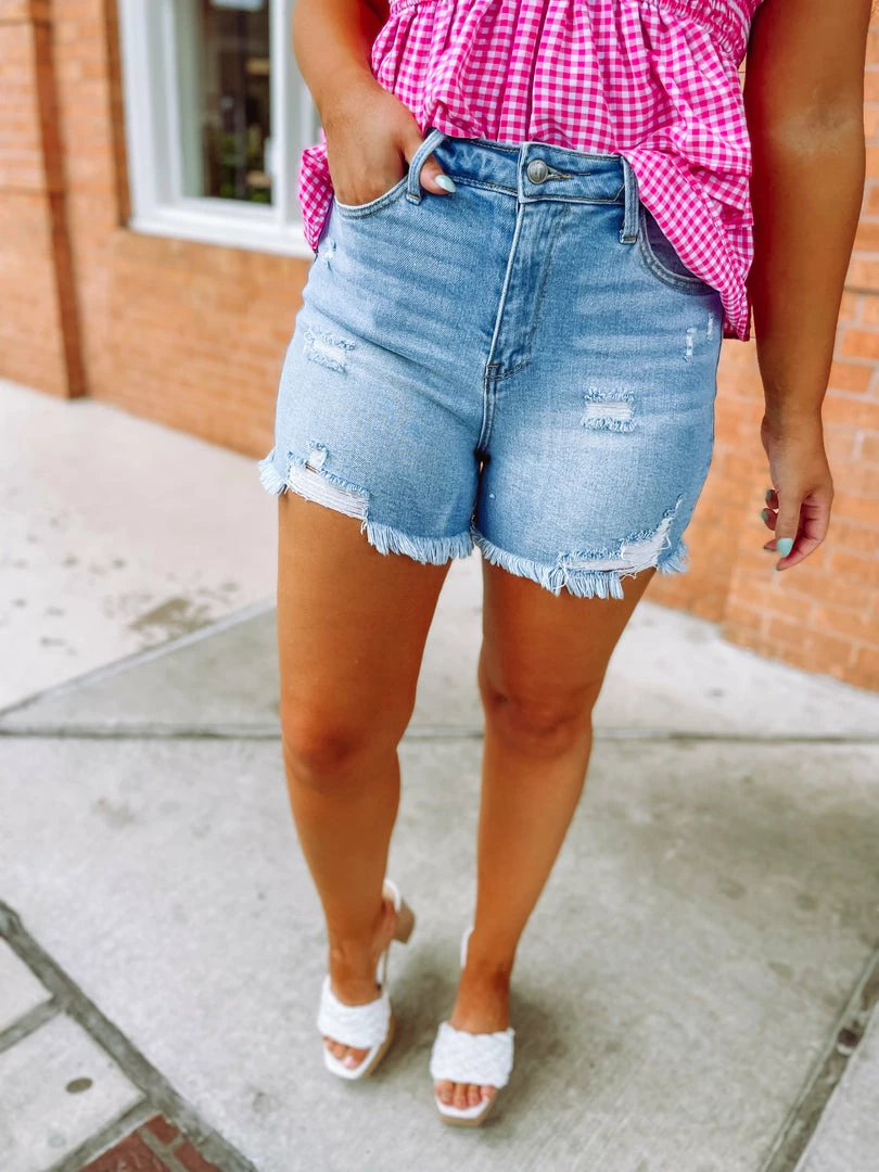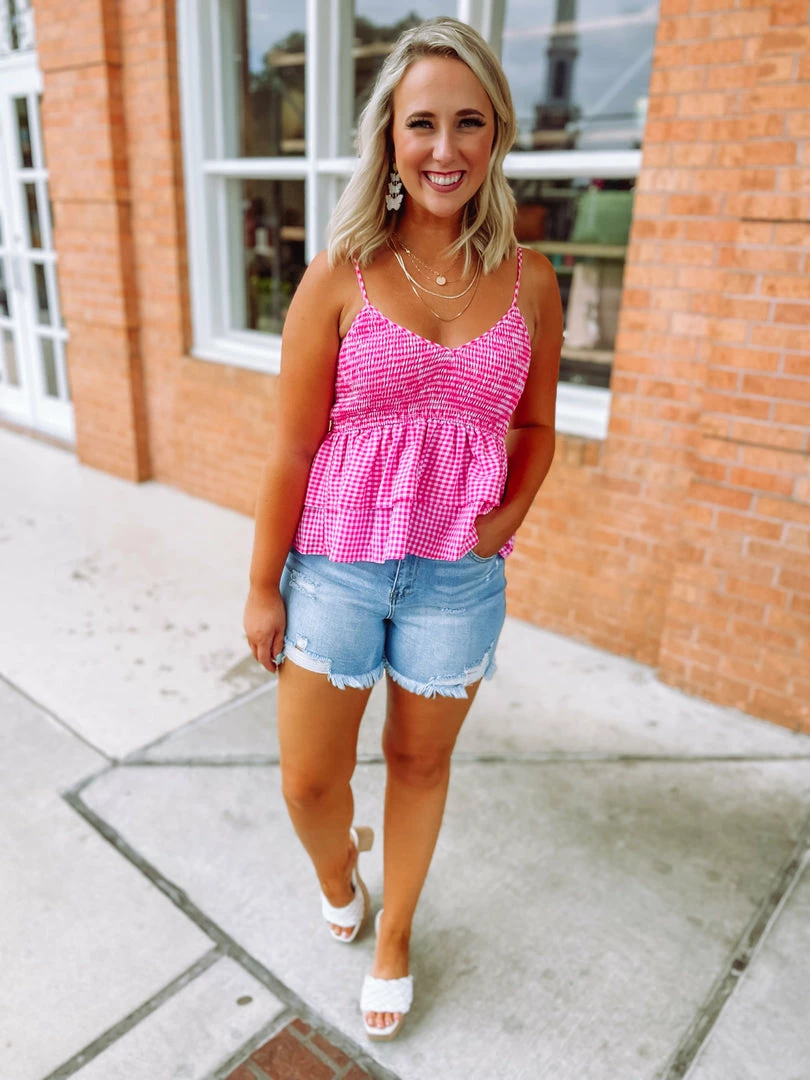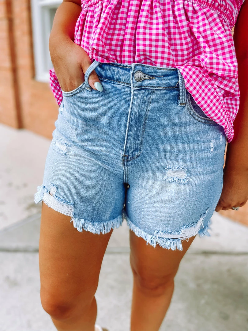 The Marti Shorts we cannot get enough of! Tailored with a high waist + distressing + raw frayed hem + 5 pocket design + button/zipper fly + belt loops. These shorts provide a summer look that we are crushing on big time! Comfy denim is every girls best friend! Styled with the Tessie Chunky wood Heel + the Hanna Gingham Tank Top.