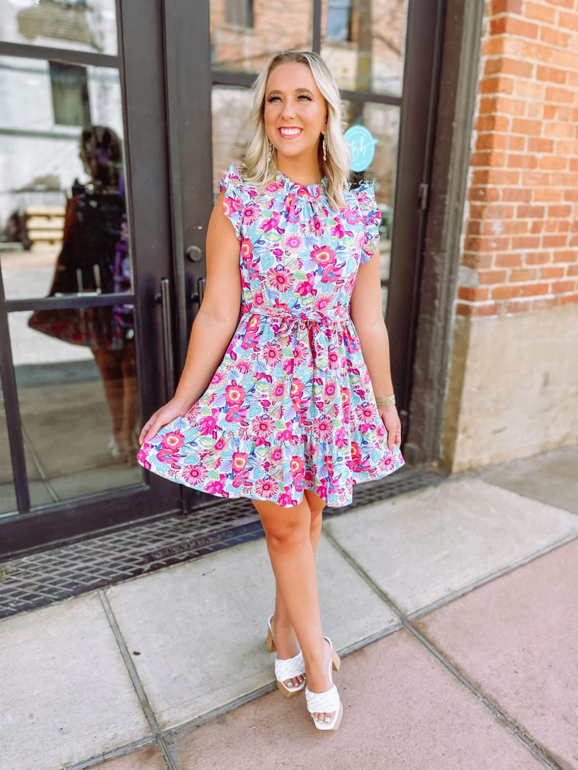 Slay the day in the Chloe Dress! Tailored with a mock neck line + flutter sleeves + removable waist tie + tiered design keyhole with button closure. The bold floral pattern will have the spotlight on you, no doubt! From church to brunch to work this dress has got you covered! Styled with the Tessie Chunky Wood Heel + Shania Earrings!
