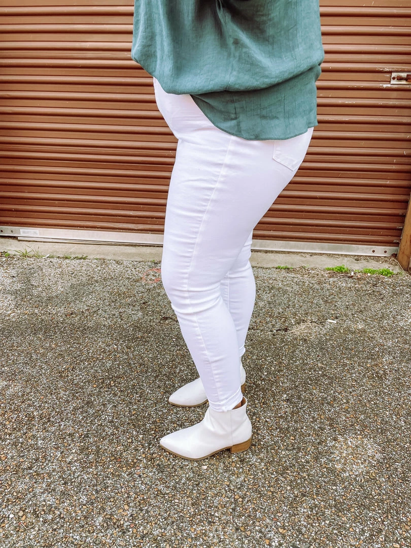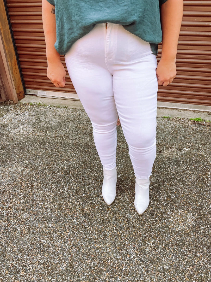 Our Audrey White High Waisted Skinny Jeans are the most flattering and smart jeans yet! Bringing you the classic 5 Pockets & button/zip closure + no distressing skinny leg fit + high rise! Seriously the best crisp white bottoms ever! Styled with our Charlie Booties and Ariel Top.