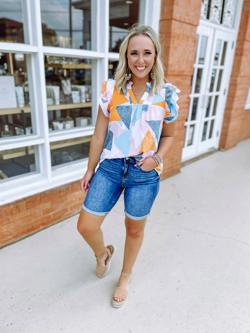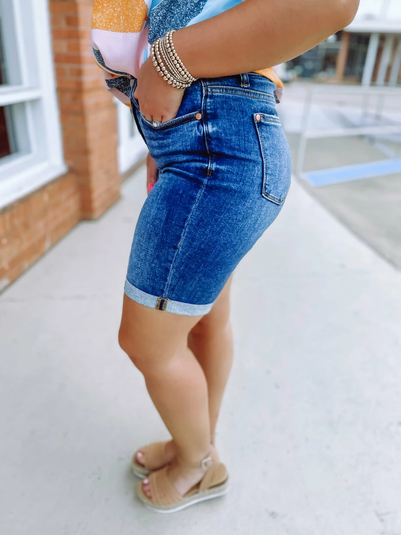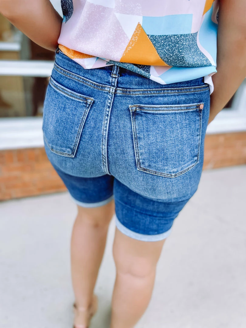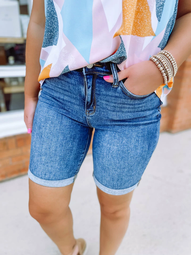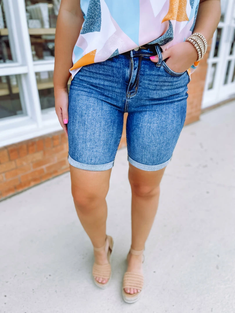 Warmer days are right around the corner! Embrace the heat in our Lindy High Rise Cuffed Bermuda Shorts! Showcasing your traditional 5 pockets + front button/zip closure + belt loops! Finishing with a cuffed hem. These modest comfortable shorts will be your favorite all summer long! Styled with our Maya Sandals + Vienna Geometric Top.