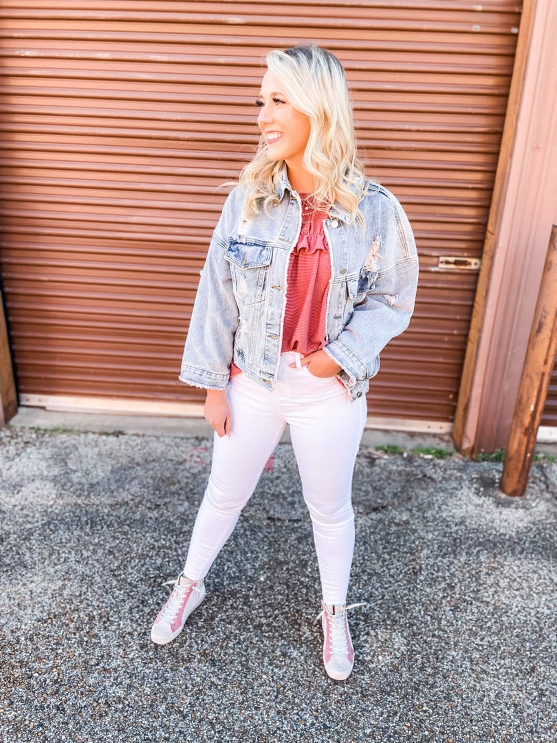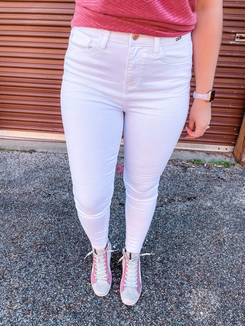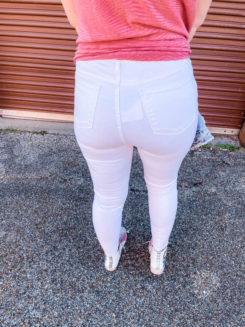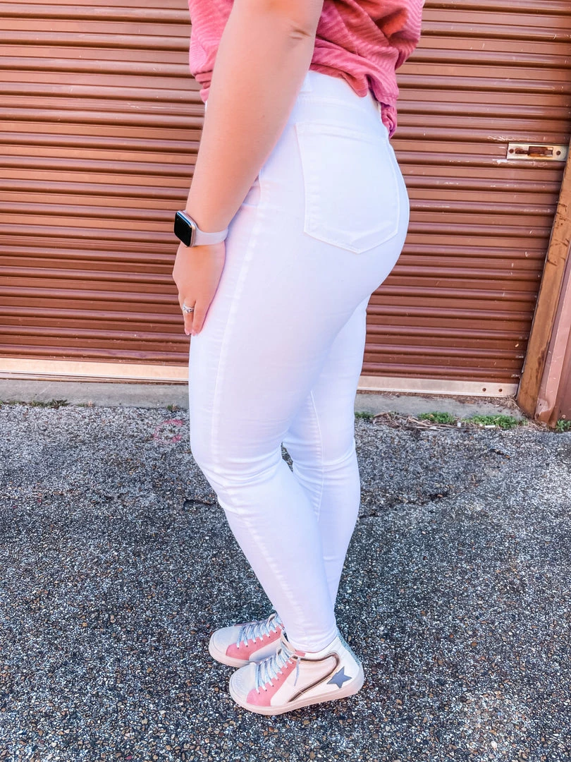 Meet our Tessa Skinnies! Featuring stretchy white denim designed as high waisted with a button/zip fly, five pocket structure and belt loops. Zero distressing completes these must have jeans! Styled with our Roxanne Sneakers and Lydia Top.