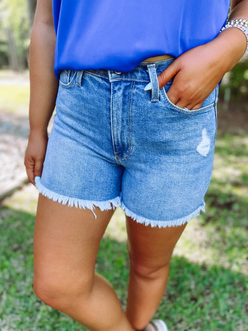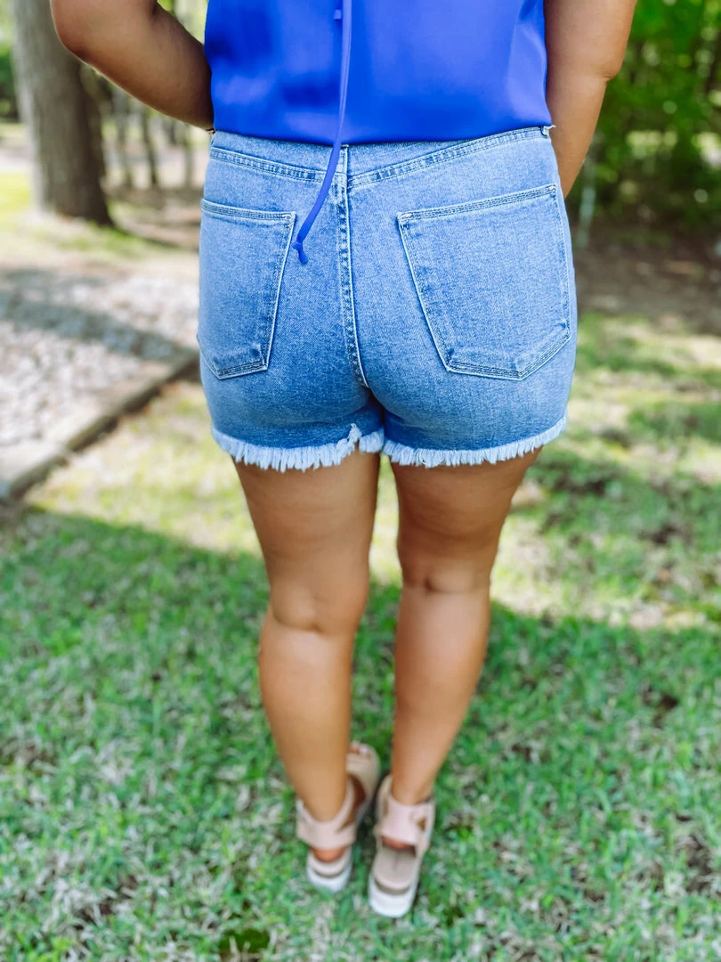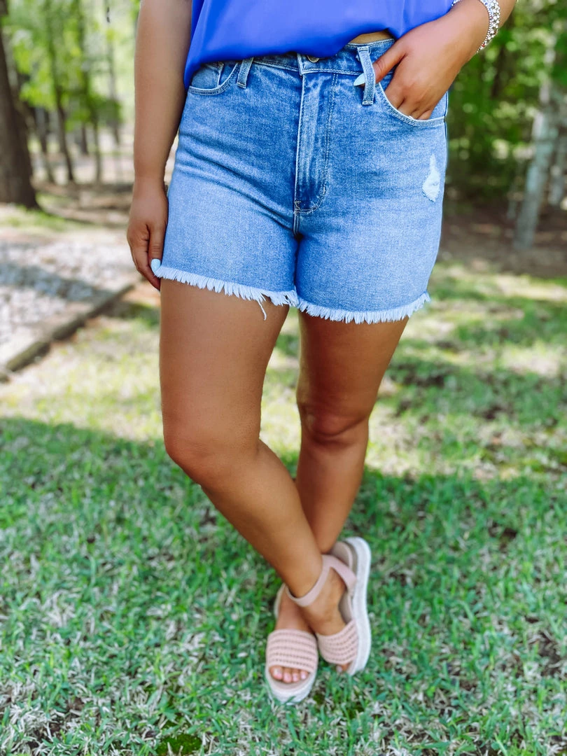 You’ll find great summer style in our Bella Shorts! Showcasing frayed raw cut hem + 5 pocket design with zip/button fly + belt loops + high waisted + zero distressing! These shorts provide an edgier summer look that we are crushing on big time! Styled with our Hayden Sandals and Whitley Ruffle Mock Neck Tie Back Top.