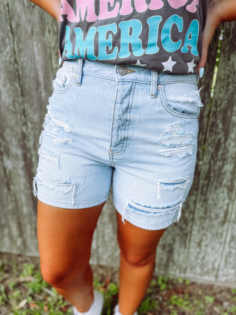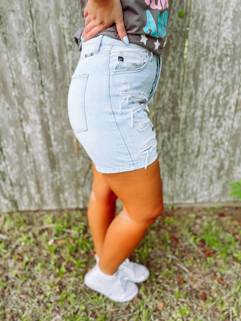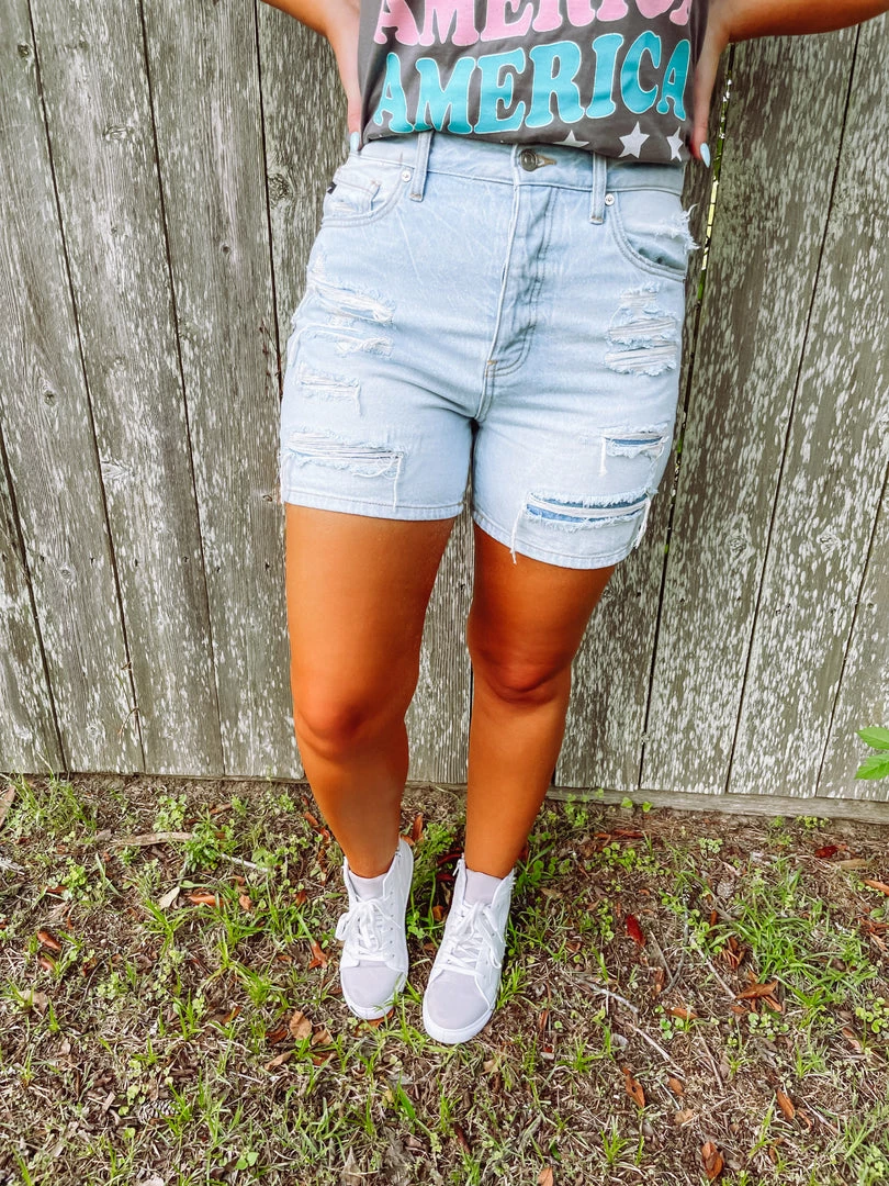 Denim for days! Our Daphne Shorts are tailored as mid rise with your classic 5 pockets, belt loops and hidden button fly! A solid hem with distressing elements throughout complete these no – stretch shorts! Light wash shorts with edgy details, need we say more?! **Adds to cart**