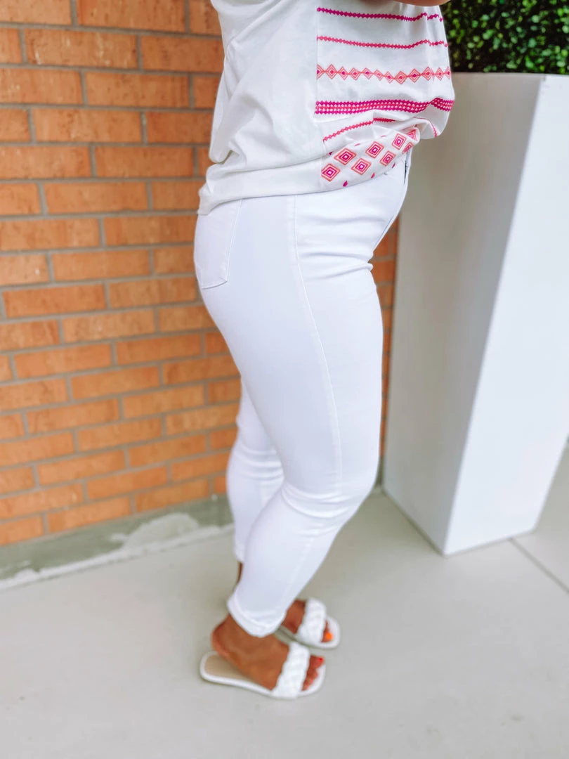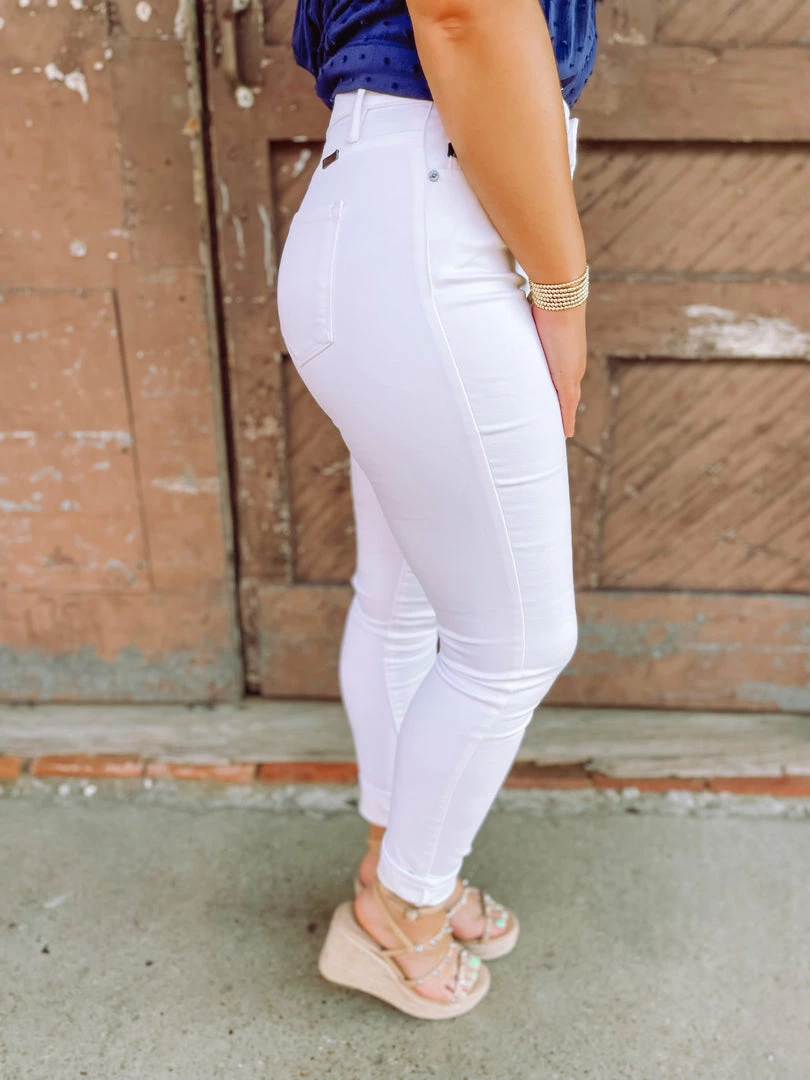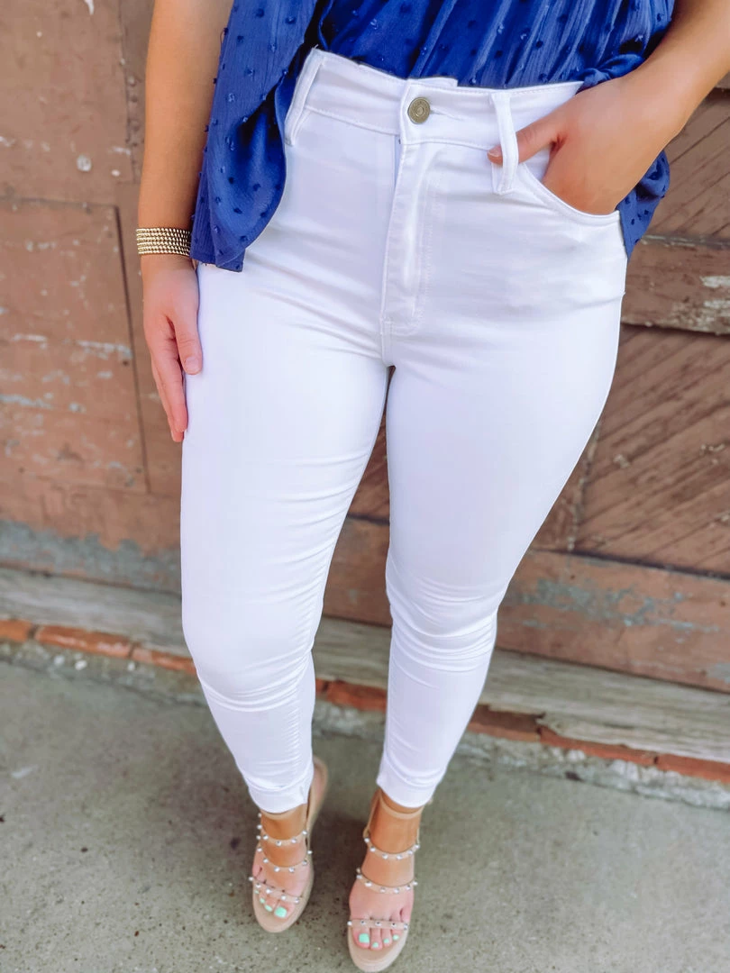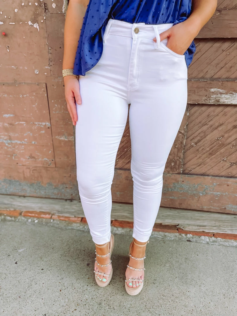 Meet our Payton Super Skinnies! Featuring stretchy white denim designed as high waisted with a button/zip fly + five pocket structure + belt loops. Zero distressing completes these must have jeans! Styled with our Serena Top + Ball Twist Sandals.